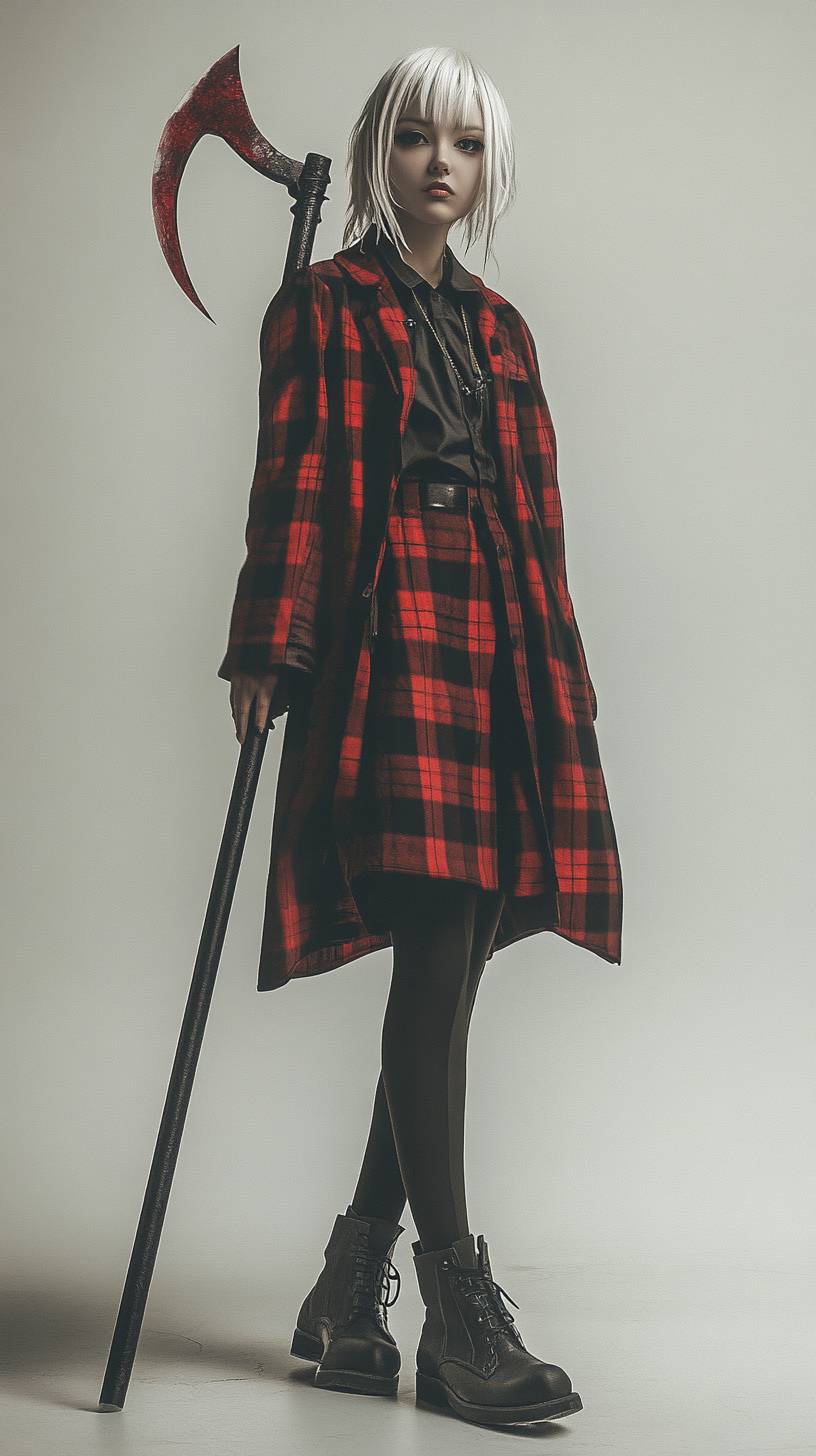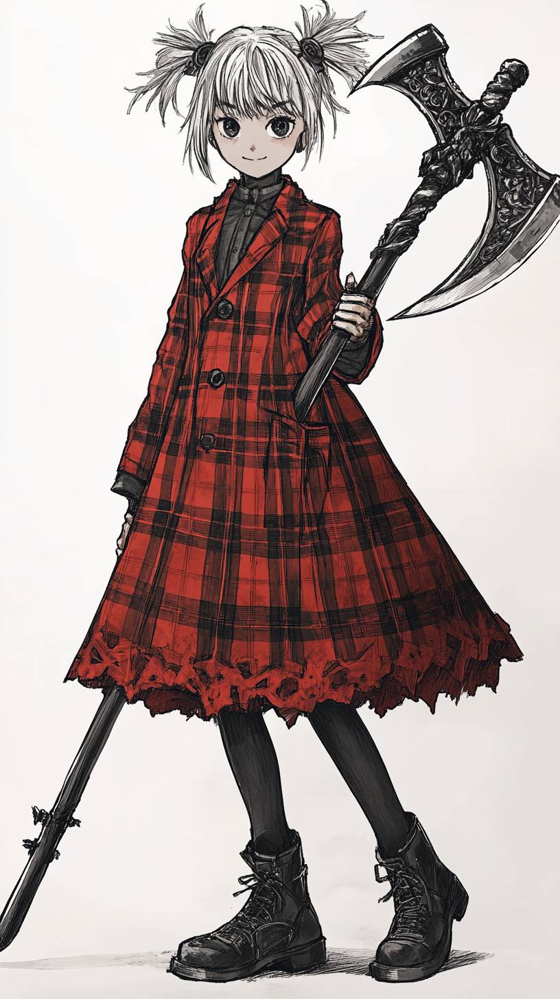 Maka Albarn (Soul Eater), academic modern, plaid coat, dress shoes, scythe accessory