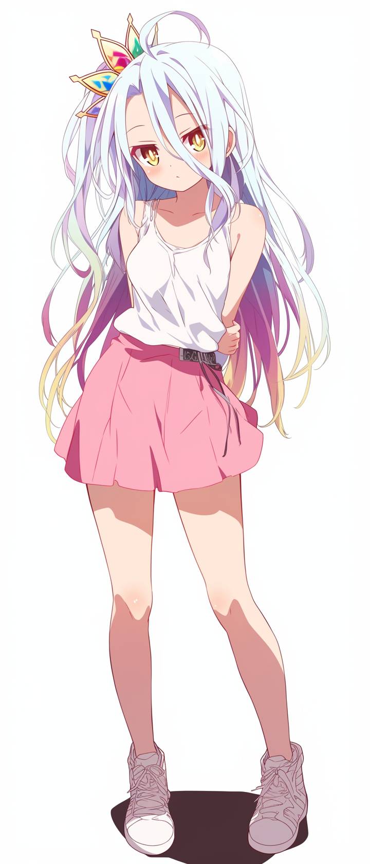 Shiro from No Game No Life in a white tank top and pink skirt, showcasing a cute and playful spring look with bright colors and comfy sneakers.