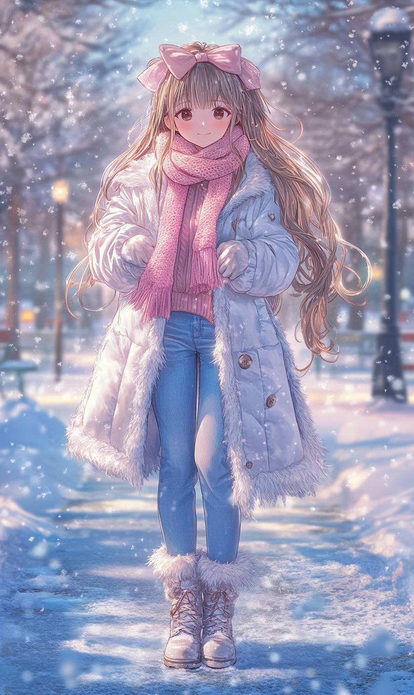 A sweet anime girl with long hair adorned with a bow, clad in a fluffy white coat, pink knit scarf, light blue jeans, and fur-lined boots, cozy winter hues, gentle snowfall, intricate snowy park with a frozen pond, ultra-detailed 4k render, anime art style, heartwarming vibe.