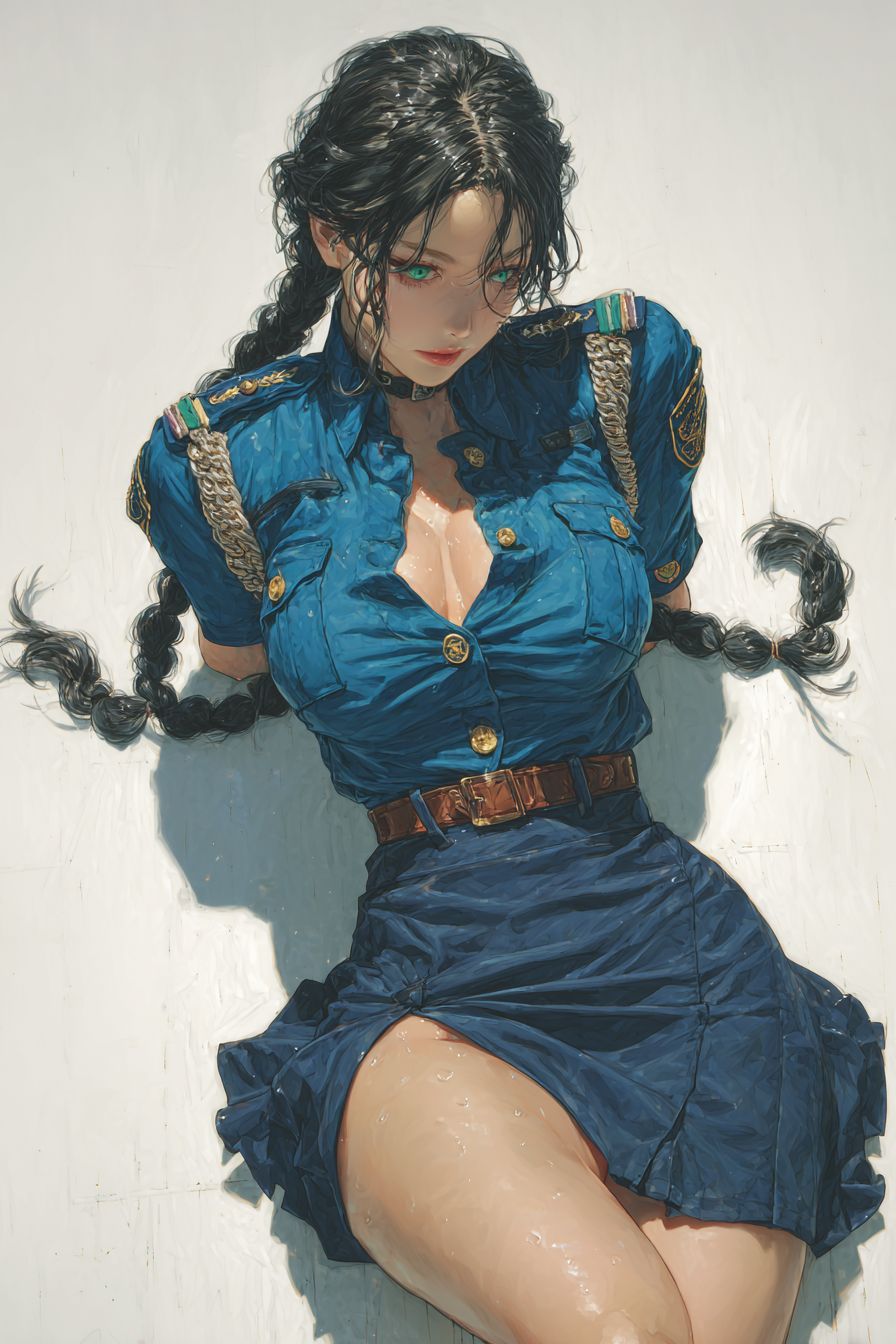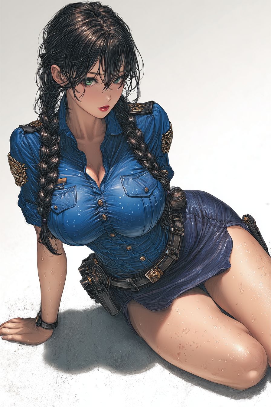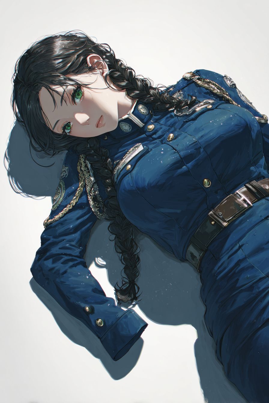 A highly detailed anime-style female character lying on the floor in a semi-dramatic pose, wearing a tight-fitting blue police uniform shirt with brass buttons, decorative shoulder cords and badges, and a navy blue high-waisted pencil skirt with visible fabric tension and high slit, long braided black hair, green eyes, looking sideways, subtle sweat glisten on skin, dynamic lighting from above casting strong shadows, white background, ultra-clean cel shading, high resolution illustration, Japanese anime art style.