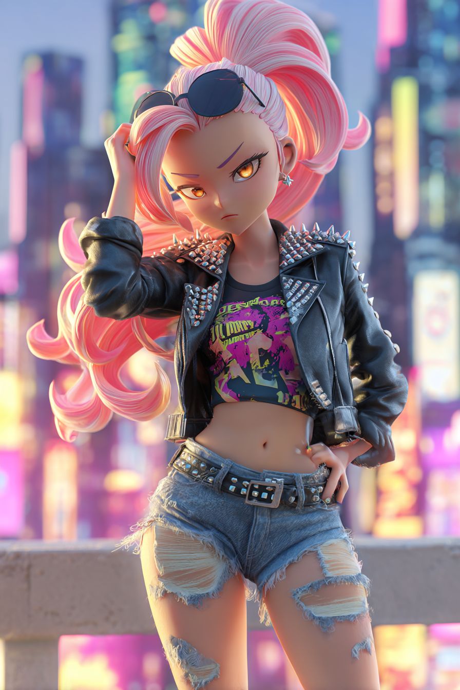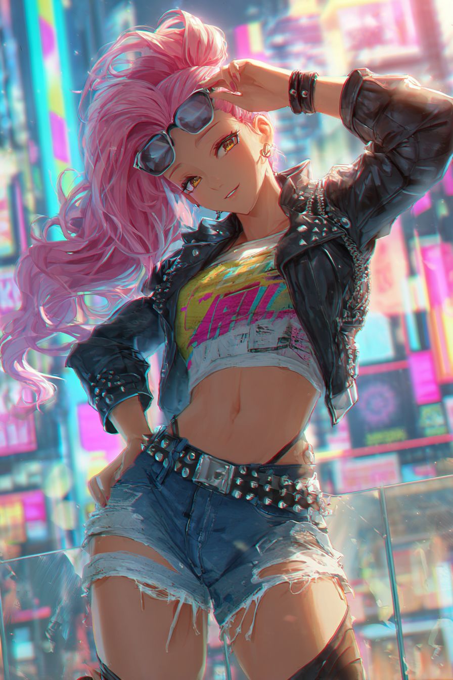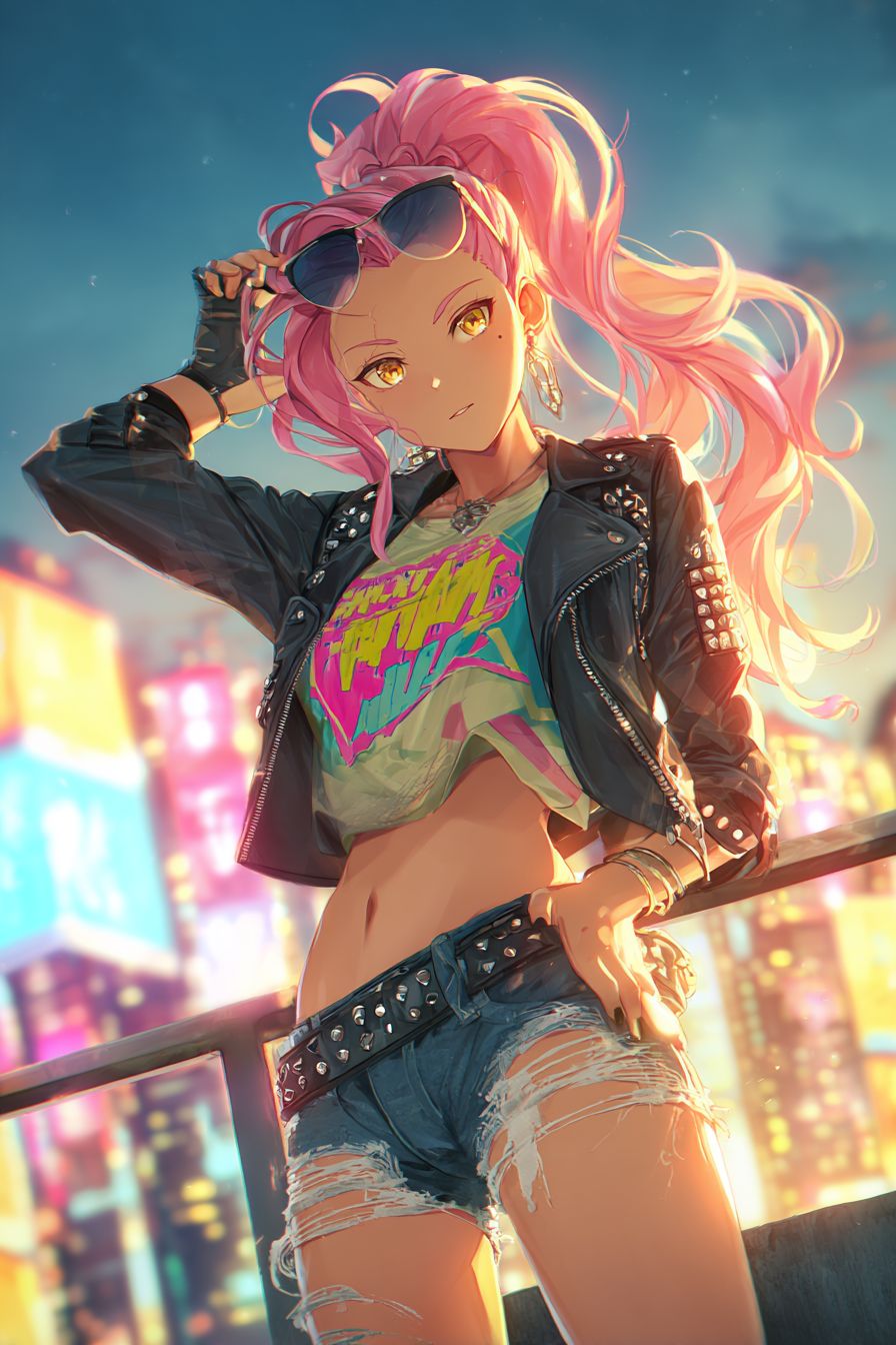 A highly detailed anime-style female character standing confidently in an urban rooftop setting, wearing a cropped black leather jacket with silver studs, a fitted graphic tee with bold neon designs, and high-waisted ripped denim shorts with a studded belt. She has long, wavy pink hair tied in a high ponytail, amber eyes with a playful smirk, and a subtle ear piercing. The pose is dynamic, with one hand on her hip and the other adjusting her sunglasses. The background features a cityscape at dusk with vibrant neon lights, dynamic lighting casting soft glows and sharp shadows. Ultra-clean cel shading, high-resolution Japanese anime art style, vivid colors, and intricate details.