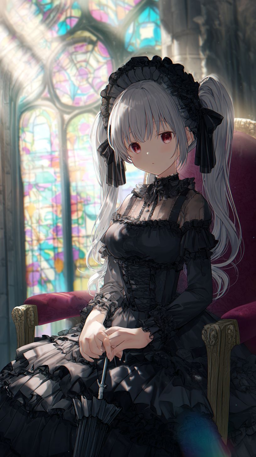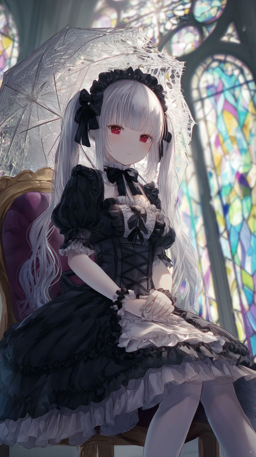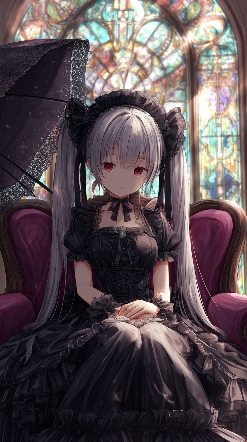 A delicate anime-style female character sitting gracefully on an ornate velvet chair, wearing an elaborate gothic lolita dress with black lace trim, a corset-style bodice, and a voluminous skirt with ruffled petticoats. She has long, silver hair styled in twin tails adorned with black ribbons, and striking red eyes with a serene yet mysterious expression. Her hands rest gently on her lap, holding a lace parasol. Soft moonlight filters through a stained-glass window, casting colorful patterns across her dress. The atmosphere is refined and ethereal, with intricate linework, soft cel shading, and glowing highlights.