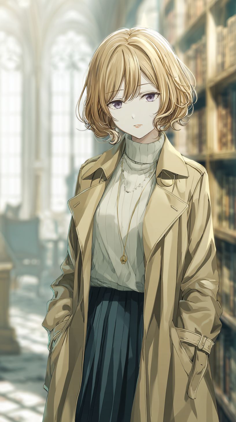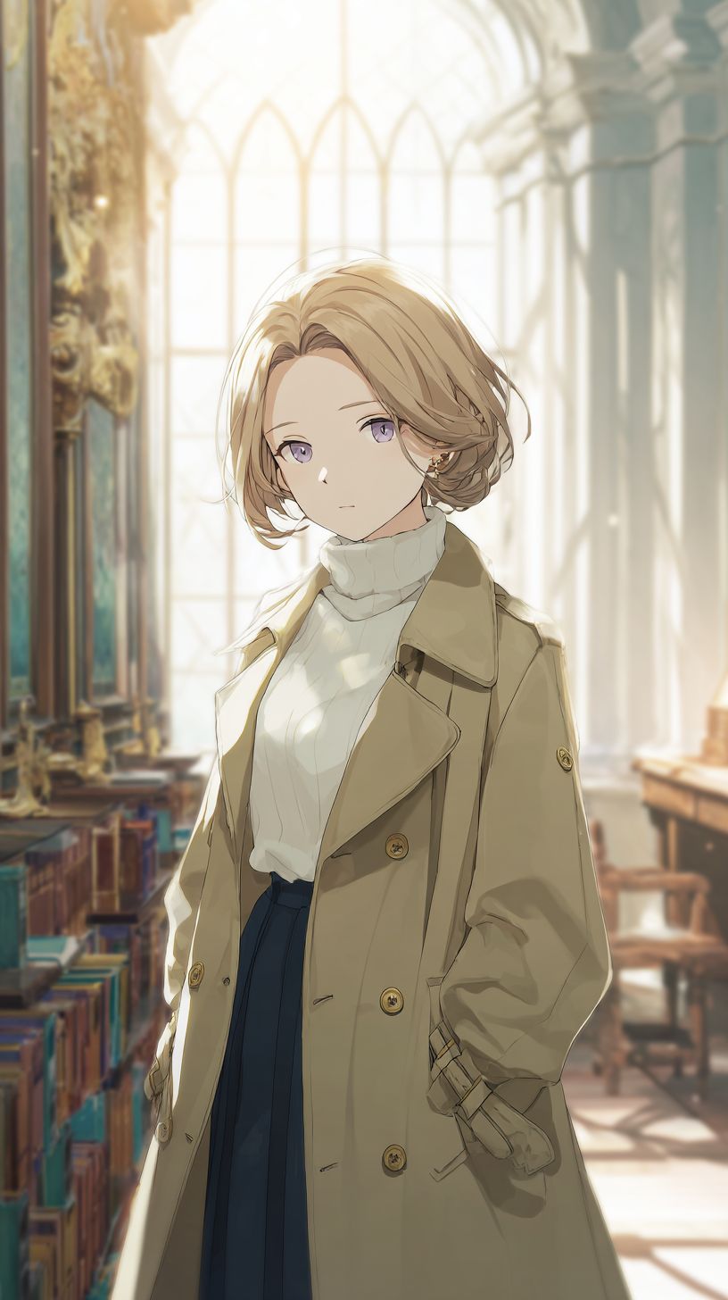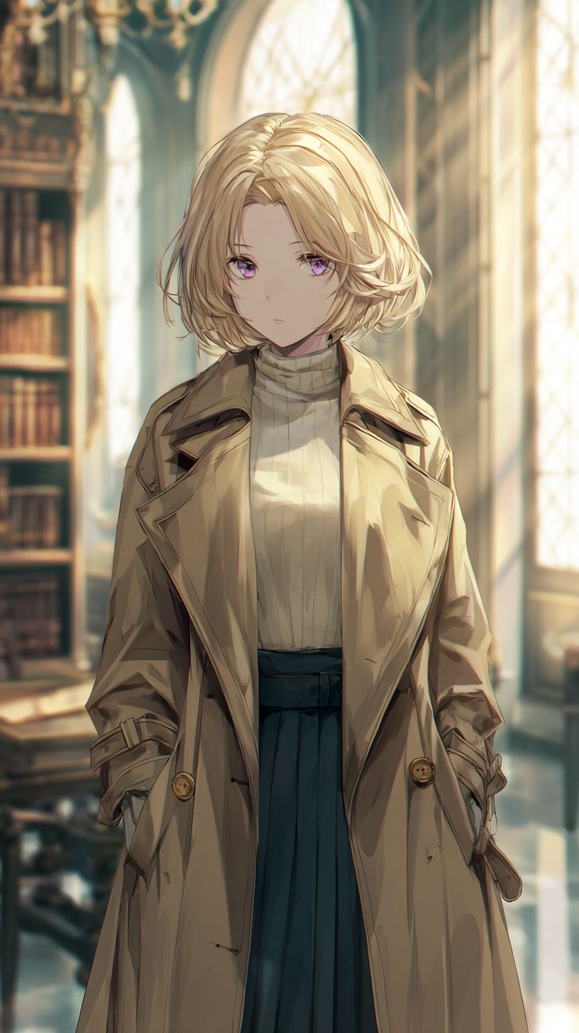 A refined anime-style female character standing in a library, wearing a tailored beige trench coat over a cream turtleneck and pleated navy skirt. Her ash blonde bob is neatly tucked behind her ears, with sharp violet eyes and a calm expression. Soft light streams through tall windows, highlighting delicate linework.