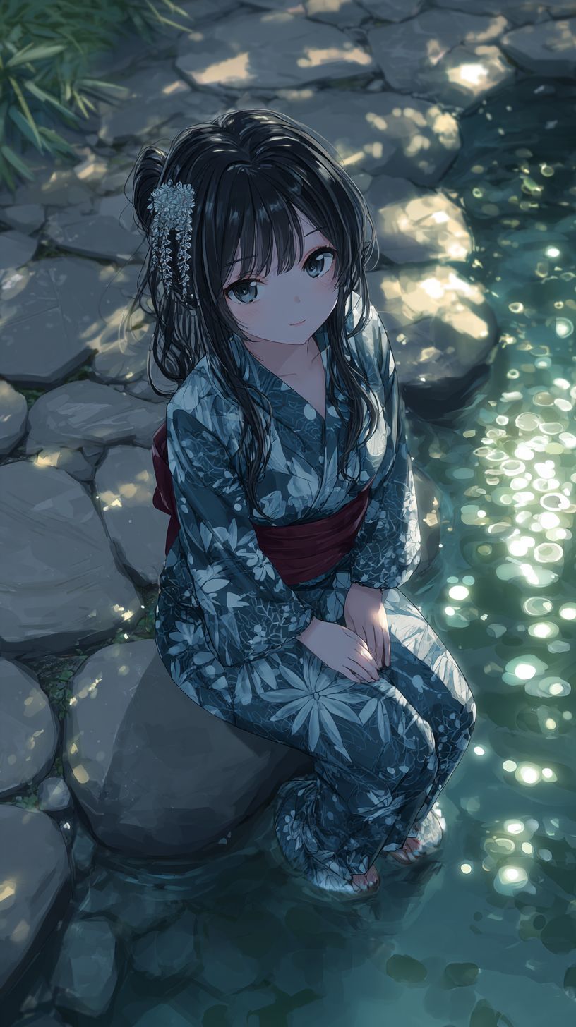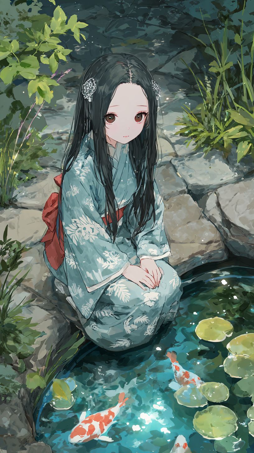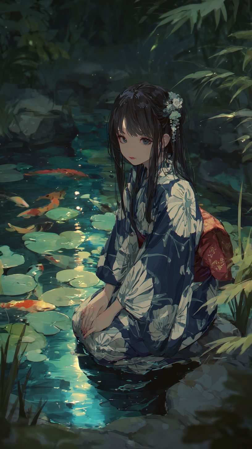 A serene anime-style female character is sitting by a koi pond, wearing a traditional indigo kimono with white crane patterns and a red obi sash. Her long black hair is adorned with a silver hairpin, and she has soft brown eyes. Moonlight reflects on the water, creating a tranquil mood with soft cel shading.