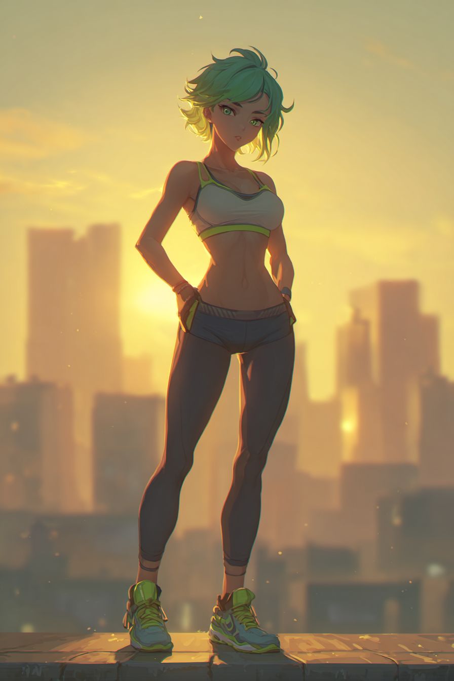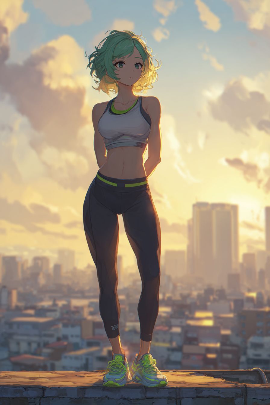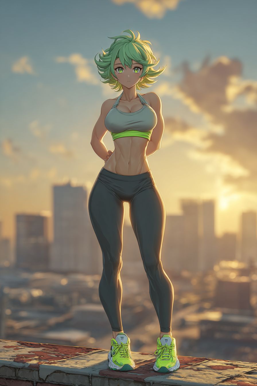 A confident anime-style female character stands on a rooftop, wearing a sporty tank top, high-waisted athletic leggings, and neon running shoes. Her short, tousled green hair and hazel eyes shine with determination. The city skyline at sunrise, dynamic lighting, and crisp cel shading.