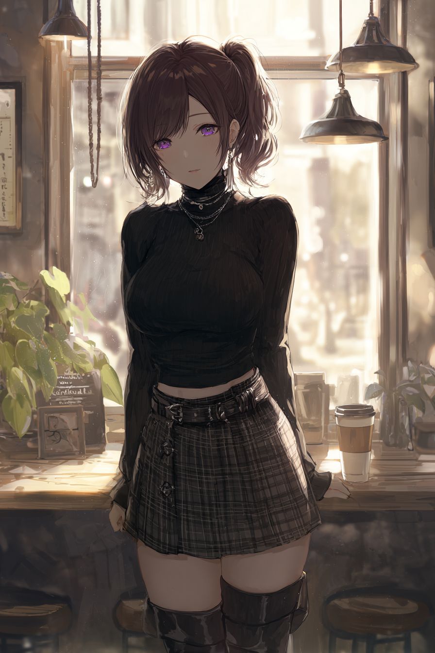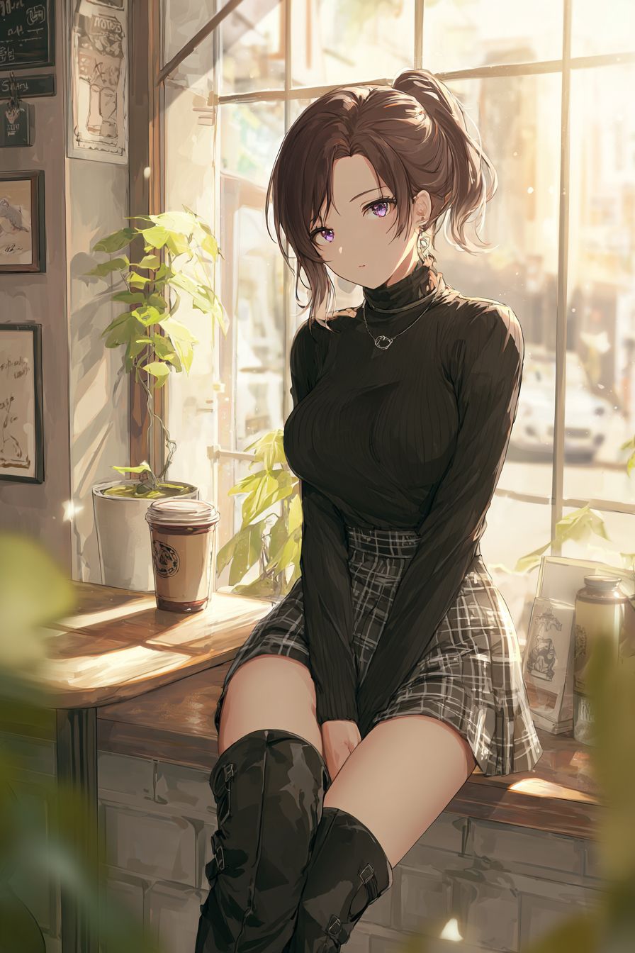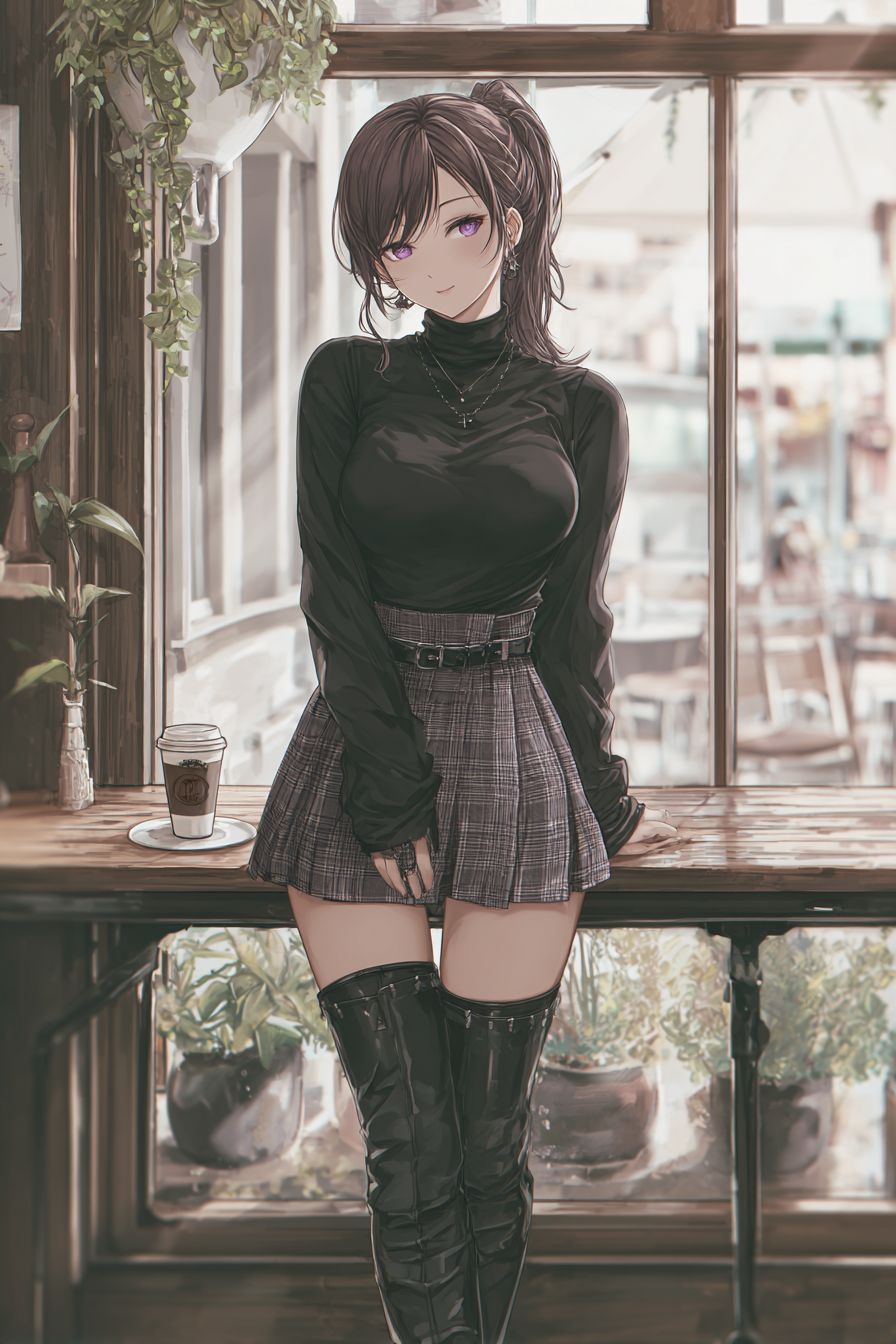 A chic anime-style female character in a cafe, wearing a fitted black turtleneck, plaid mini skirt, and thigh-high boots. Her ash brown hair is in a sleek ponytail, with sharp purple eyes. Soft window light, warm coffee shop tones, delicate cel shading.
