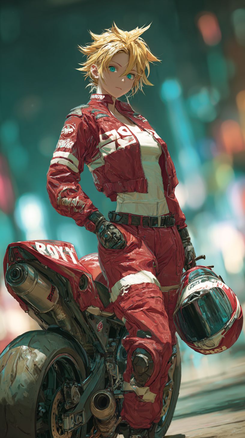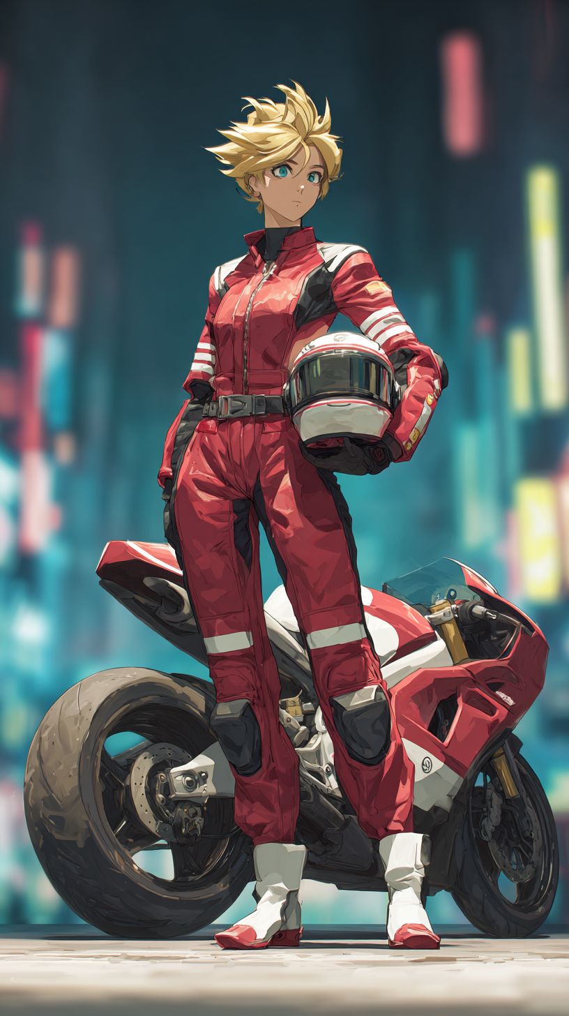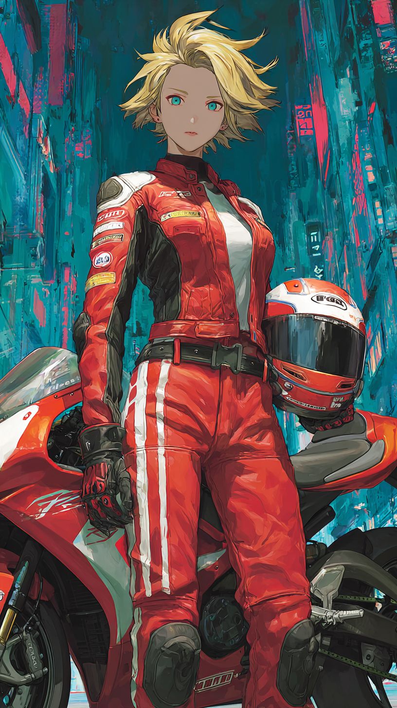 A bold anime-style female character on a motorcycle, wearing a red leather jumpsuit with white racing stripes and a helmet under her arm. Her spiky blonde hair and electric blue eyes exude confidence. Night city background, neon reflections, vibrant cel shading.