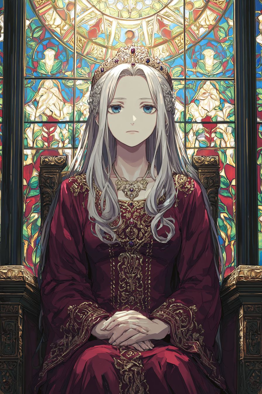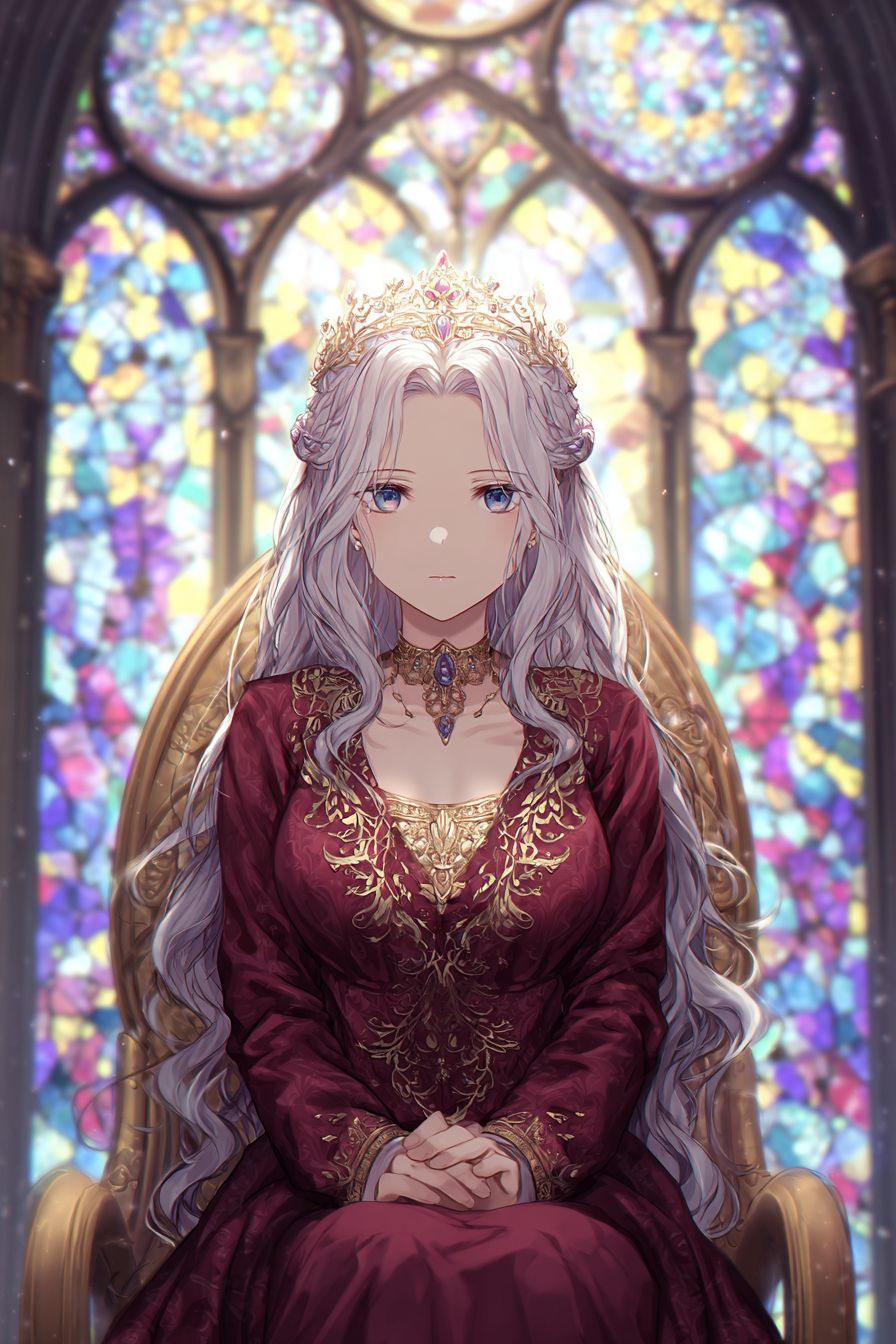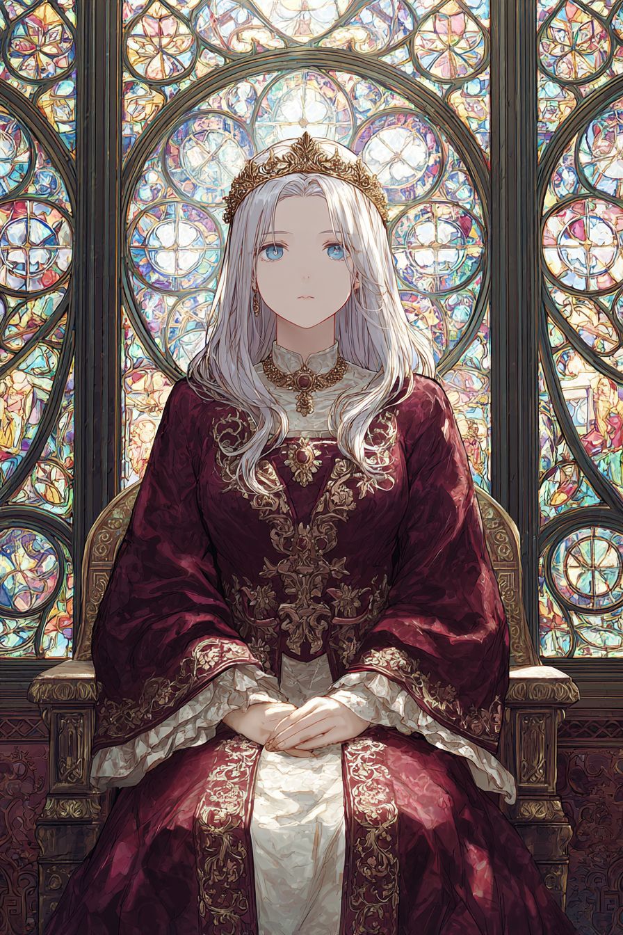 A regal anime-style female character in a throne room, wearing a crimson velvet gown with gold embroidery and a jeweled tiara. Her long silver hair cascades down, with piercing blue eyes. Stained-glass windows cast colorful light, ornate cel shading.