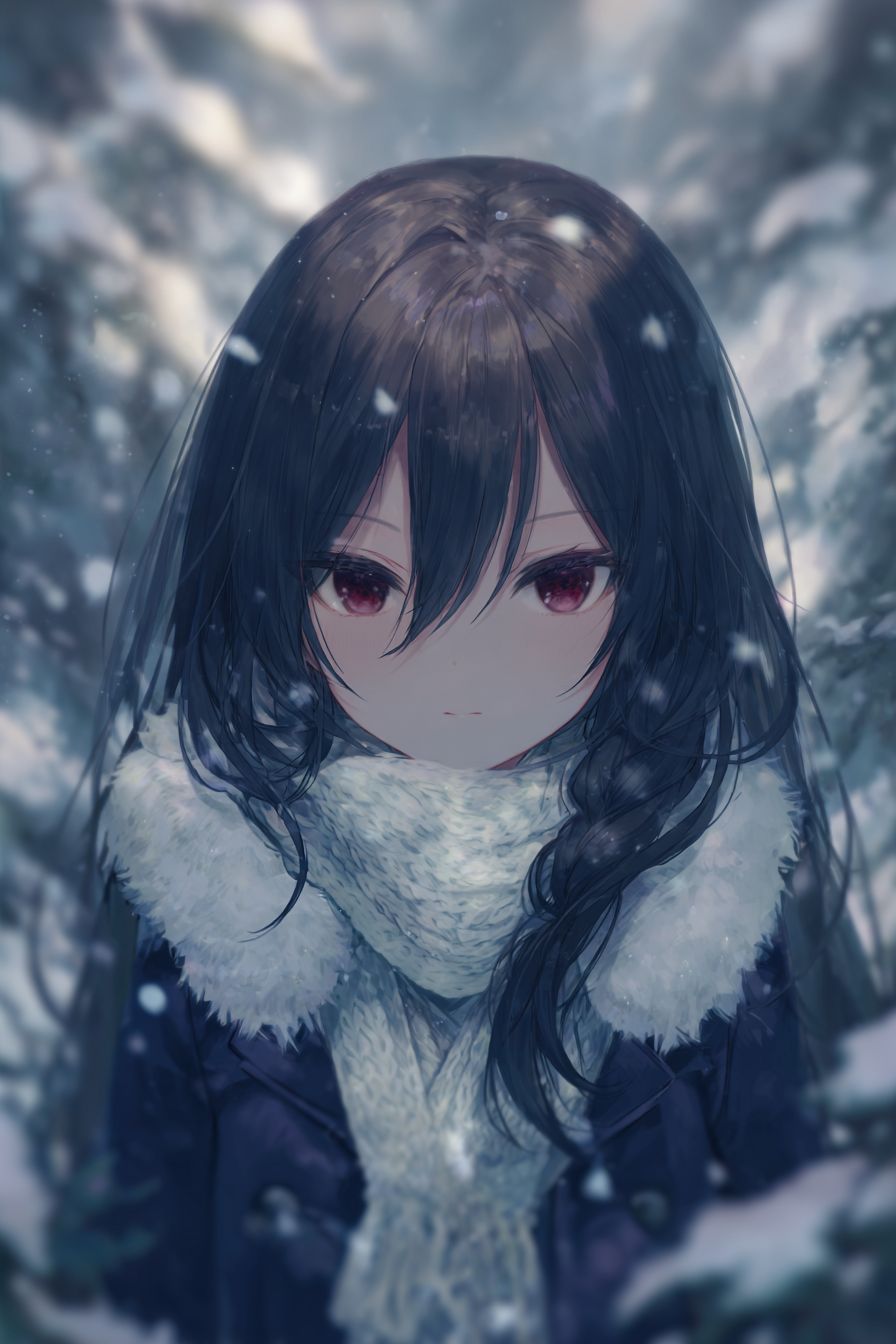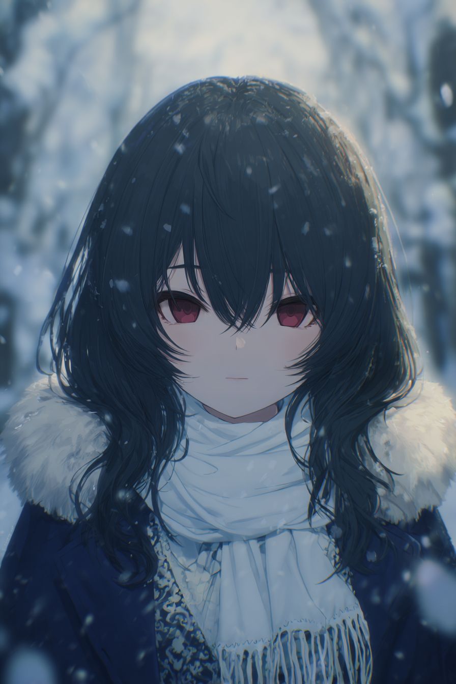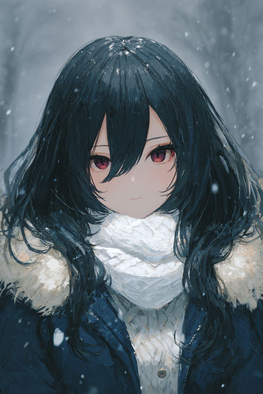 A mysterious anime-style female character in a snowy forest, wearing a fur-lined navy coat and a white scarf. Her long, jet-black hair and red eyes create a striking contrast. Snowflakes fall gently, soft cel shading, ethereal atmosphere.