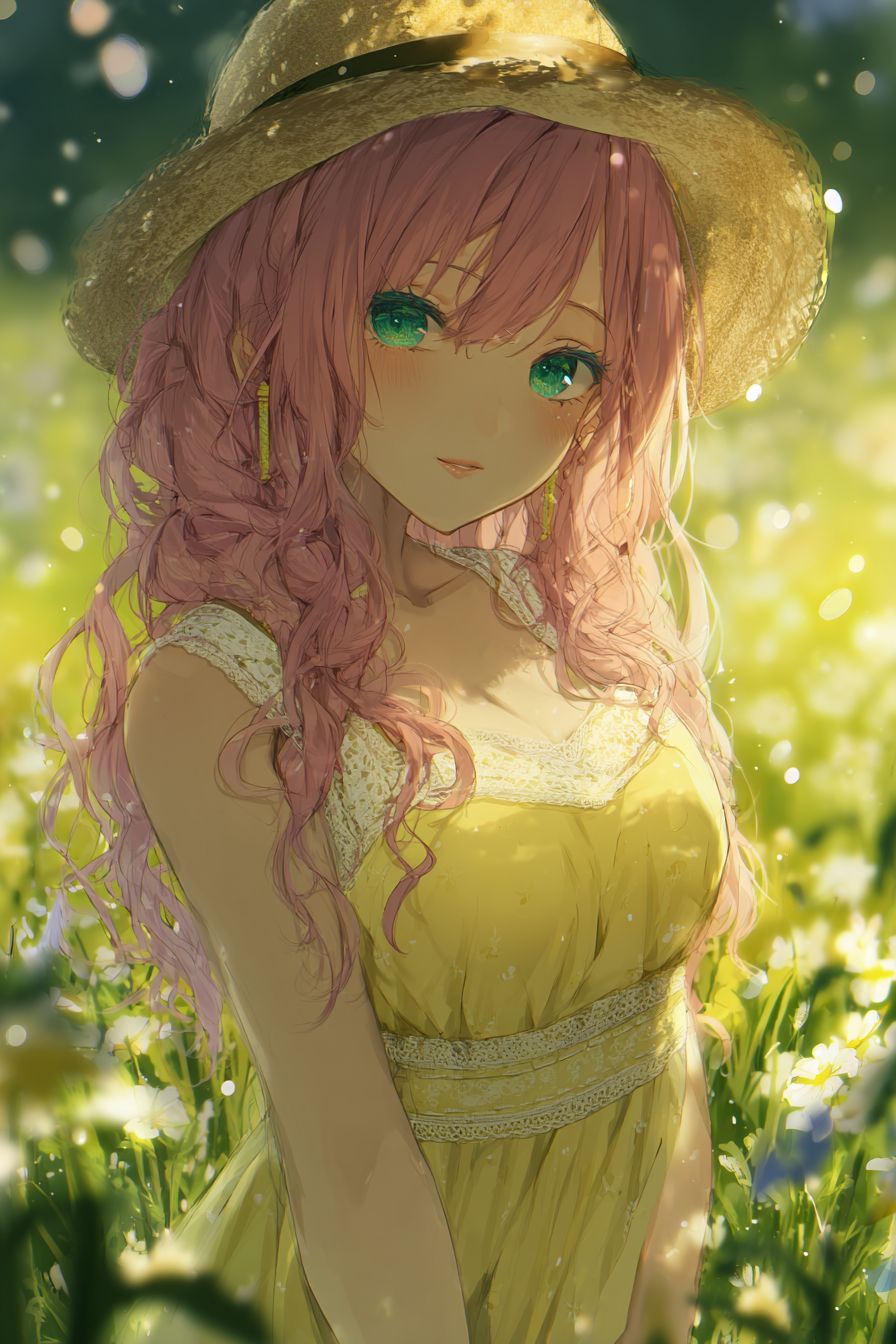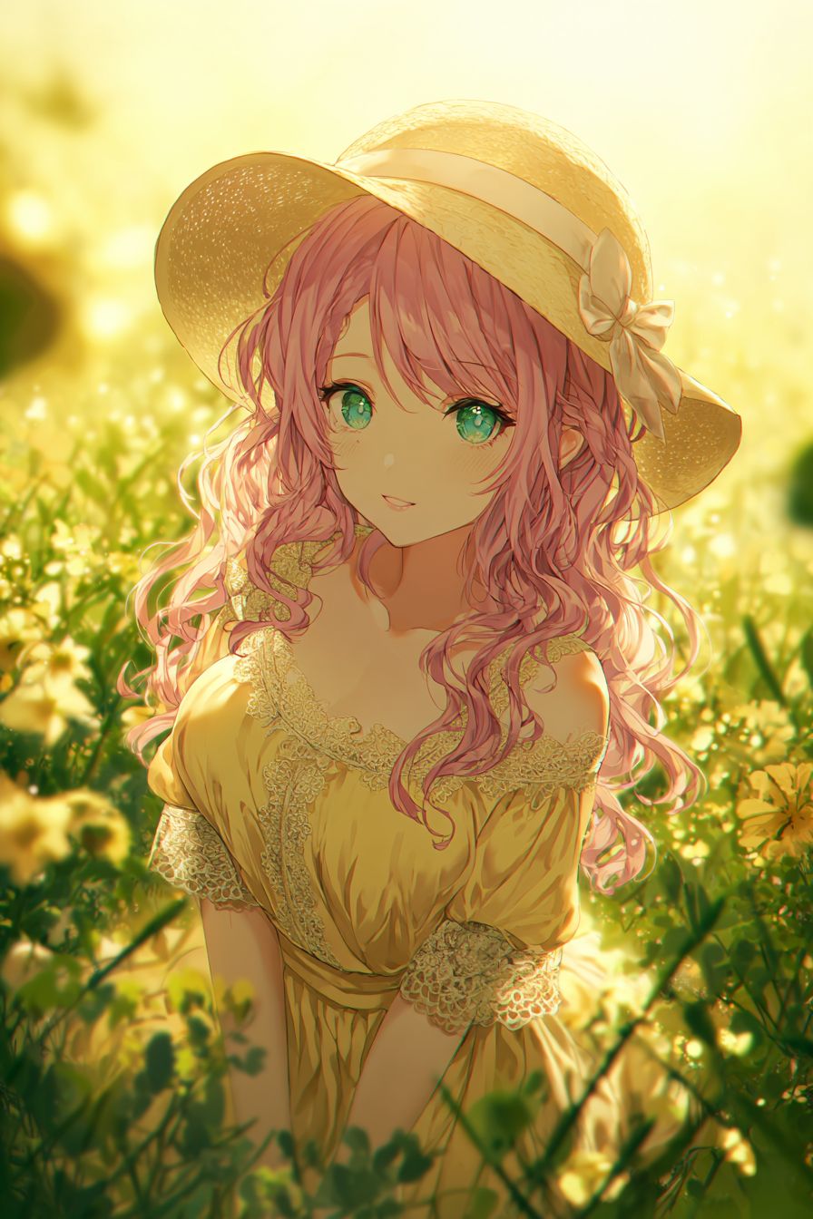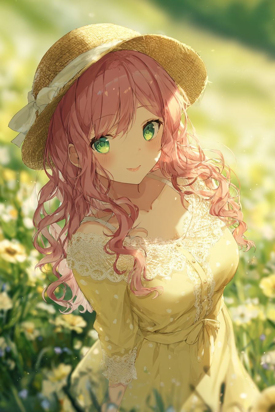 A dreamy anime-style female character in a flower field, wearing a soft yellow sundress with lace trim and a straw hat. Her long, wavy pink hair and green eyes glow softly. Golden hour lighting, delicate cel shading, idyllic atmosphere.