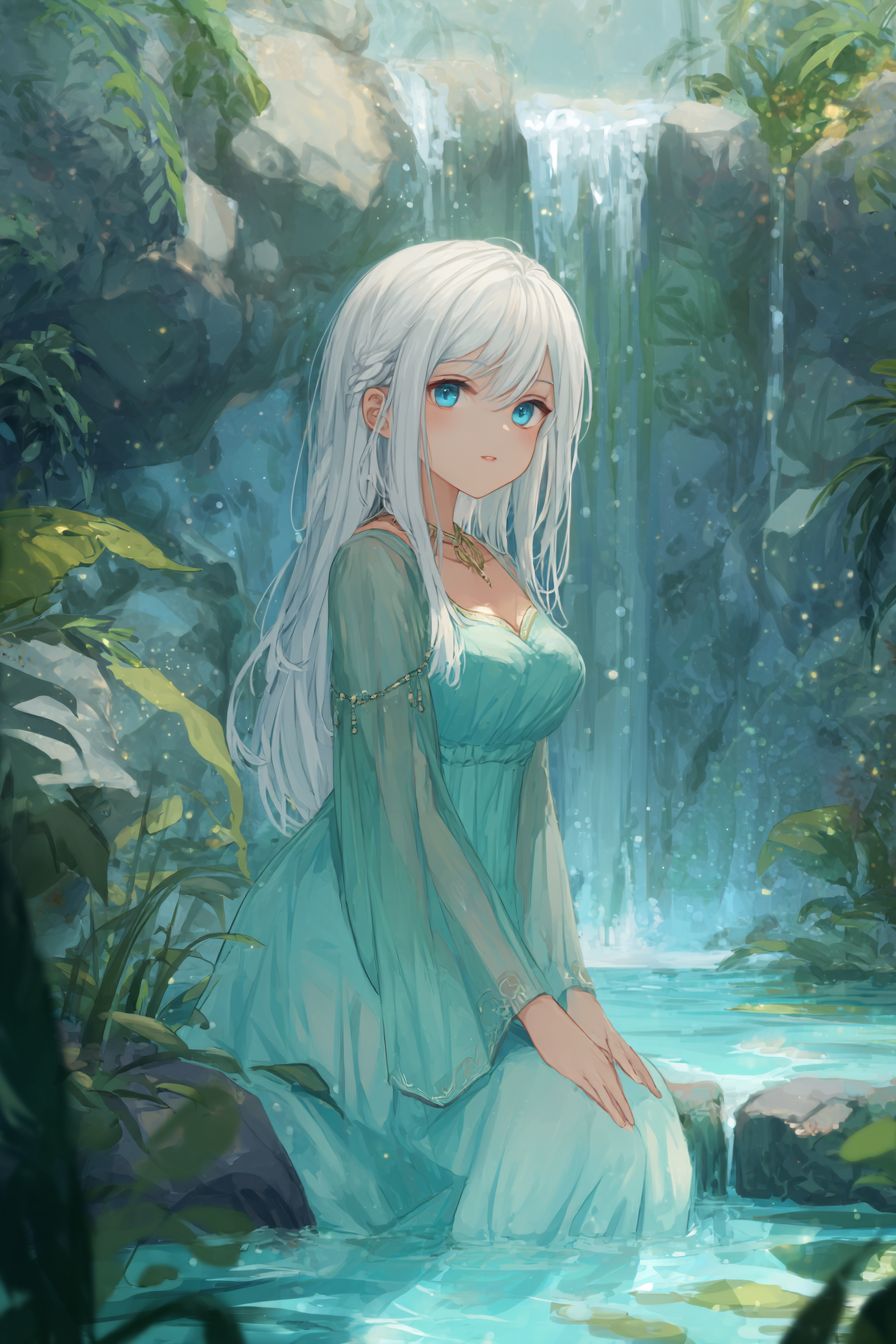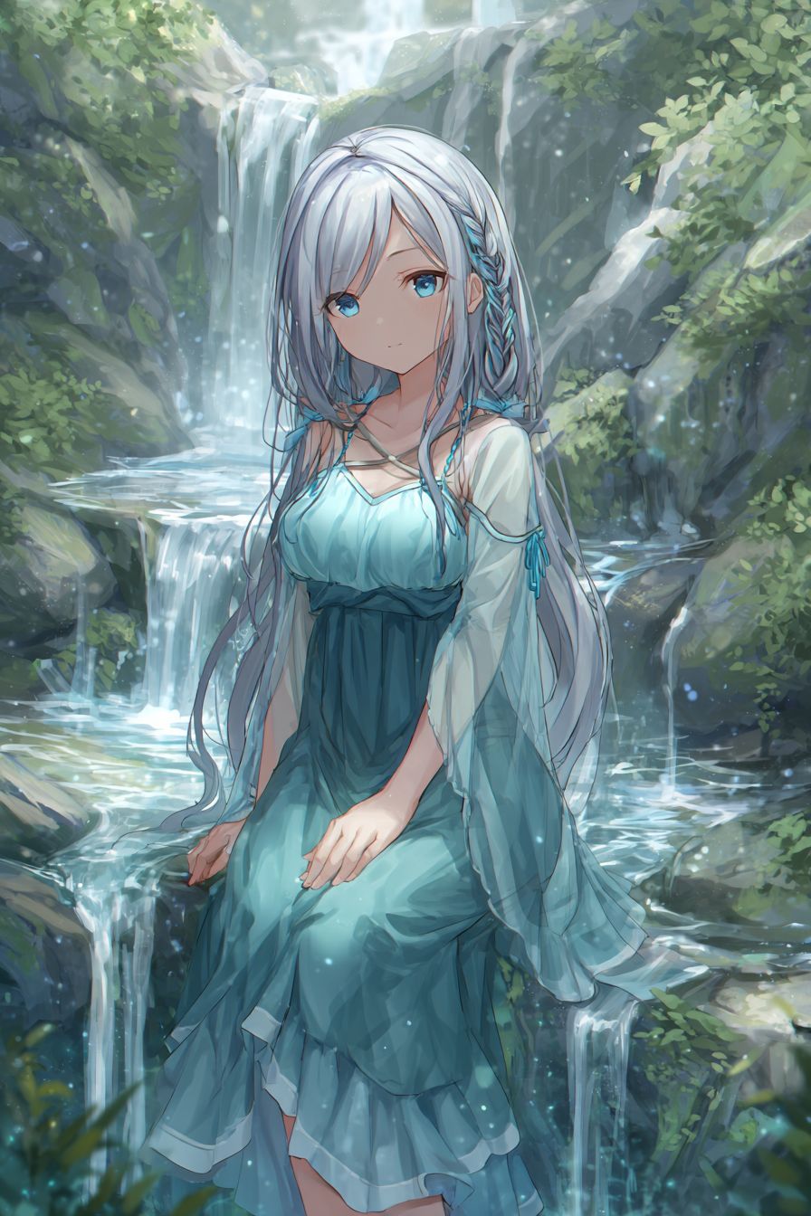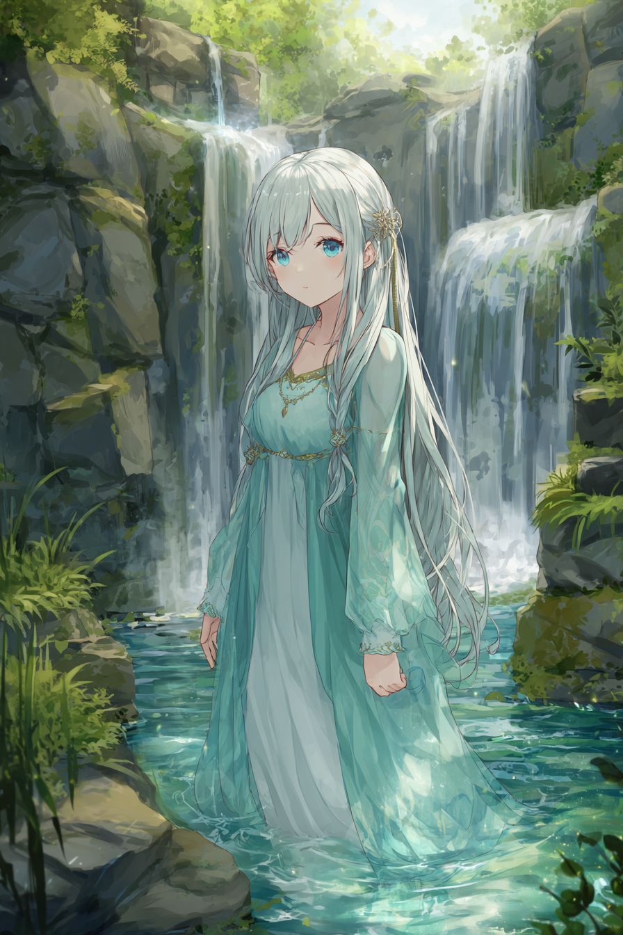 A serene anime-style female character by a waterfall, wearing a flowing aqua dress with sheer sleeves. Her long silver hair and blue eyes reflect the water's glow. Mist and lush greenery, delicate cel shading.