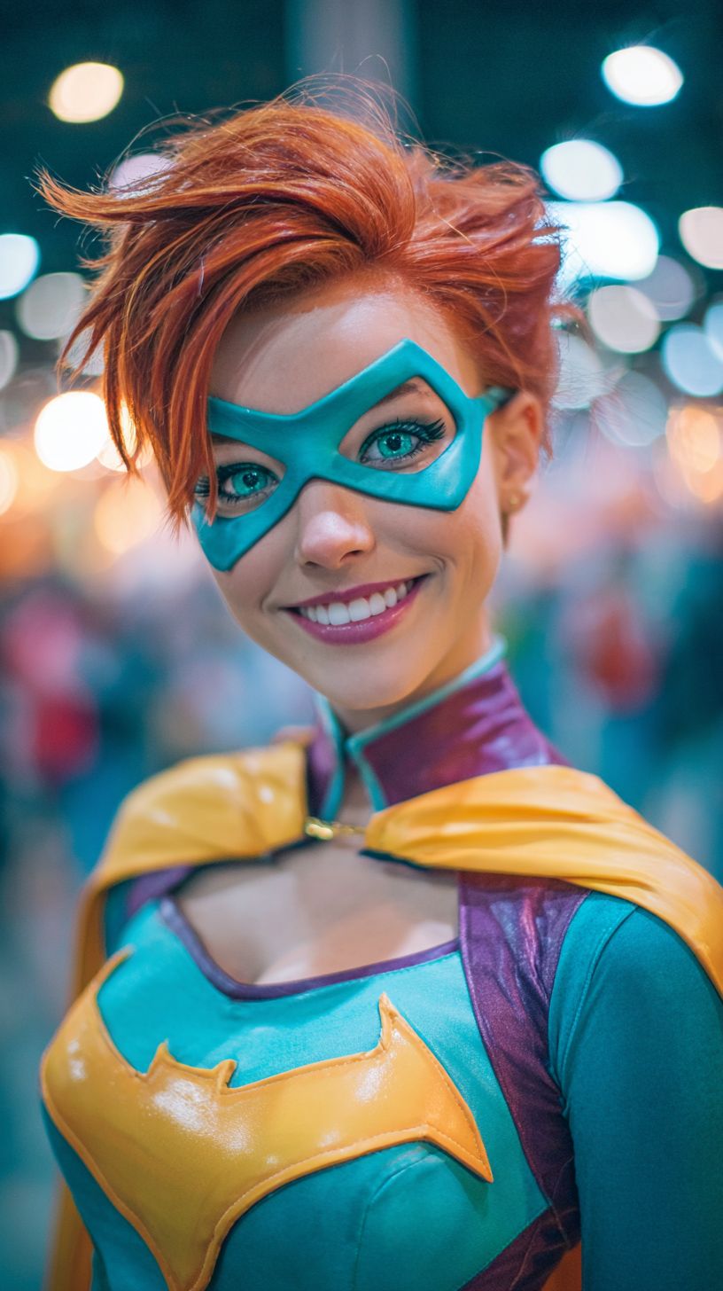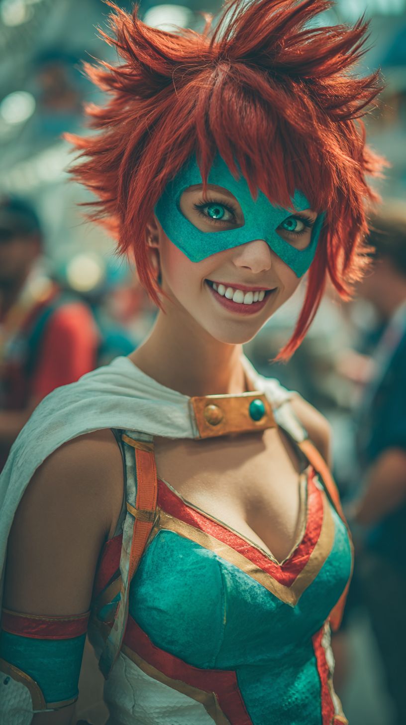 At a comic convention, a vibrant anime-style female character is wearing a colorful superhero costume with a cape and mask. Her spiky red hair and teal eyes shine with excitement. The convention hall is crowded, featuring vivid cel shading.