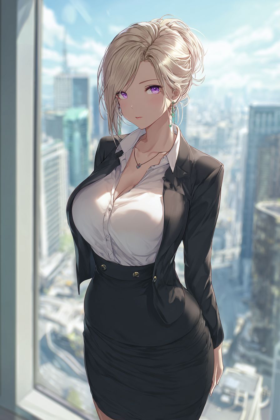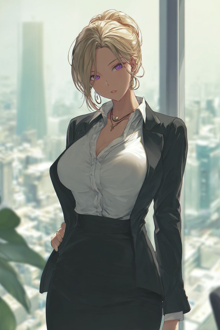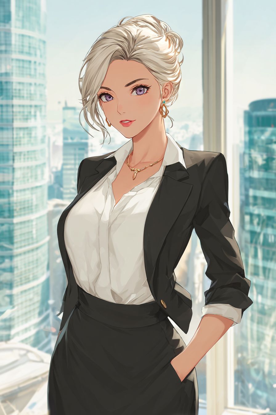 A confident anime-style female character in a corporate office, wearing a sharp black blazer, white blouse, and pencil skirt. Her ash blonde hair is in a sleek updo, with violet eyes. City view through windows, crisp cel shading.