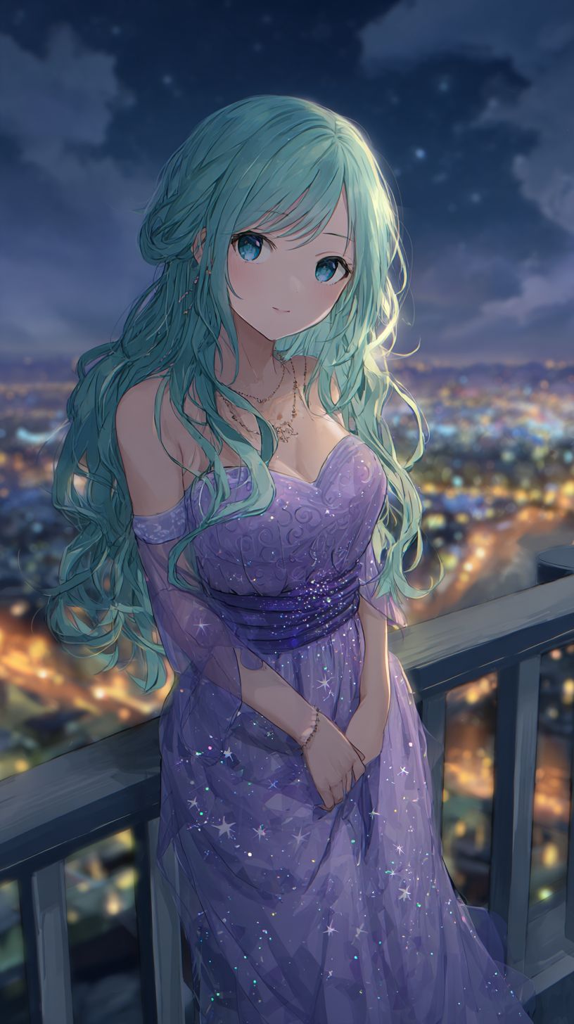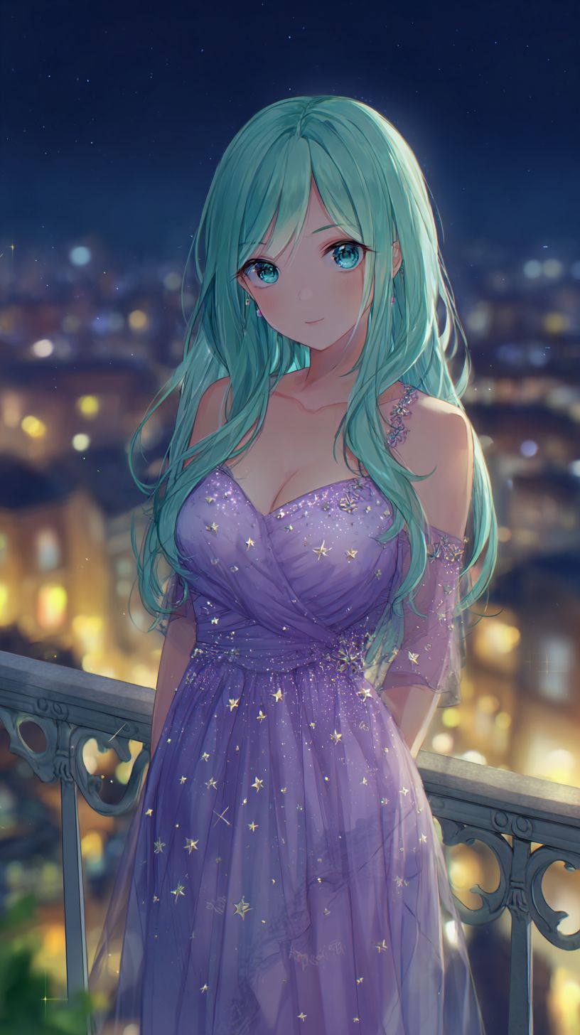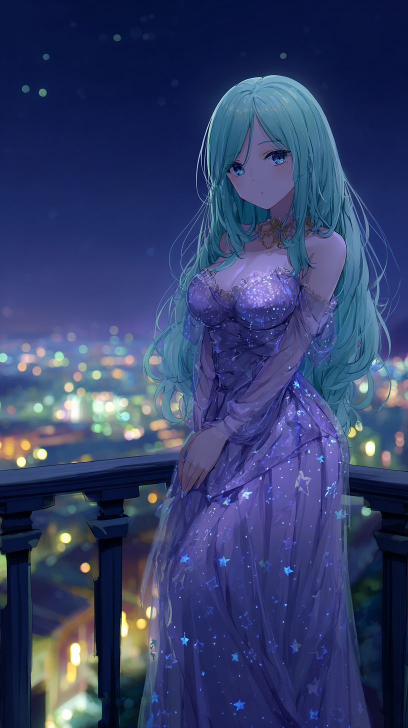 A dreamy anime-style female character on a balcony, wearing a flowing lavender gown with star-shaped sequins. Her long, teal hair and blue eyes glow under moonlight. City lights below, soft cel shading, romantic vibe.
