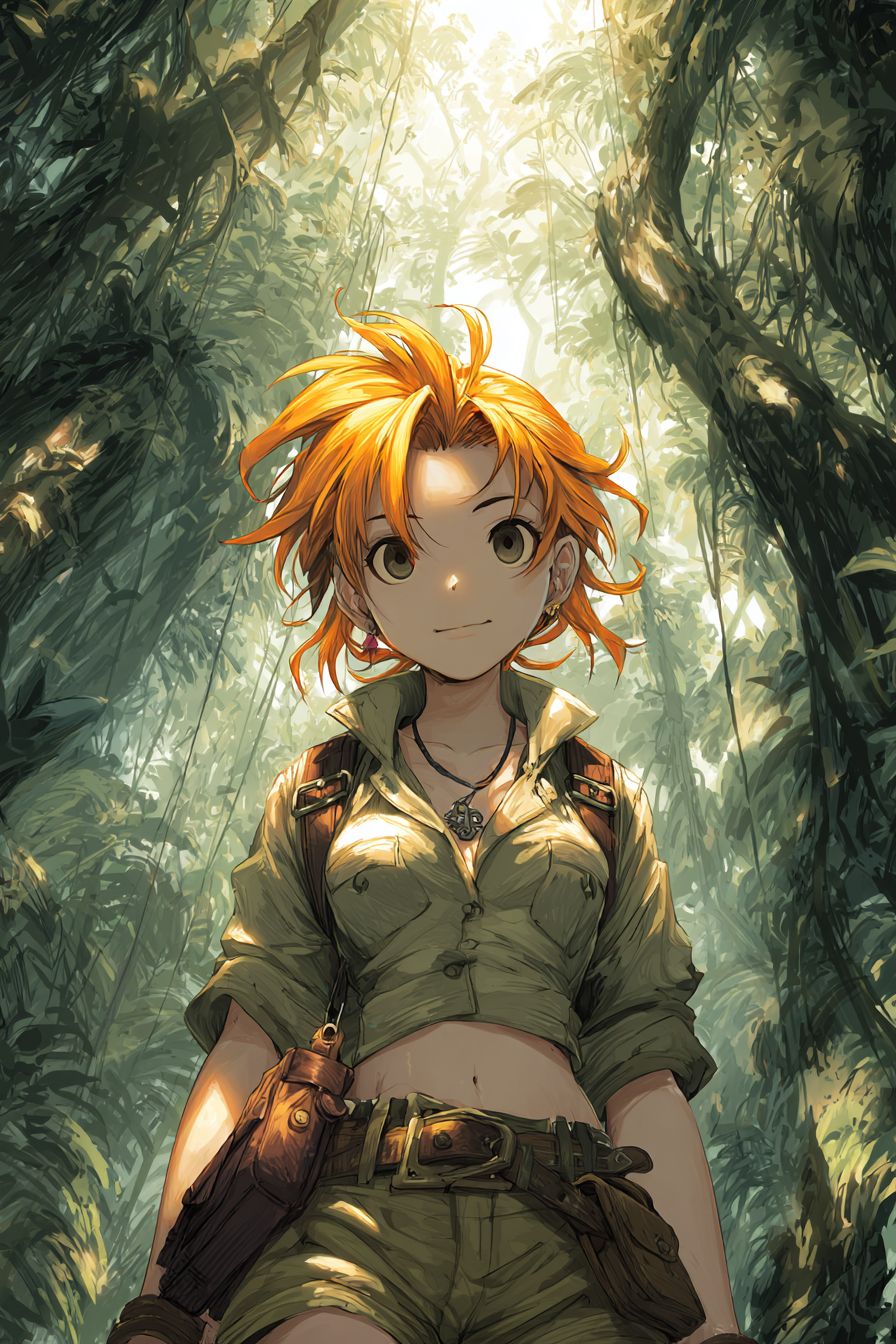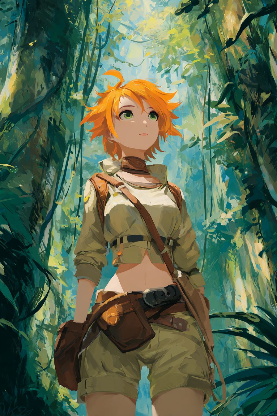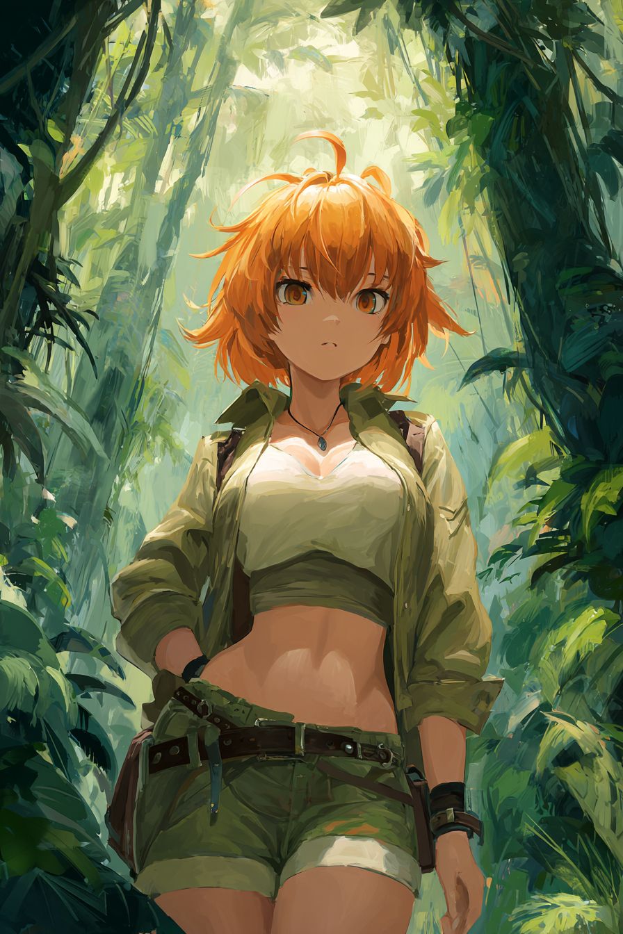A bold anime-style female character in a jungle, wearing a khaki explorer’s outfit with a cropped jacket and shorts. Her spiky orange hair and amber eyes exude adventure. Vines and sunlight filtering through trees, dynamic cel shading.