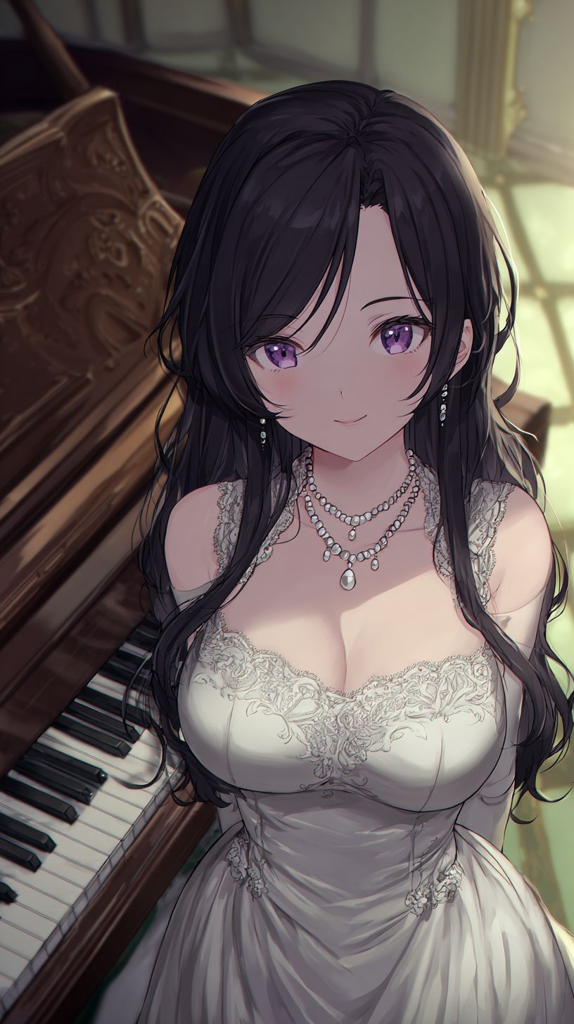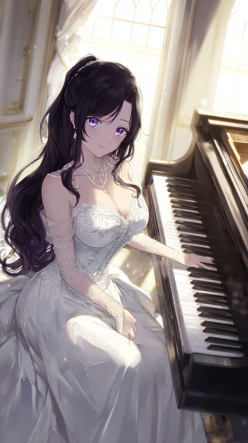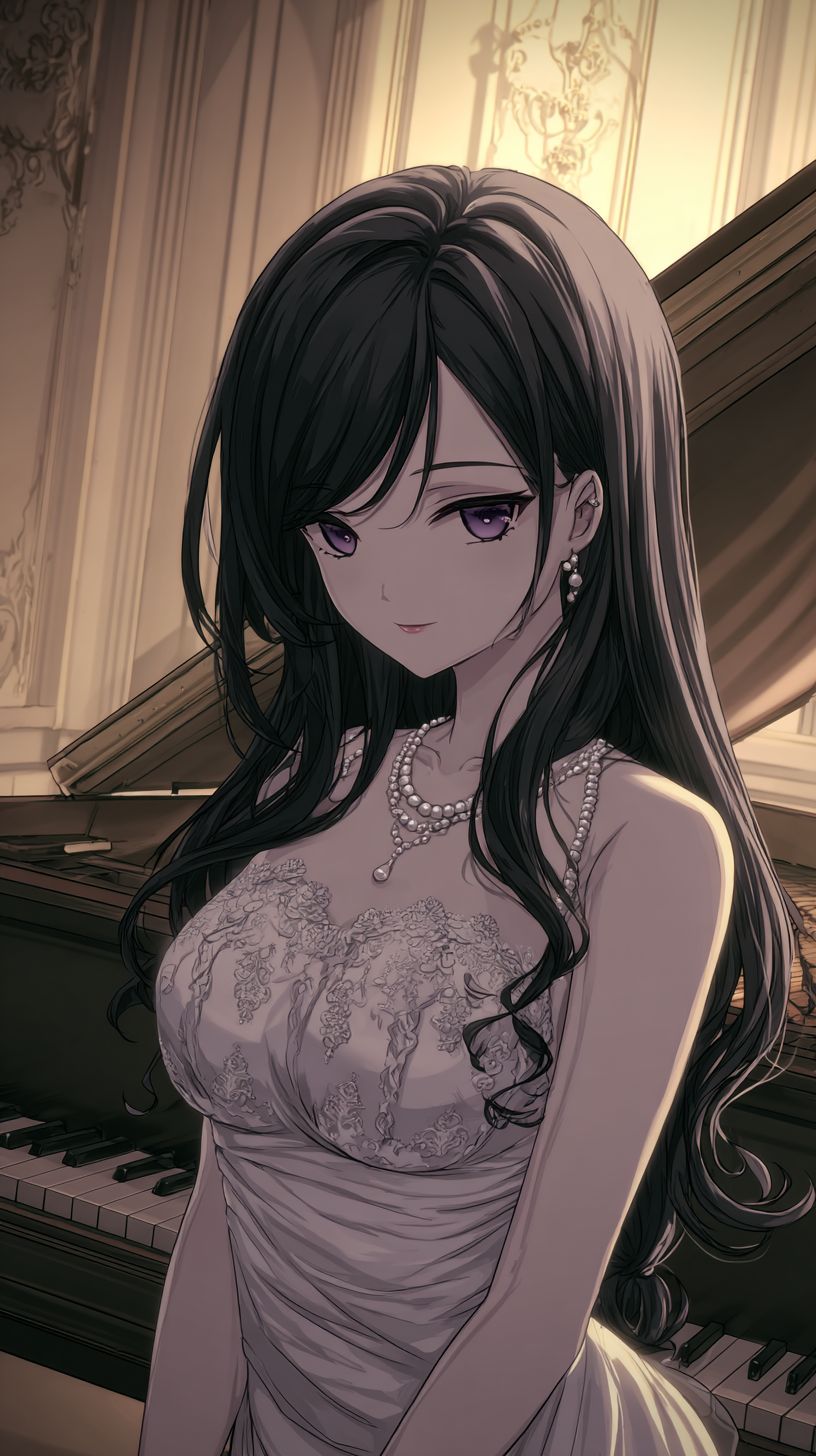 A refined anime-style female character in a piano room, wearing a white satin dress with pearl accents. Her long, black hair and purple eyes convey elegance. Grand piano and soft light, delicate cel shading.