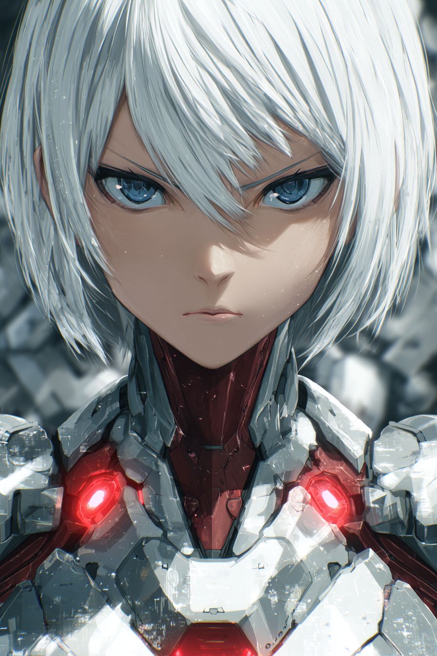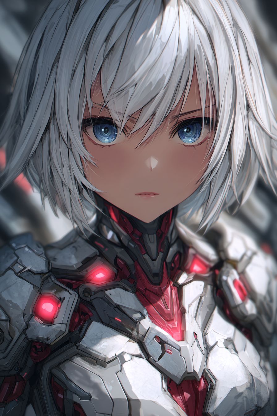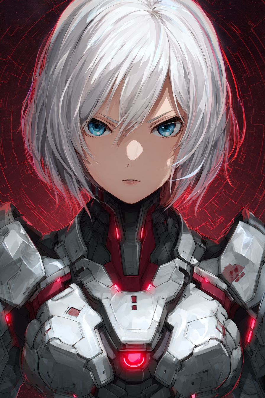 A fierce anime-style female character in a futuristic arena, wearing a metallic silver armor suit with glowing red accents. Her short, white hair and piercing blue eyes convey strength. Holographic battlefield, sharp cel shading.