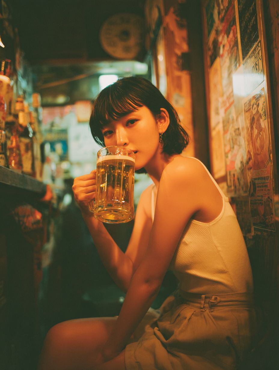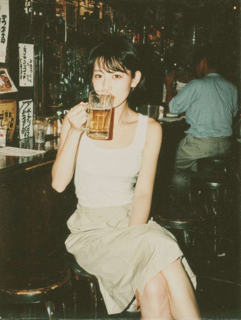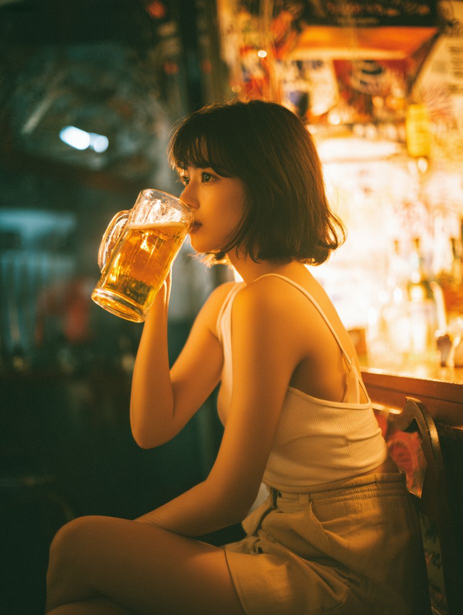 A photograph of an attractive Japanese woman drinking beer in her nightgown at a bar. She has short hair with bangs, wearing a white tank top and a beige skirt, holding up a large glass mug to drink, sitting on a chair. The photograph was taken with a DSLR camera.