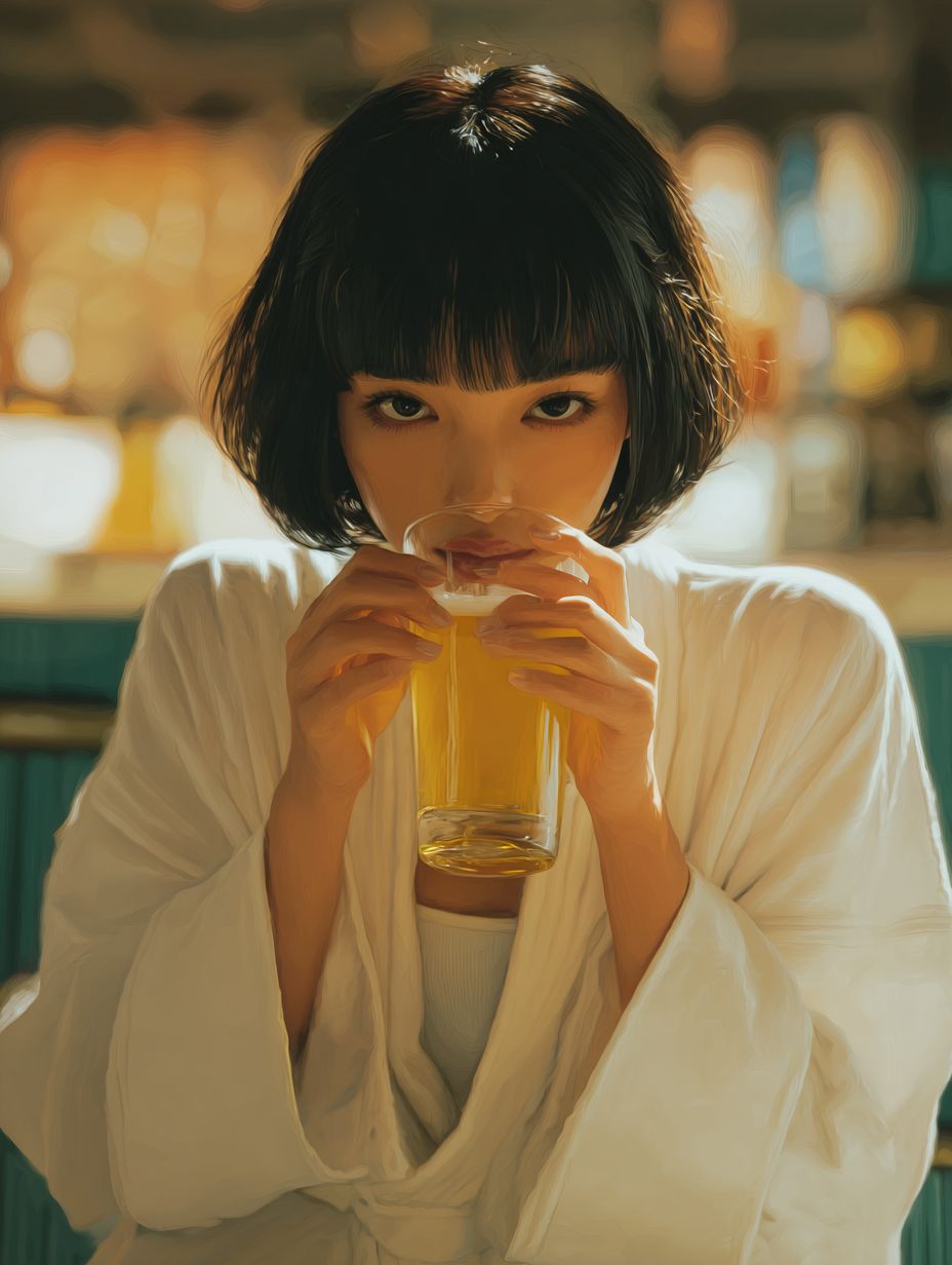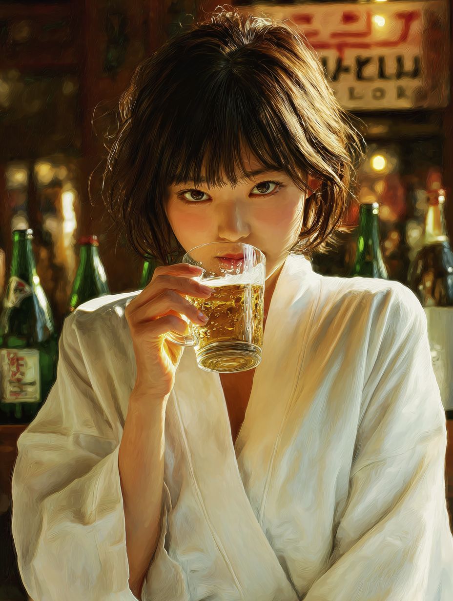 A photograph of an extremely beautiful Japanese woman with short hair and bangs, wearing white loungewear while drinking beer in a bar, with realistic details and high-definition quality.