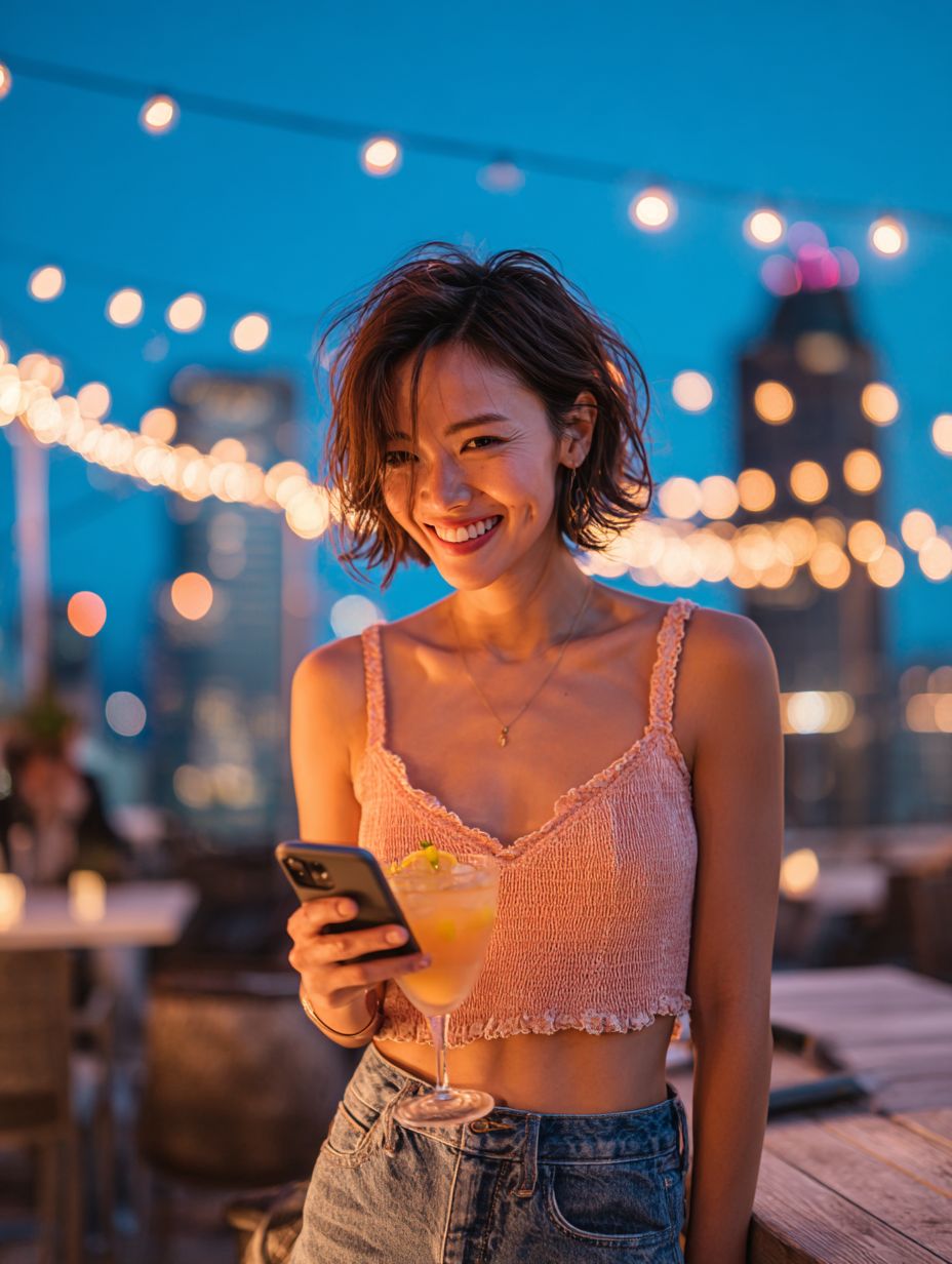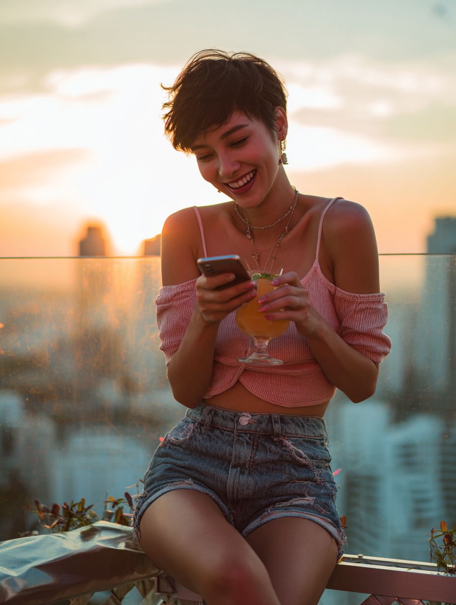 A photograph of a charming Japanese woman with short hair, wearing a light pink crop top and denim shorts, sipping a cocktail at a rooftop bar at sunset. Her playful smile lights up the scene, captured in vivid detail with a smartphone camera.