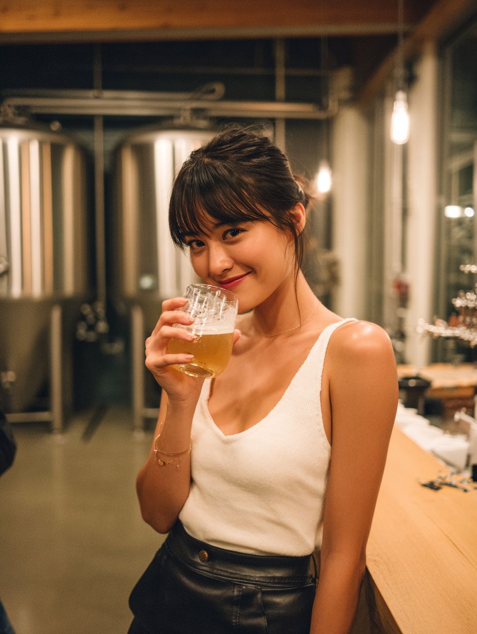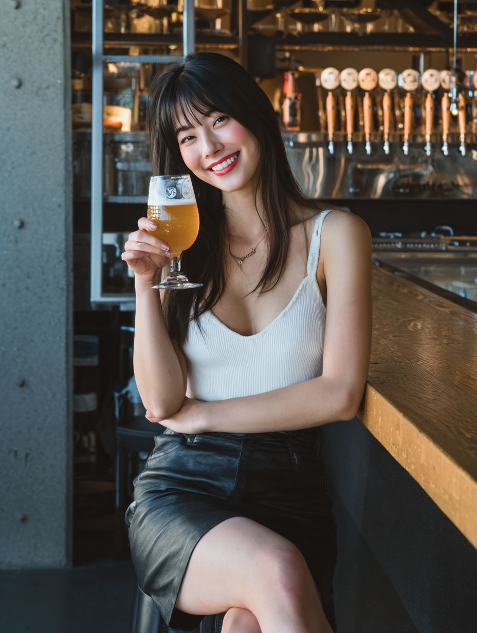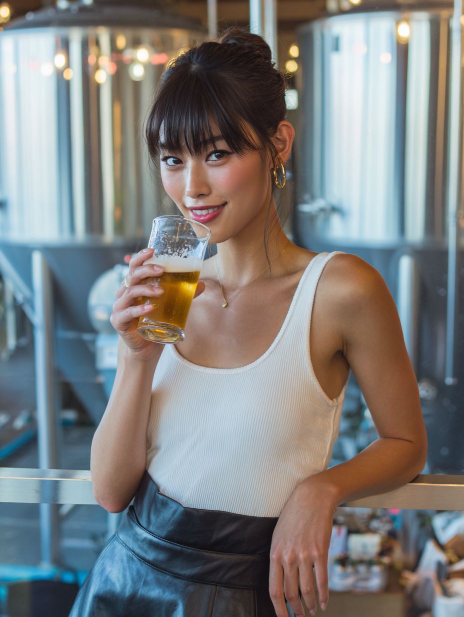 A DSLR photograph of a beautiful Japanese woman with bangs, wearing a white tank top and a black leather skirt, sipping a craft beer at a modern brewery. Her playful smile is captured in stunning detail.