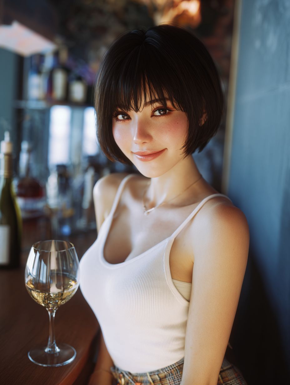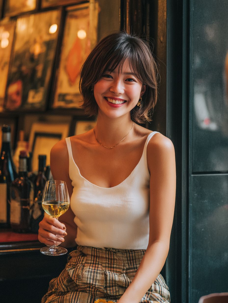 A high-quality photo of a cute Japanese woman with a bob haircut, wearing a white tank top and a plaid skirt, enjoying a glass of wine at a chic café. Her warm smile is captured with a DSLR camera in vivid detail.