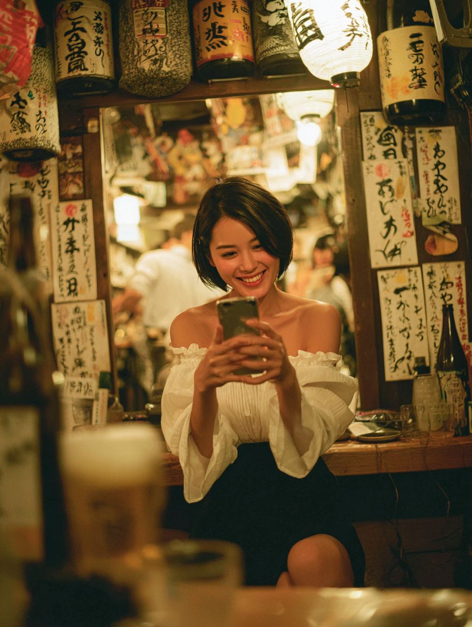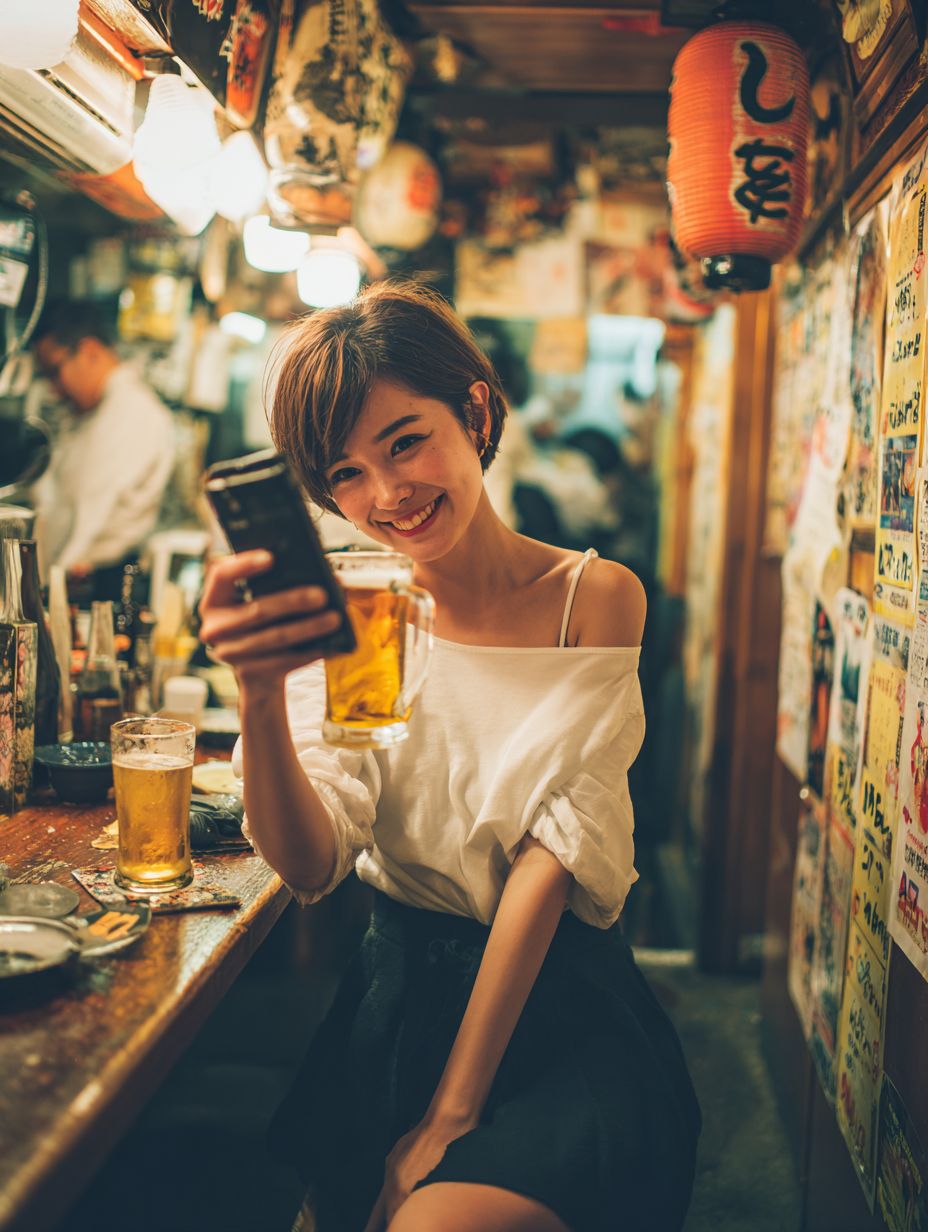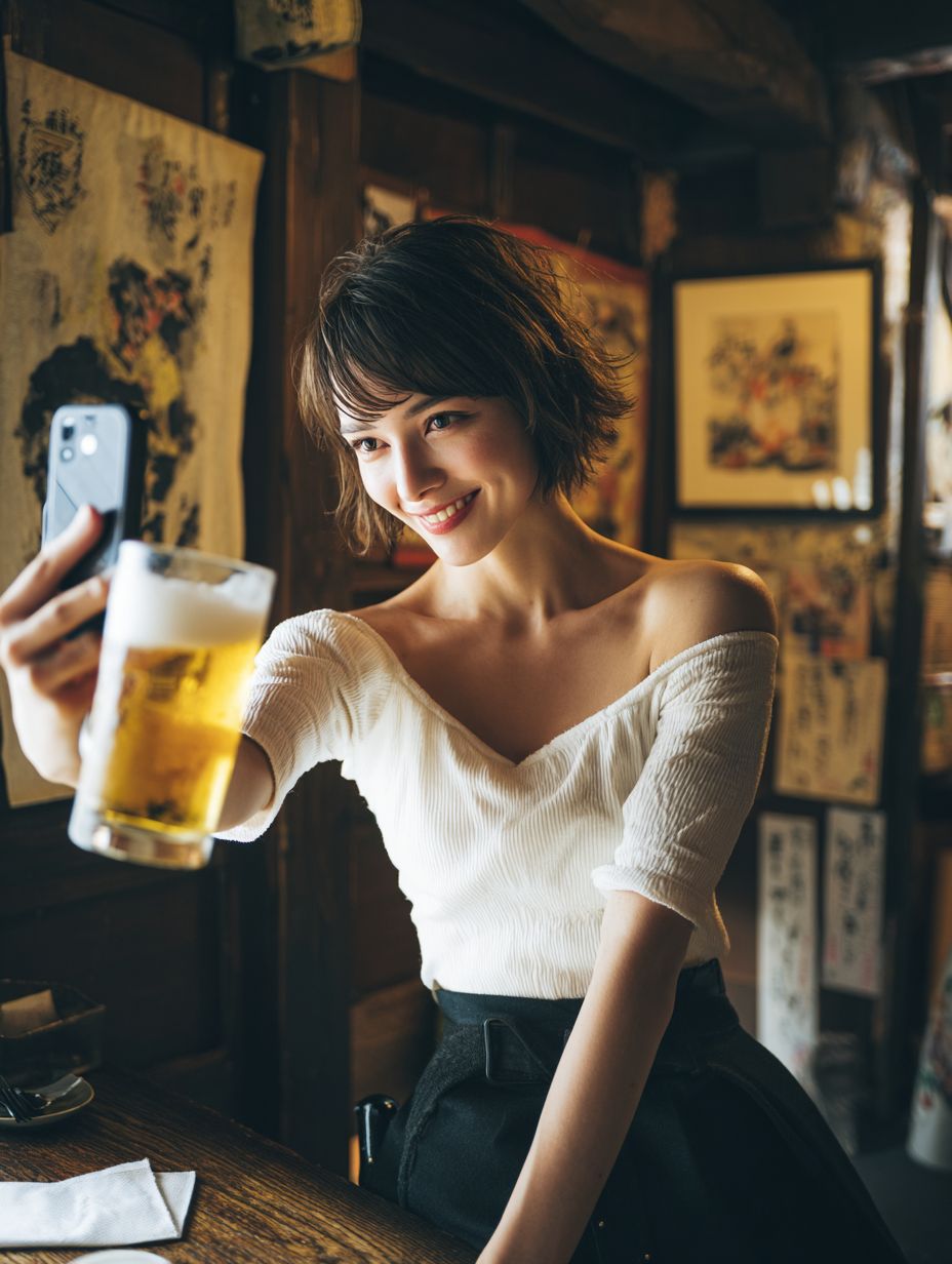 A high-definition photo of a charming Japanese woman with short hair, dressed in a white off-shoulder top and a black skirt, drinking a beer at a traditional Japanese tavern. Her playful smile is captured with a smartphone camera.