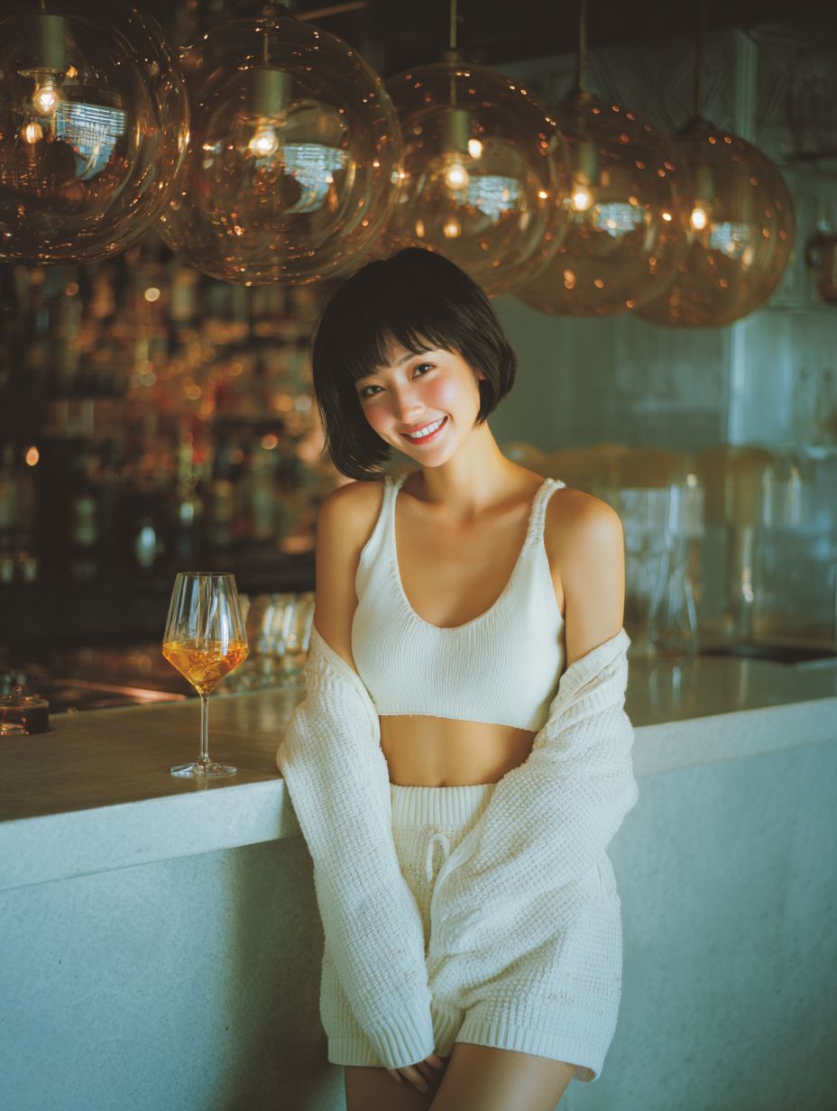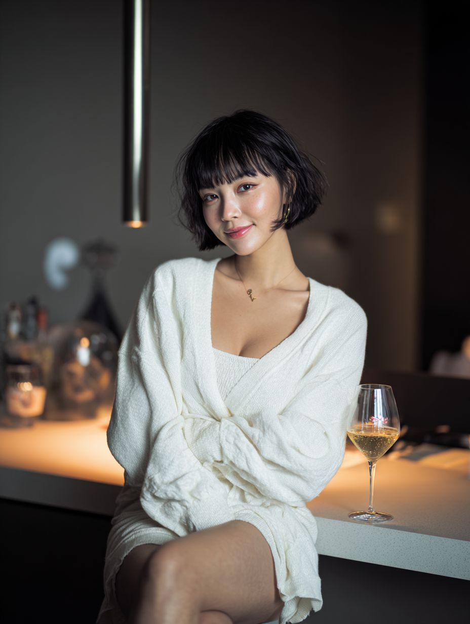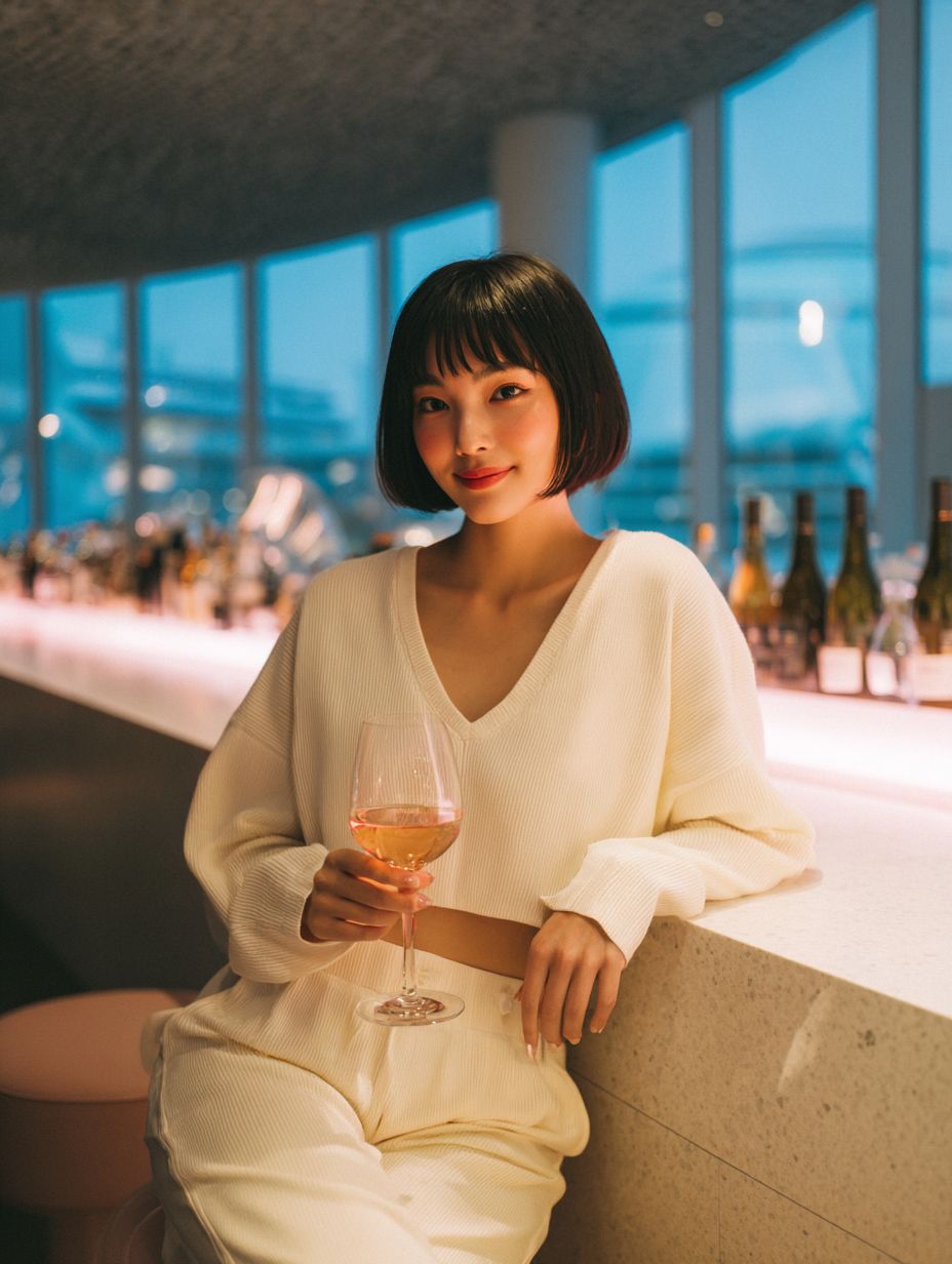 A high-quality photo of a beautiful Japanese woman with short hair and bangs, dressed in a white loungewear set, enjoying a glass of plum wine at a modern bar. Her serene smile is captured with a DSLR camera in crisp clarity.