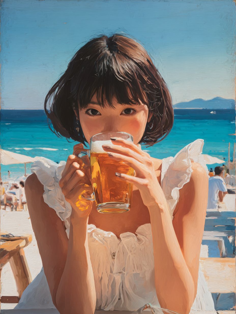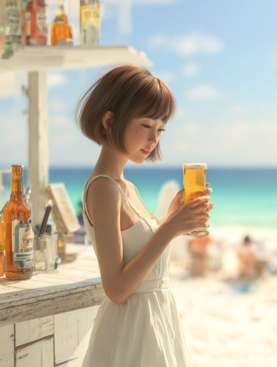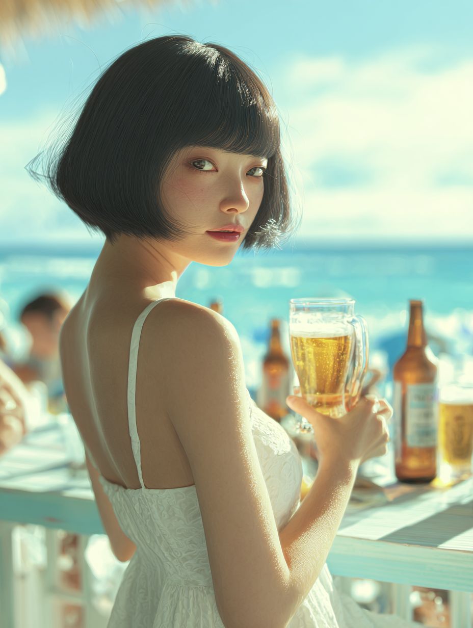 A real photo of a cute Japanese woman with a bob haircut, dressed in a white sundress, enjoying a cold beer at a beachside bar. Her innocent expression and the ocean backdrop are captured in crisp detail with a smartphone.