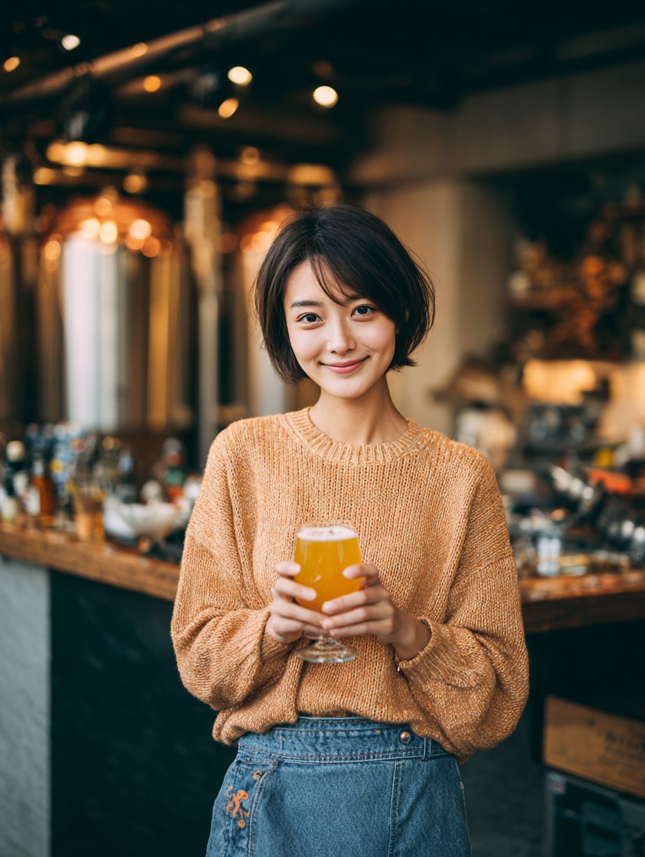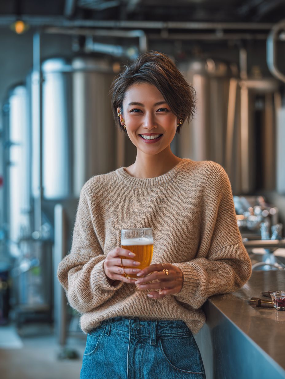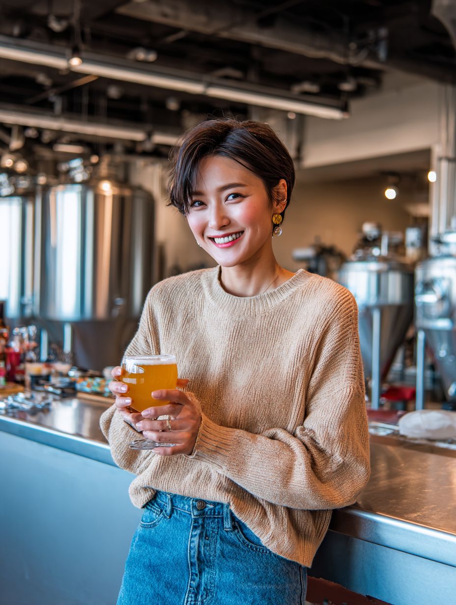 A high-quality photo of a lovely Japanese woman with short hair, wearing a beige sweater and a denim skirt, drinking a craft beer at a modern brewery. Her warm smile is captured in stunning detail with a professional camera.
