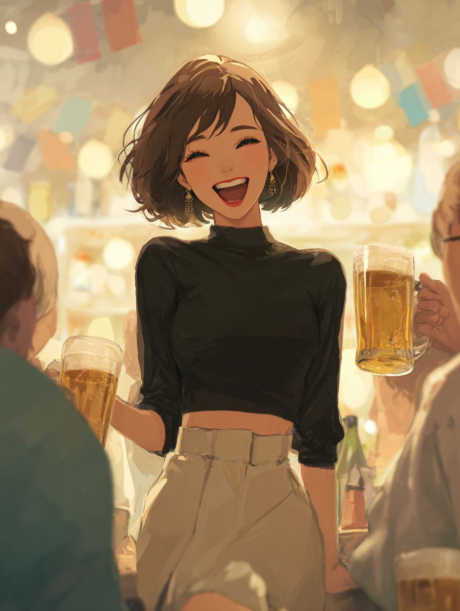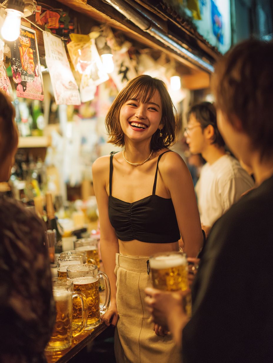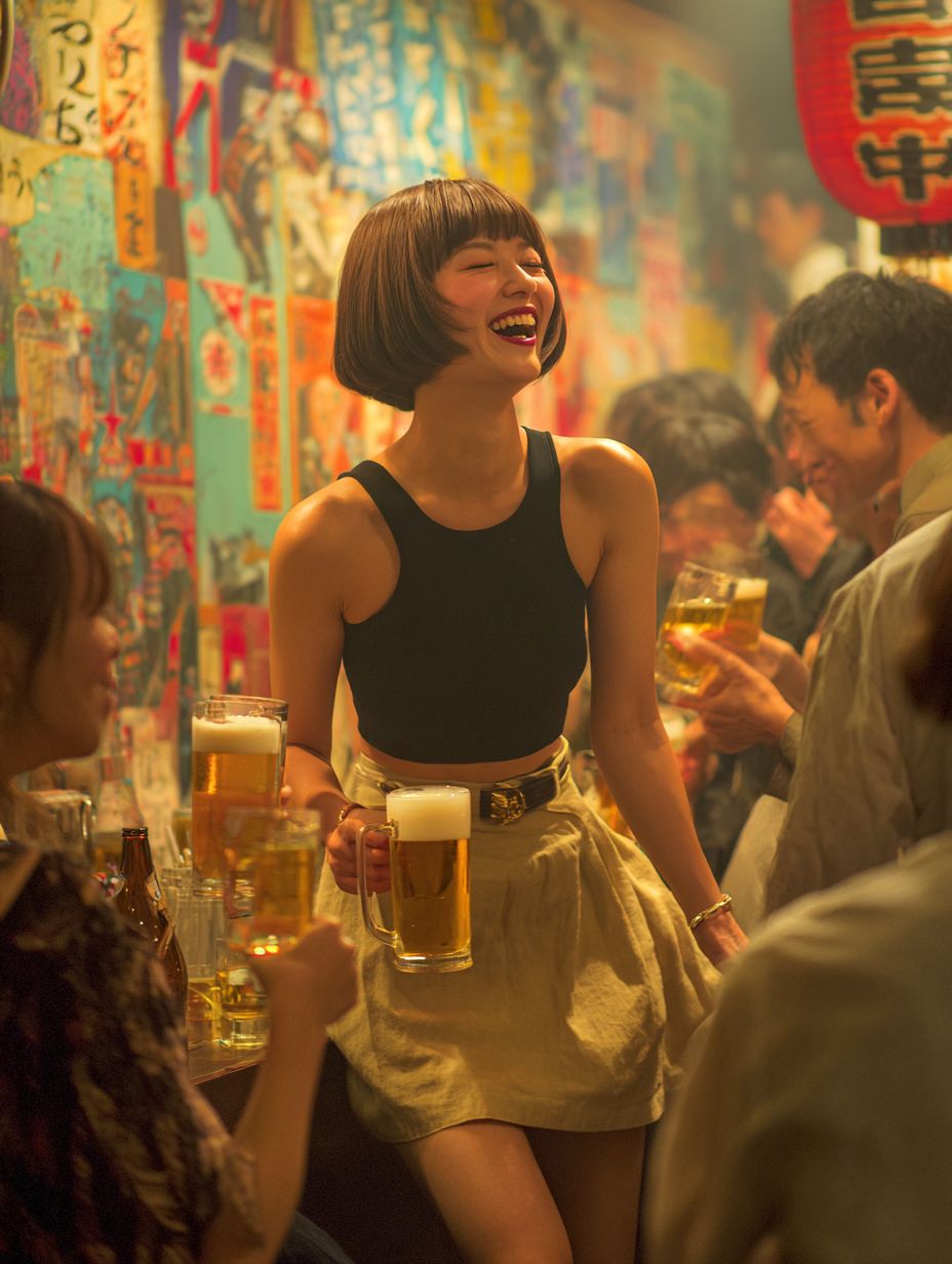A DSLR photograph of a cute Japanese woman with a bob cut, wearing a black crop top and a high-waisted beige skirt, laughing while clinking beer mugs with friends at a lively bar. The scene is vibrant and detailed.