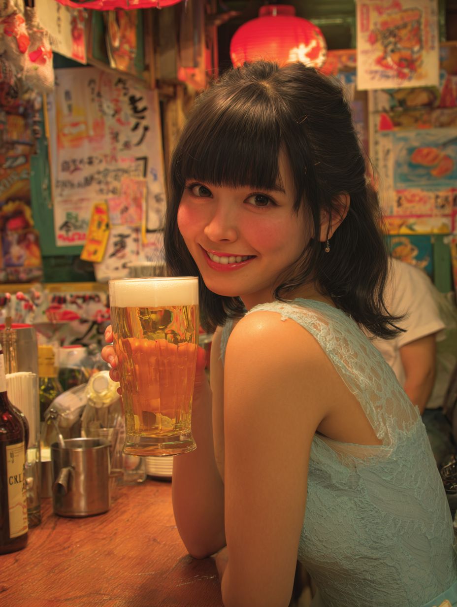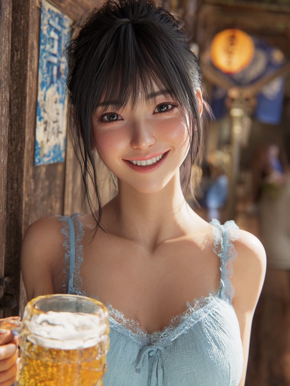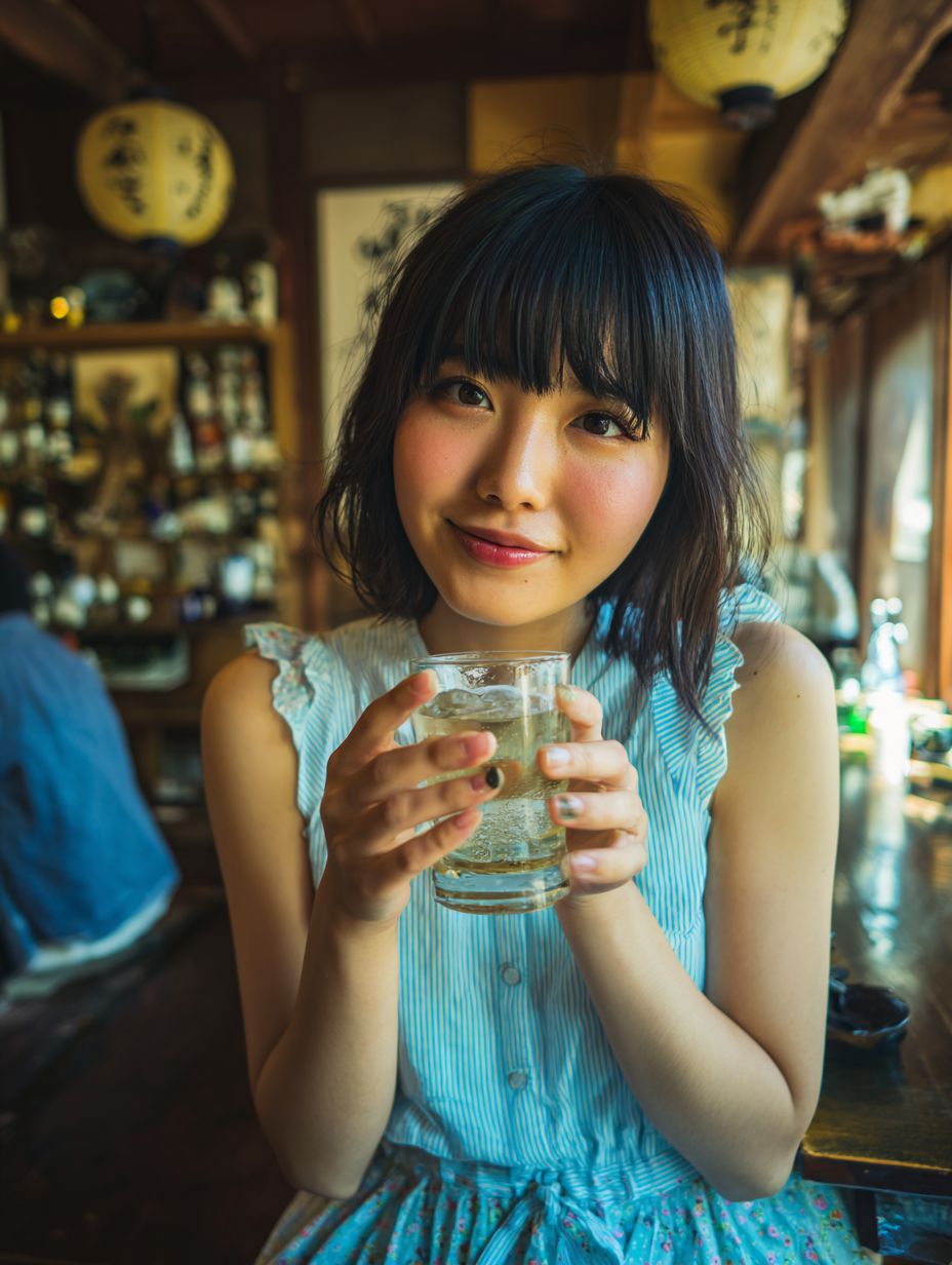 A high-definition photo of an adorable Japanese woman with bangs, wearing a light blue sundress, drinking a cold beer at a traditional Japanese tavern. Her sweet smile is captured perfectly with a DSLR camera.