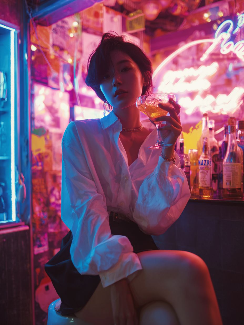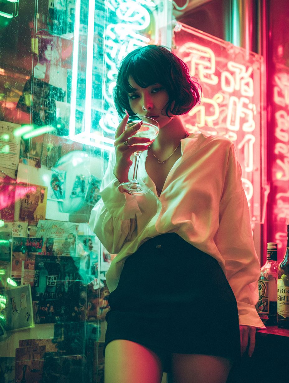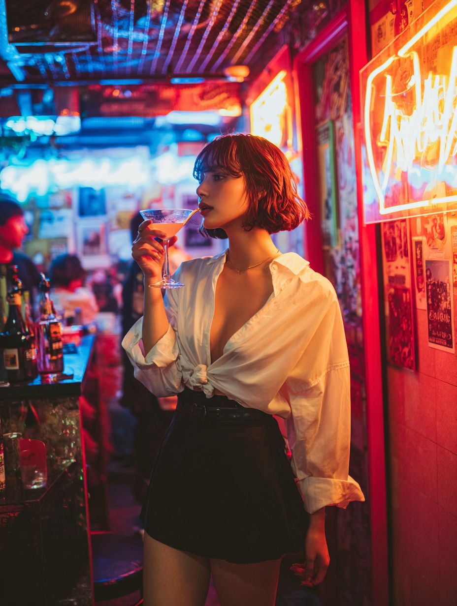A real photo of a beautiful Japanese woman with short hair, dressed in a white oversized shirt and a black mini skirt, enjoying a cocktail at a neon-lit bar. The vibrant details are captured with a smartphone camera.