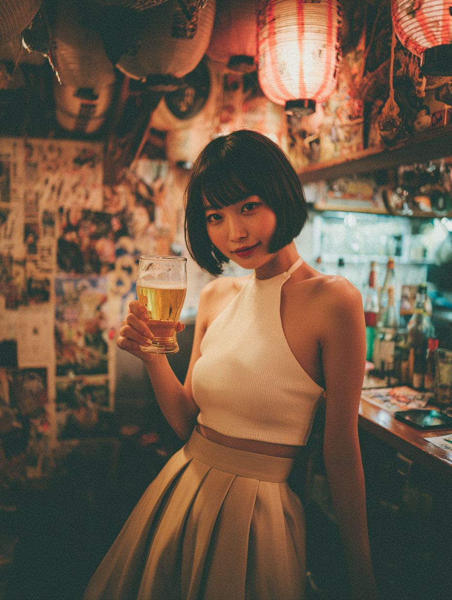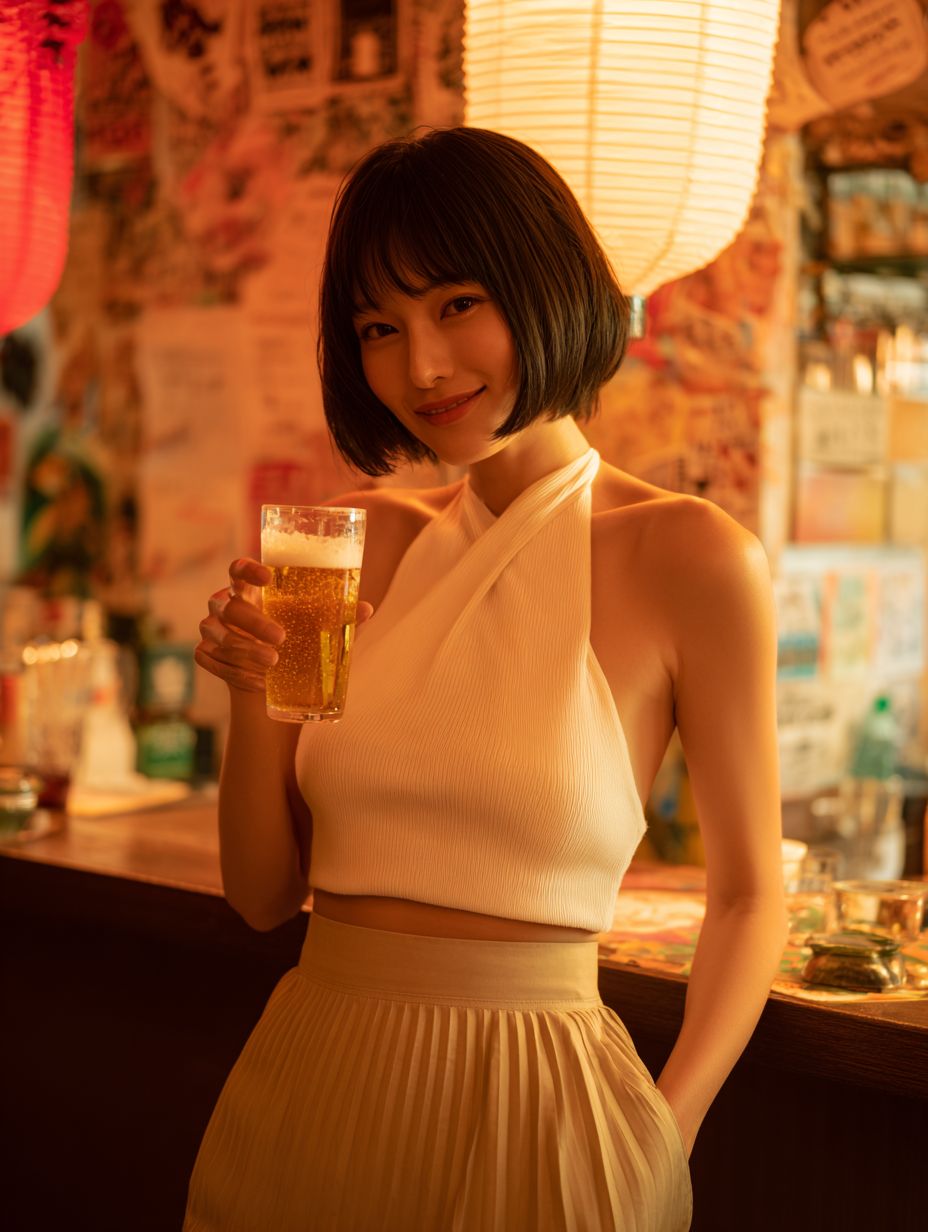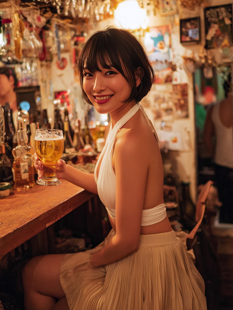 A photograph of a charming Japanese woman with a bob haircut, wearing a white halter top and a beige pleated skirt, toasting with a beer glass at a cozy bar. The high-quality image is shot with a DSLR camera.