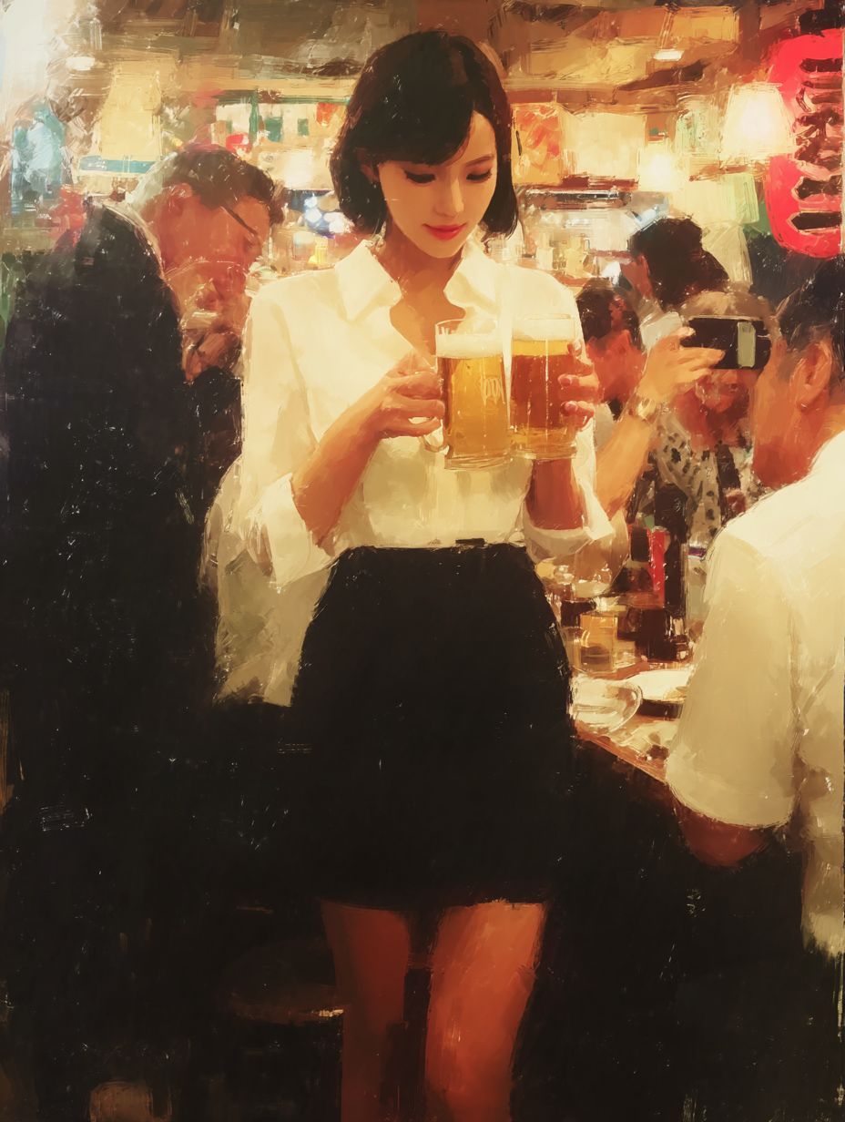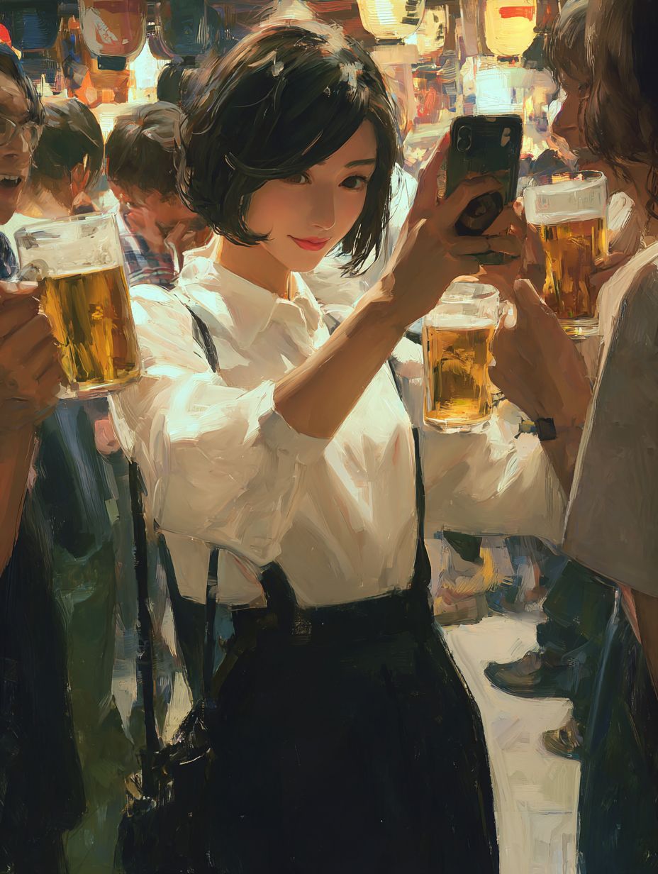A realistic photo of a beautiful Japanese woman with short hair, dressed in a white blouse and a black skirt, clinking beer glasses with friends at a lively izakaya. The vibrant moment is captured with a smartphone camera.