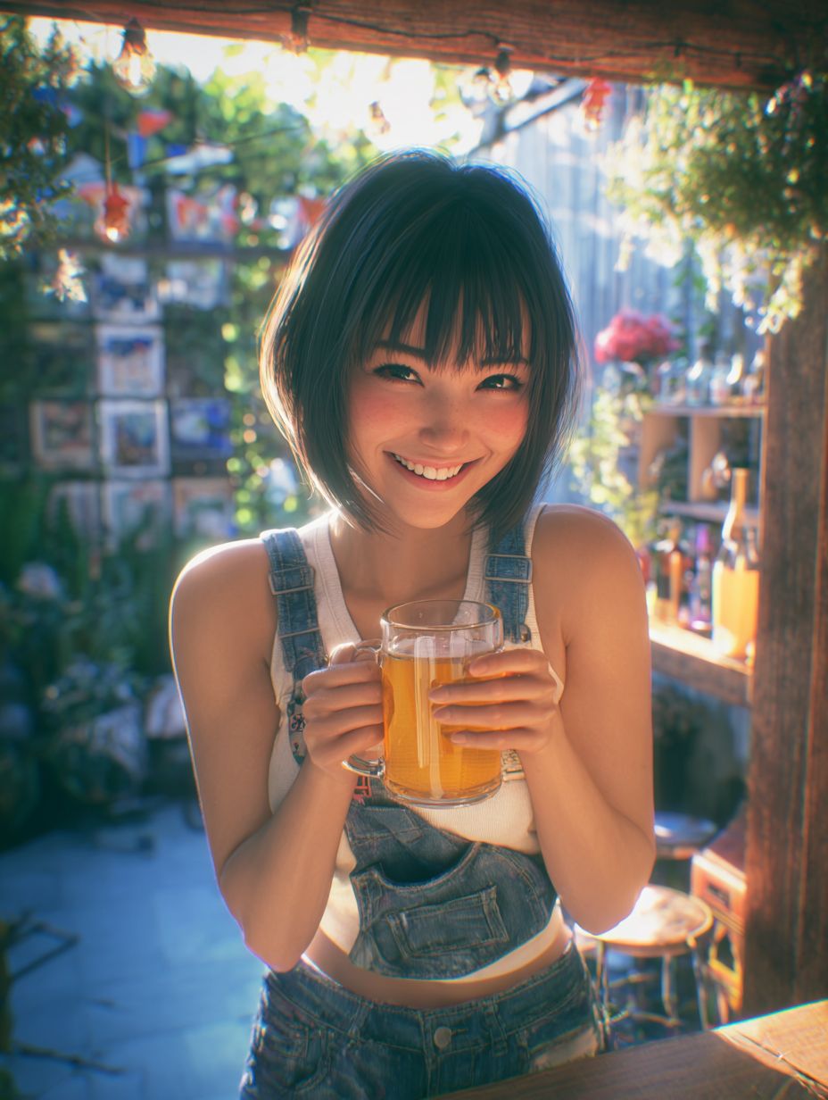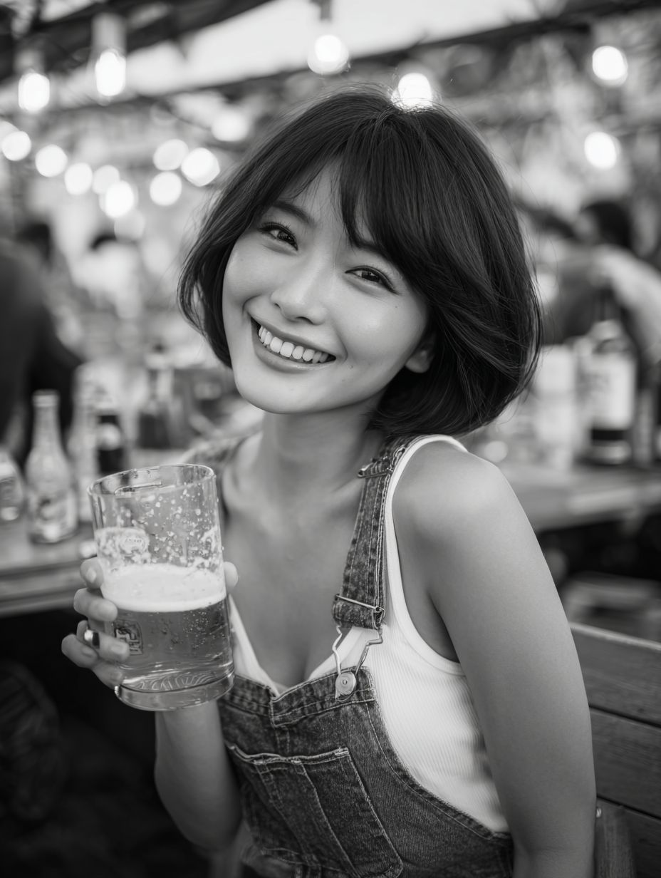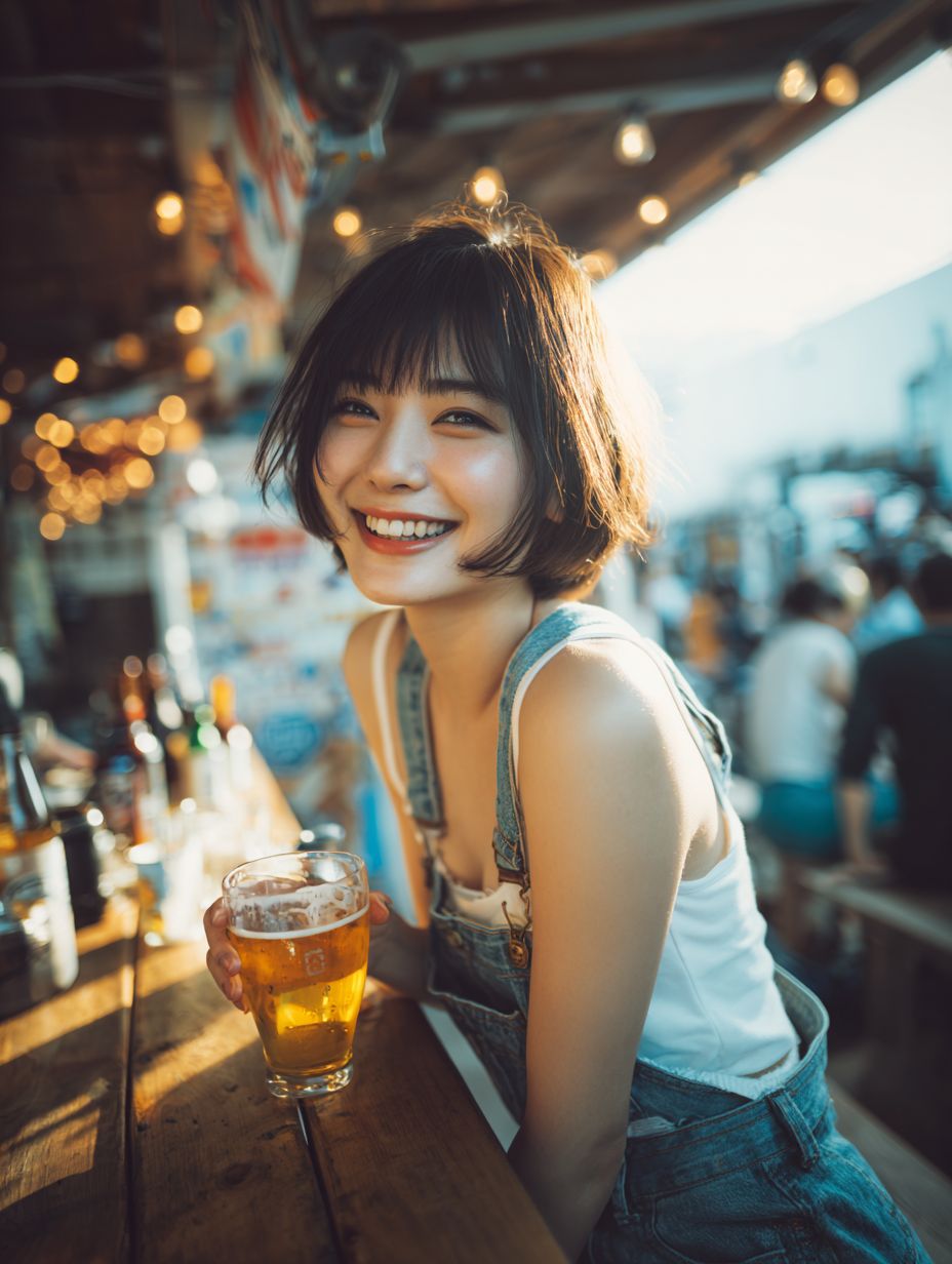 A high-quality photo of an adorable Japanese woman with a bob haircut, wearing a white tank top and a denim overall skirt, sipping a beer at a cozy outdoor bar. Her cheerful smile is captured with a DSLR camera in vivid detail.