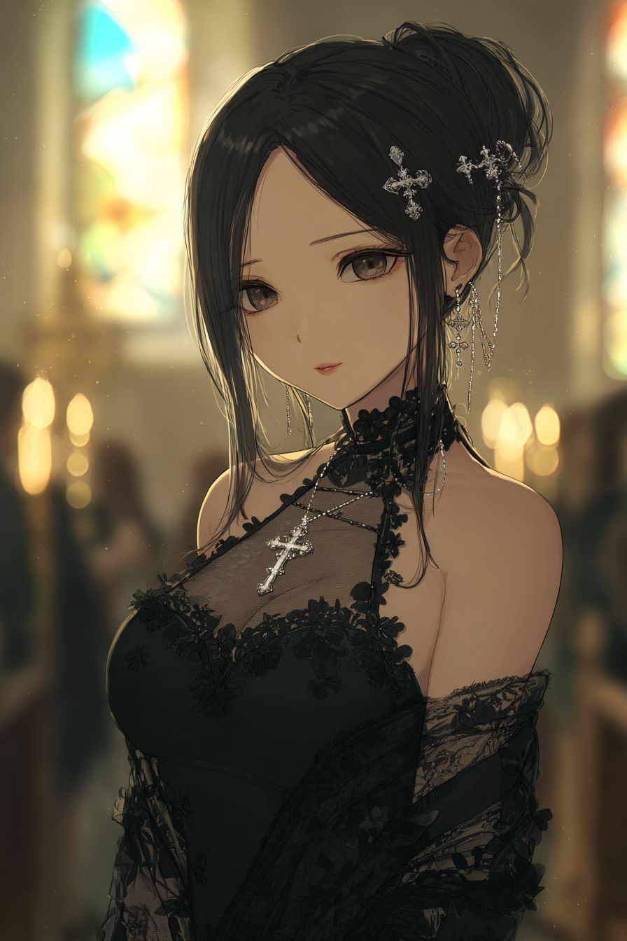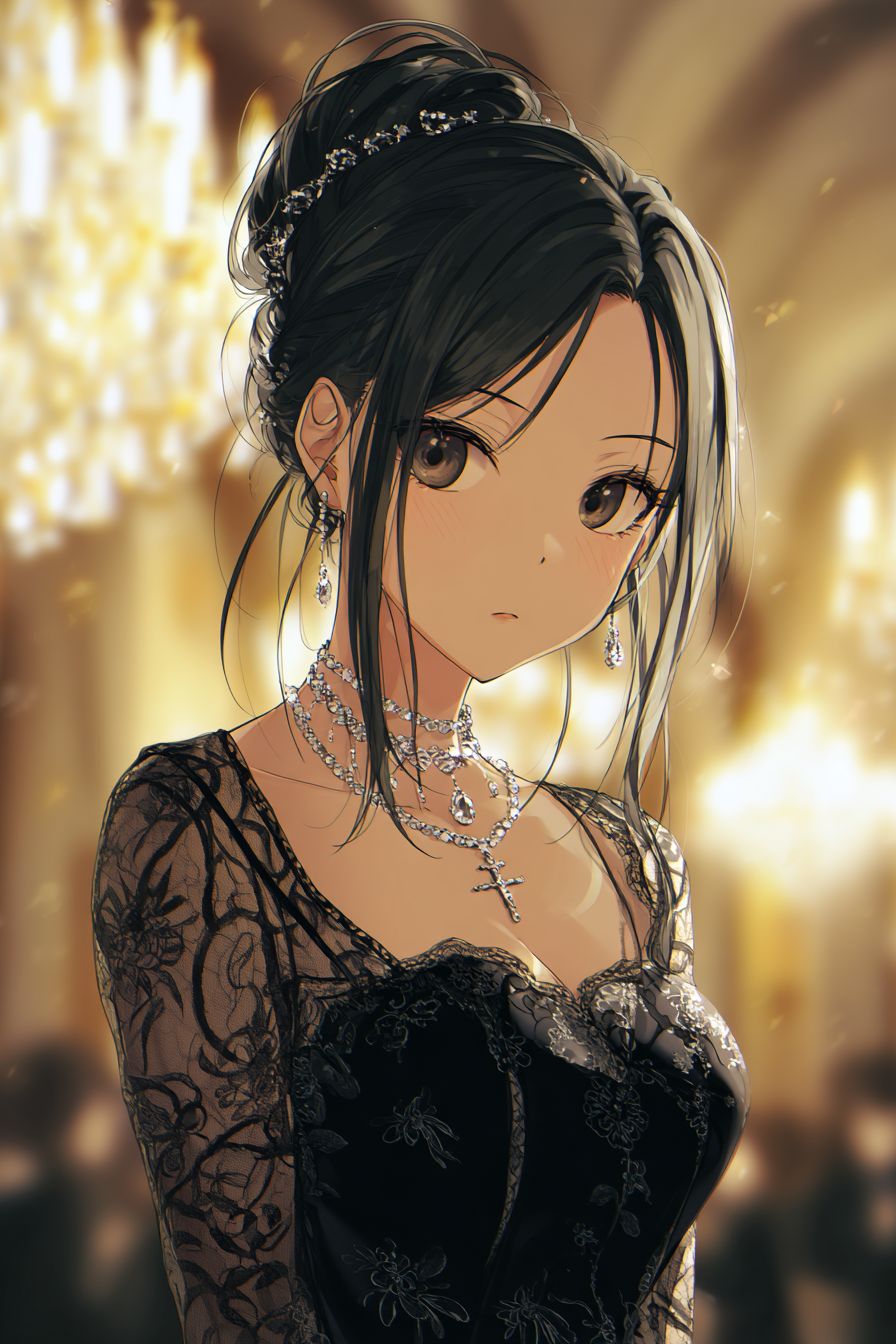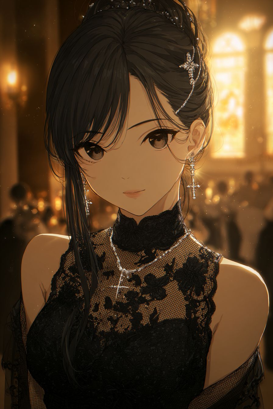An elegant anime girl with long sleek black hair styled in an updo with silver hairpins, warm brown eyes, wearing a black lace dress with floral embroidery and a sheer shawl, delicate silver cross necklace, softly glowing in a candlelit ballroom.