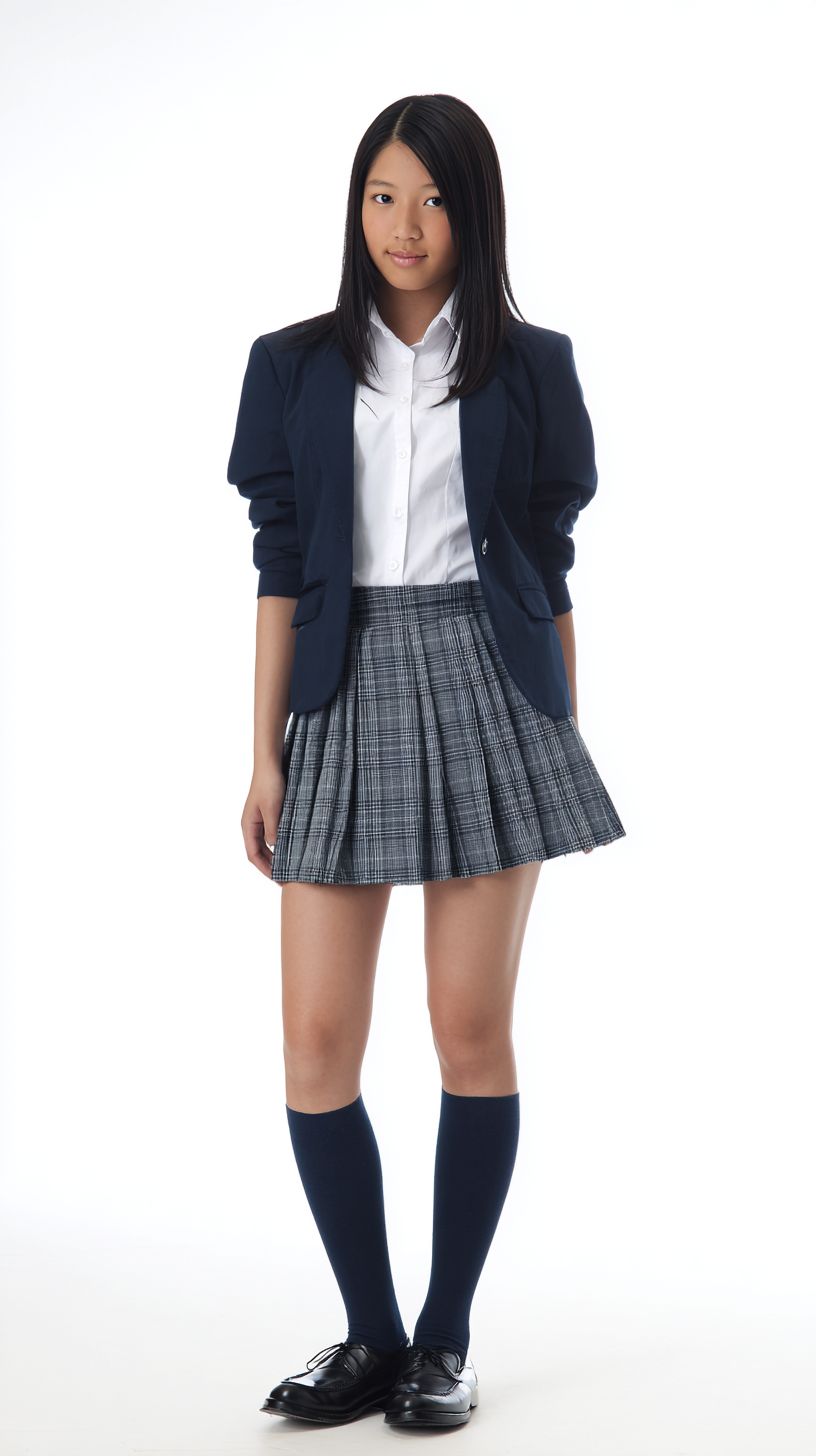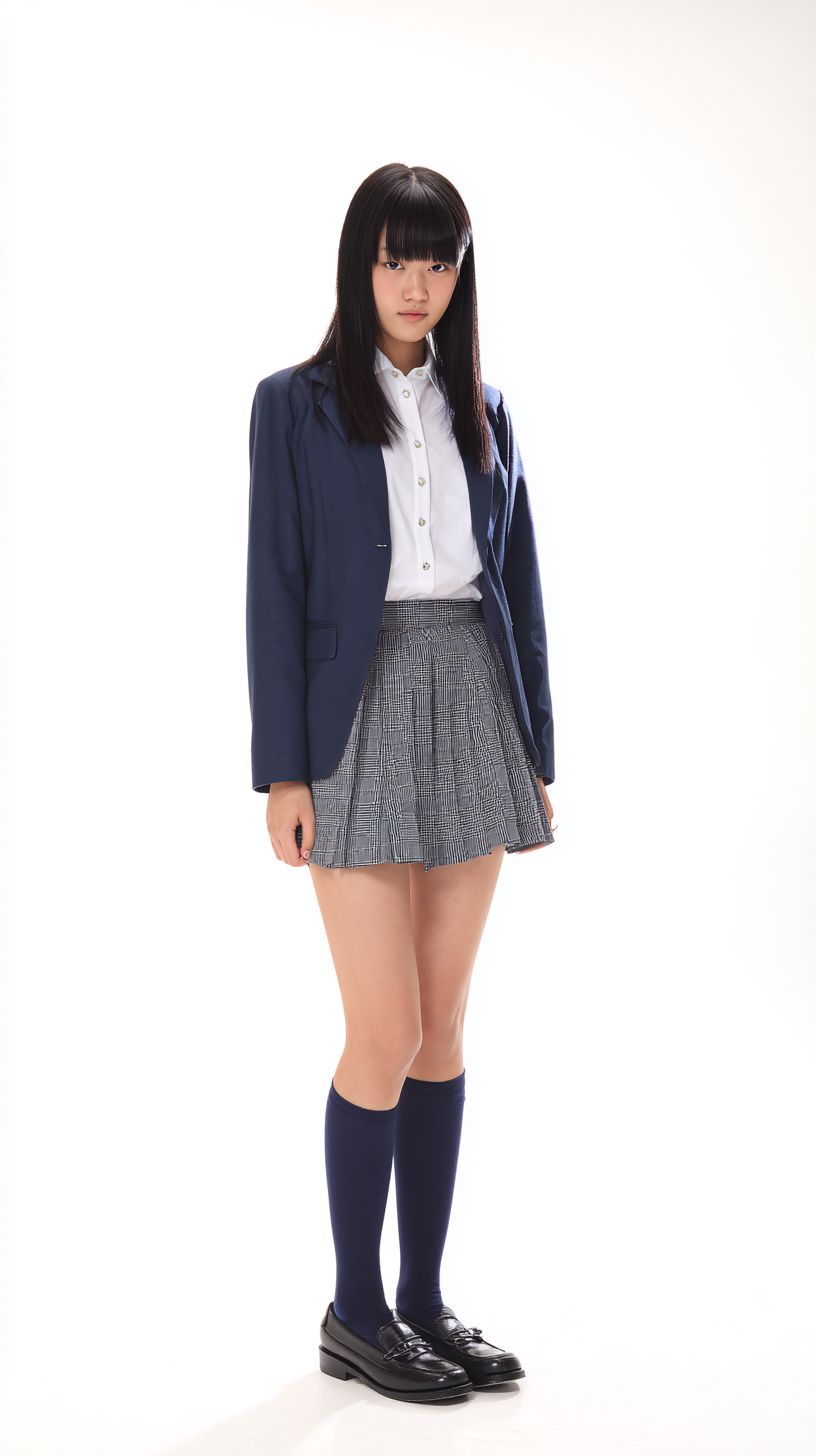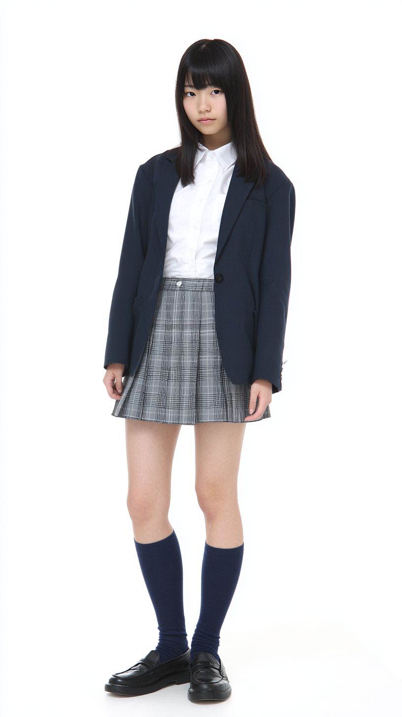A skinny Japanese high school girl in a white blouse (top buttons unbuttoned), short tight-fitting navy blue blazer jacket, short gray plaid miniskirt (high hem), navy blue ankle socks, and black loafers. She has black straight hair and is standing in a full-body front view. Pure white background, professional lighting, photorealistic.