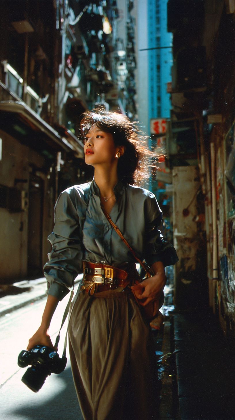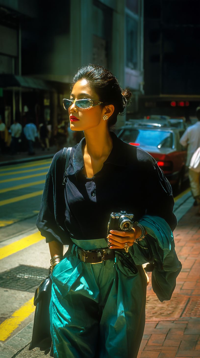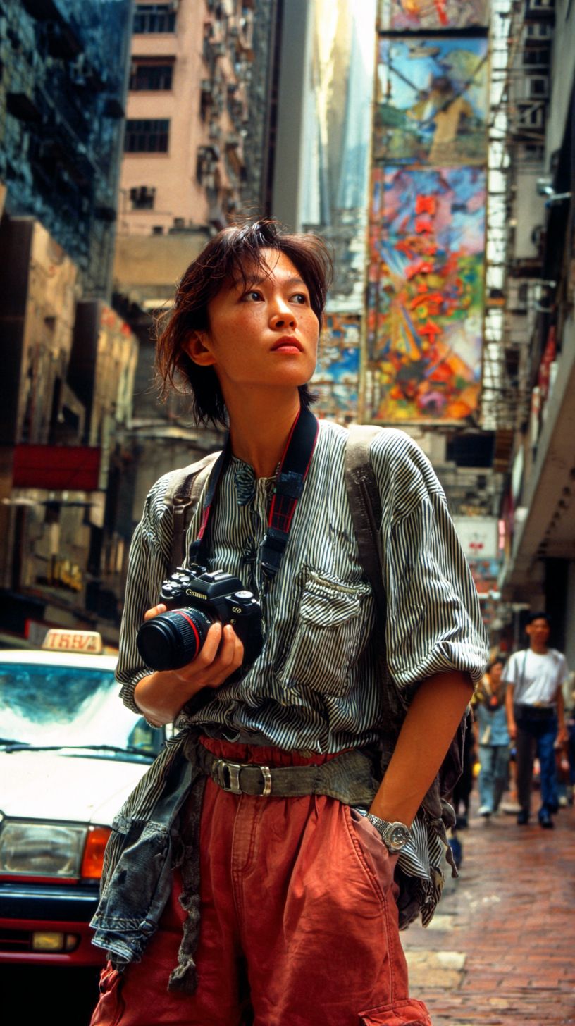 Model photographed by Canon camera on the street in Hong Kong in the 1990s. Medium distance. The person is wearing a belt.