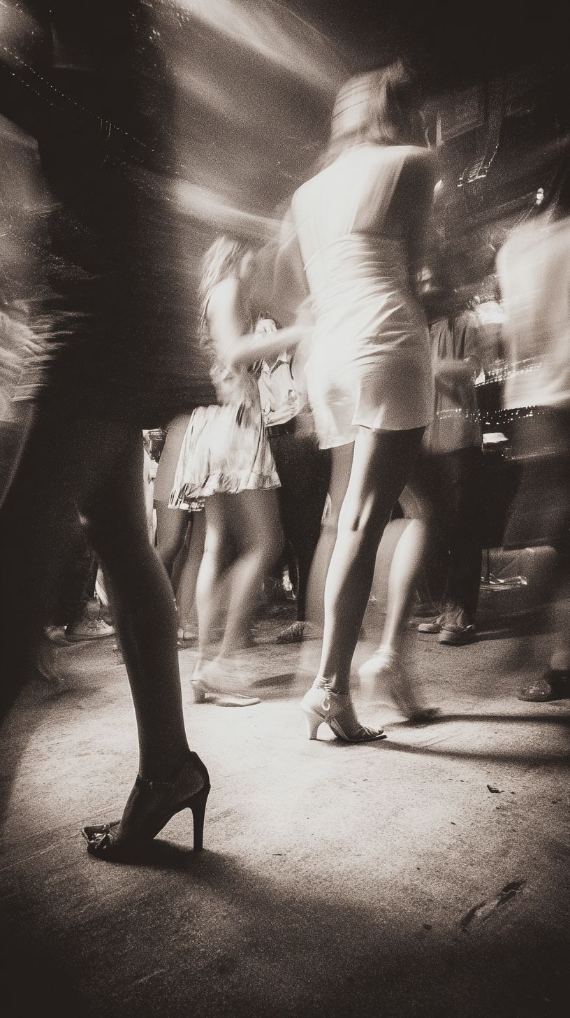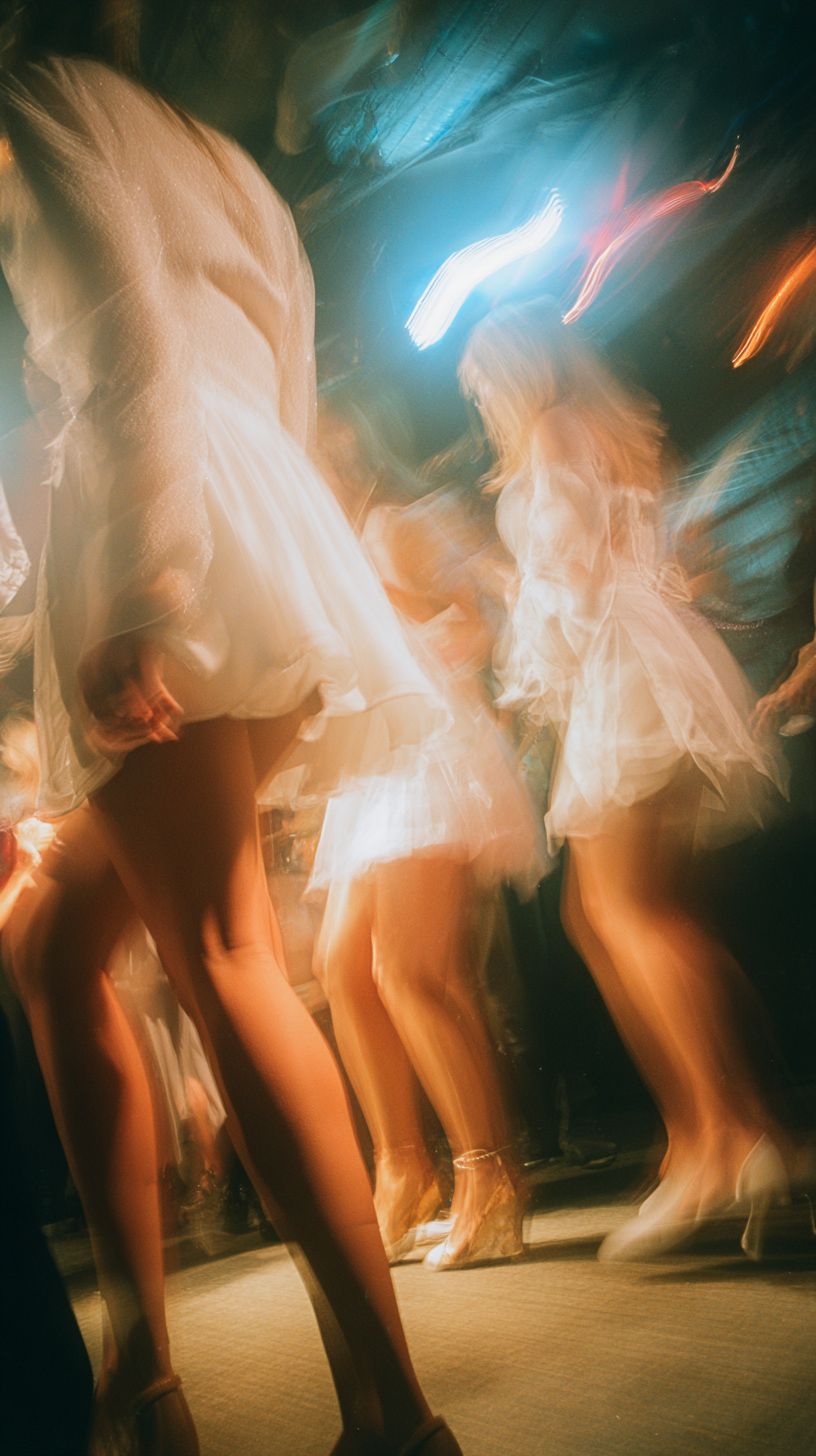 A blurry slow shutter photograph of people dancing at an underground party in 2020, wearing short white dresses and high heels, taken with flash photography, grainy, in the style of Martin Parr, with long legs.