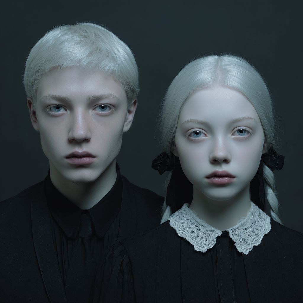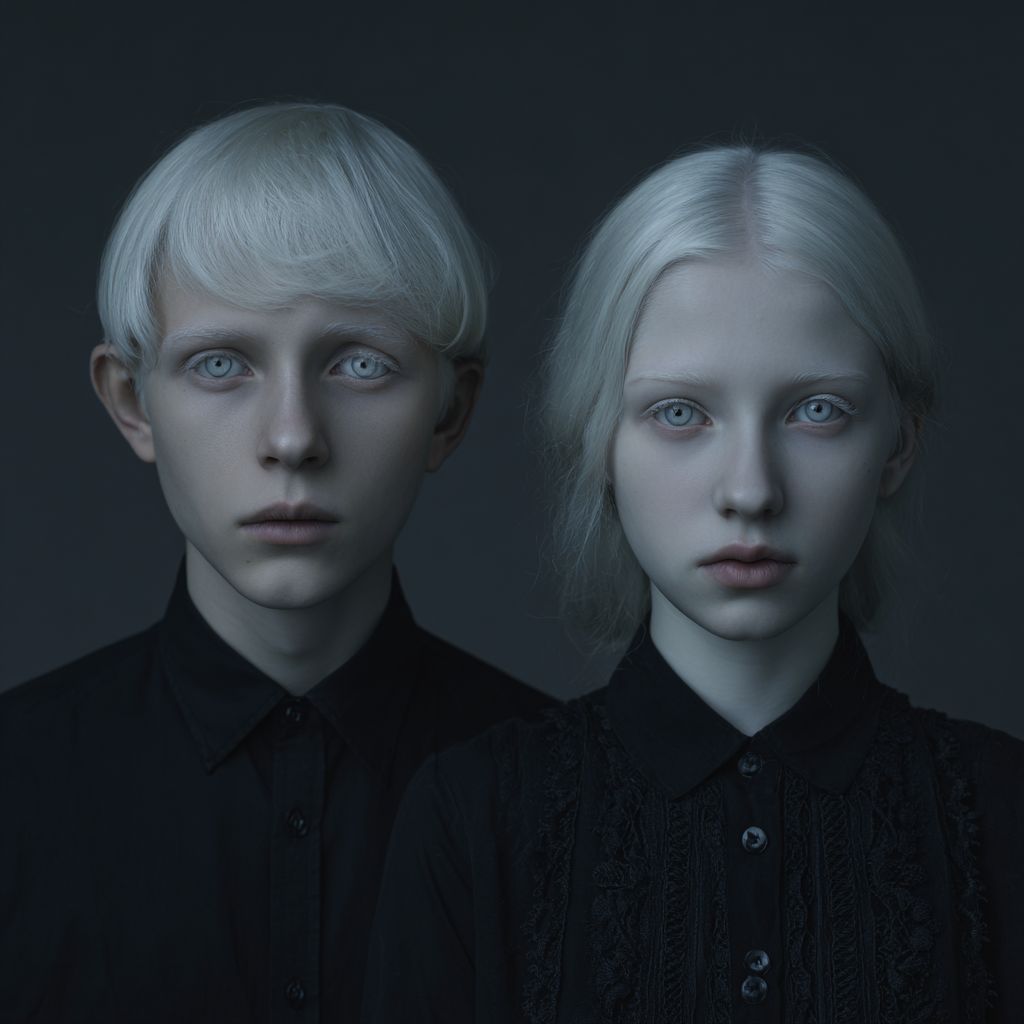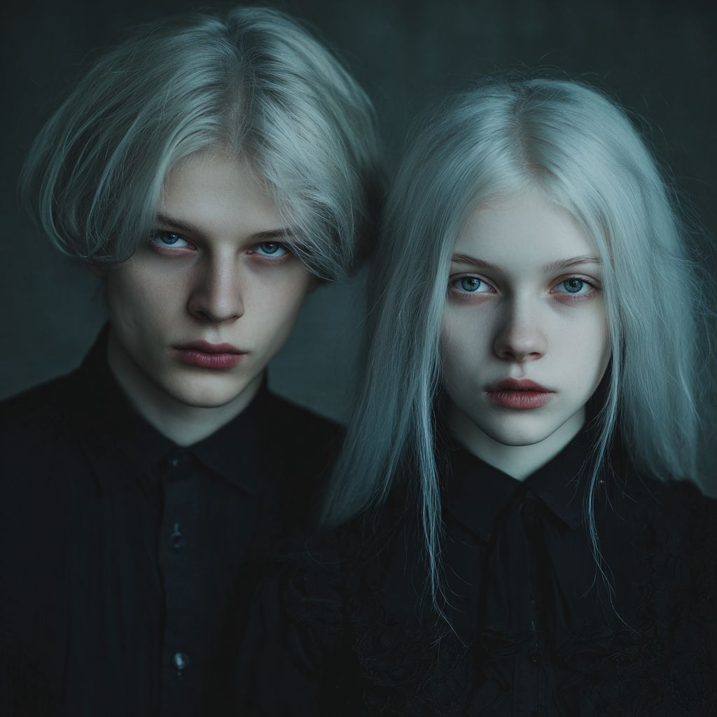 Eerie twins, a boy and girl with very pale skin, light hair and colorless eyes, thin frames, aged 18-20.