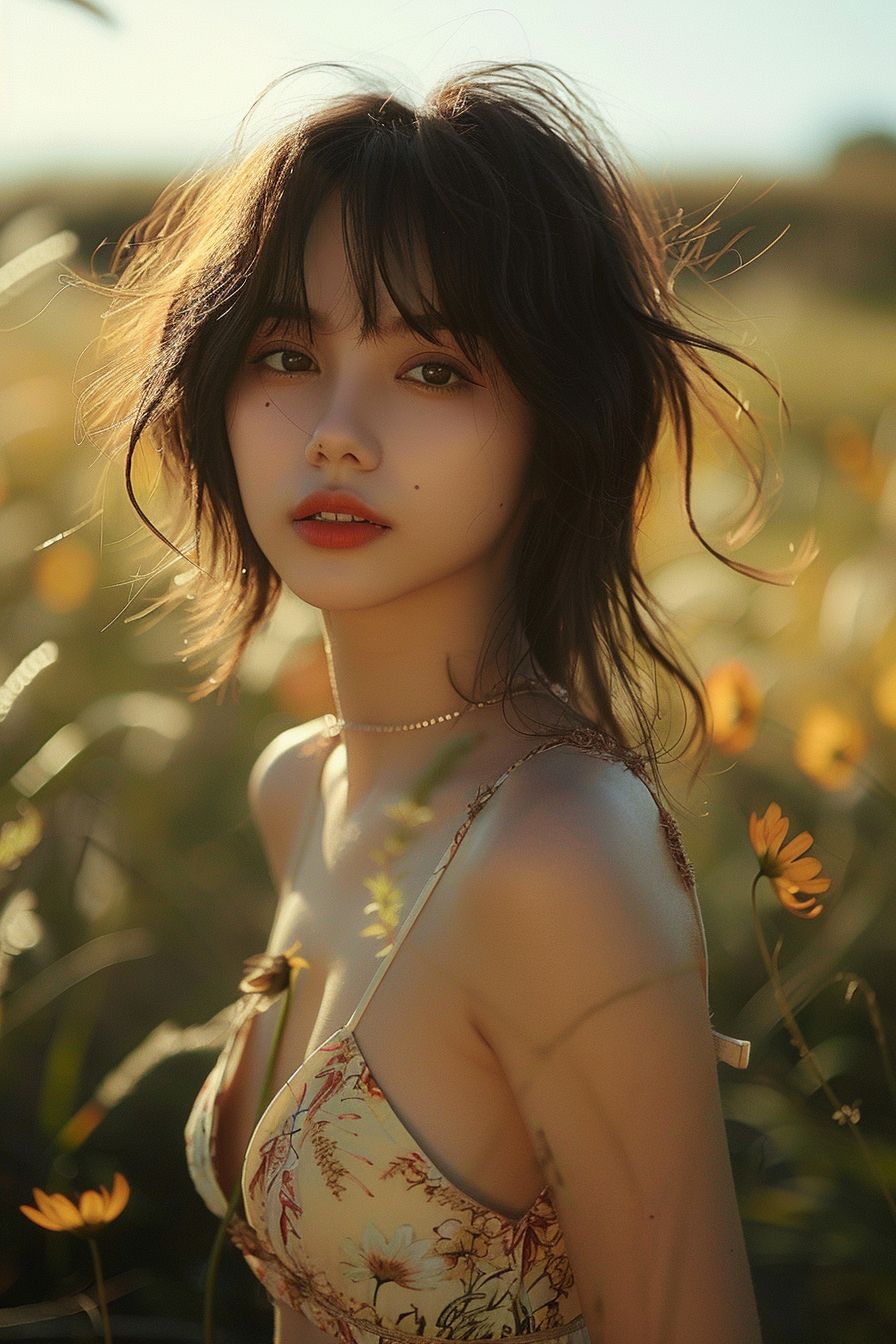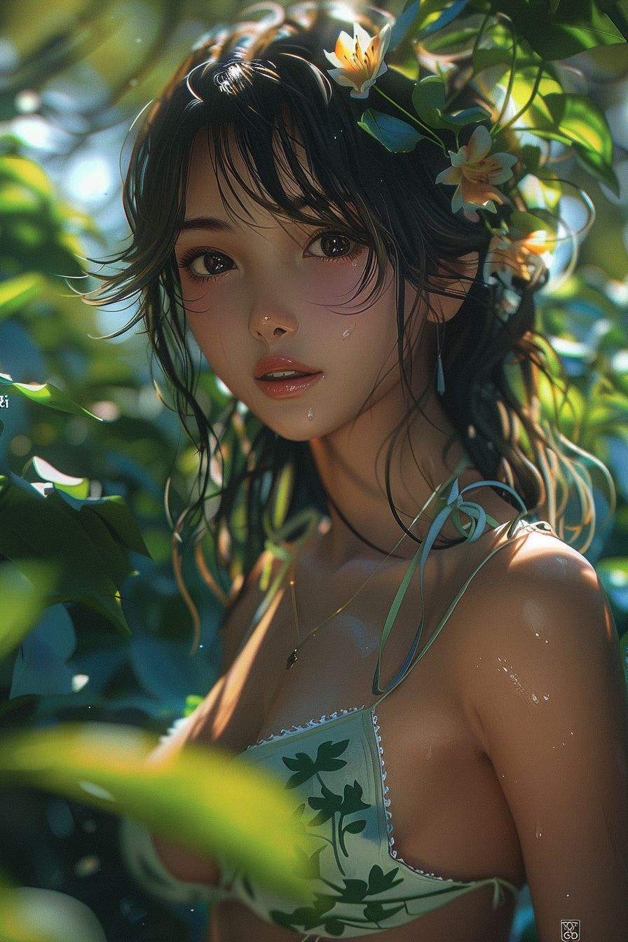 A 22-year-old plump Chinese girl with outstanding hair, appearance resembling Nico Robin from One Piece, anime style, a balanced photograph, a bright sunny day, the sun contrasts on the body, surprising, 8k