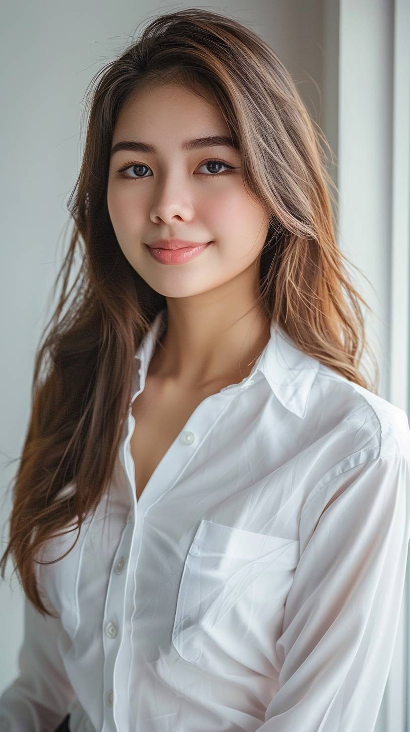 In the photography studio, a Thai Asian girl is in the presentation wearing a business look with a white shirt and a smiling face.