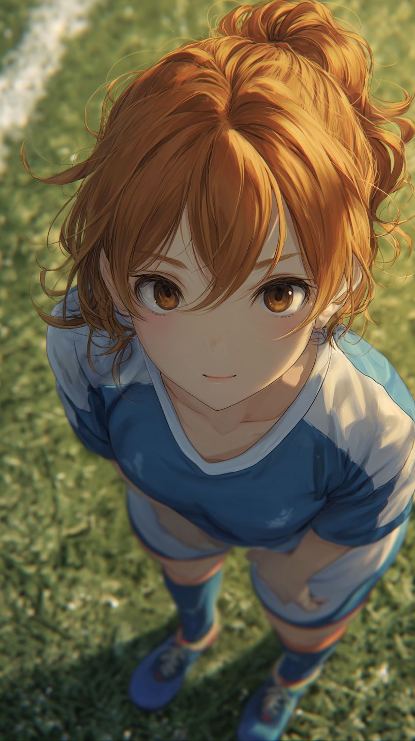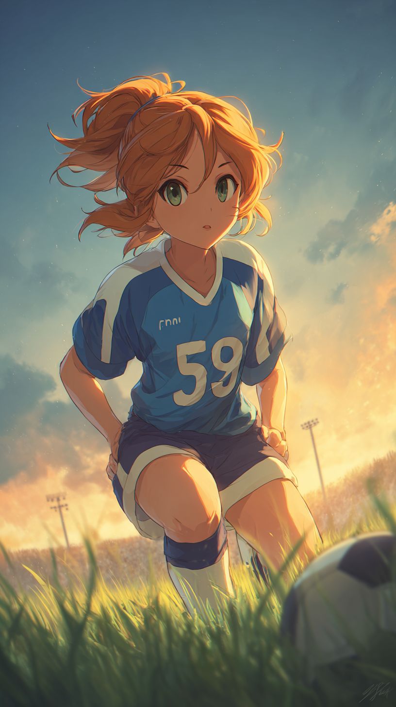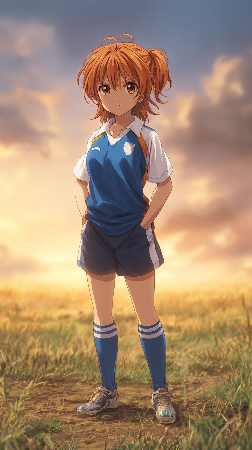 شخصية أنمي أنثوية رياضية في ملعب كرة القدم ترتدي قميصًا أزرق وأبيض وشورتات وحذاء رياضي. شعرها القصير البرتقالي الناري مربوط إلى الوراء، وعيناه البنيتان مليئتان بالتركيز. إضاءة غروب الشمس، نسيج العشب الديناميكي، تظليل واضح.