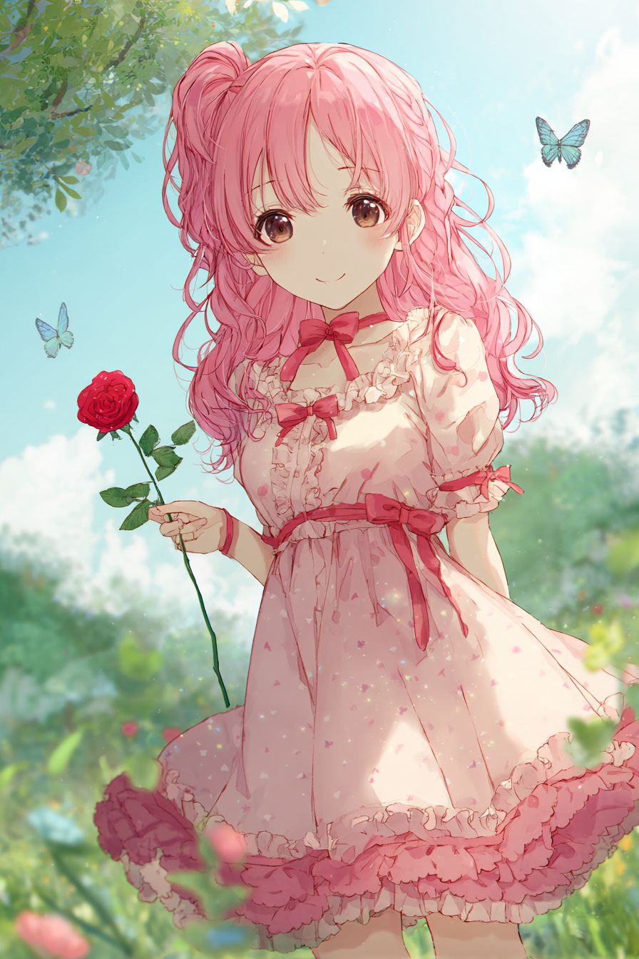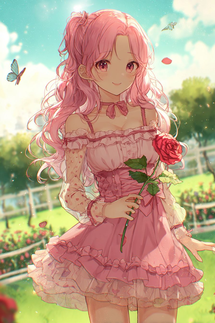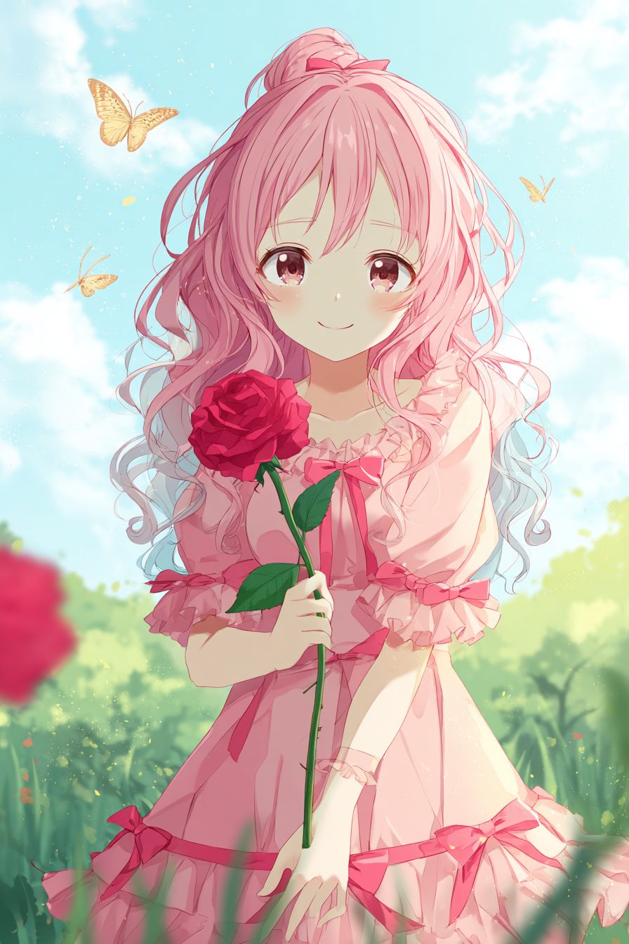 فتاة أنمي ساحرة ذات شعر وردي ناعم ينساب في أمواج، ترتدي فستانًا ورديًا مزينًا بالدانتيل، تحمل وردة حمراء واحدة، في أجواء مشرقة ومبهجة مع حديقة مشمسة وتفاصيل الفراشات.