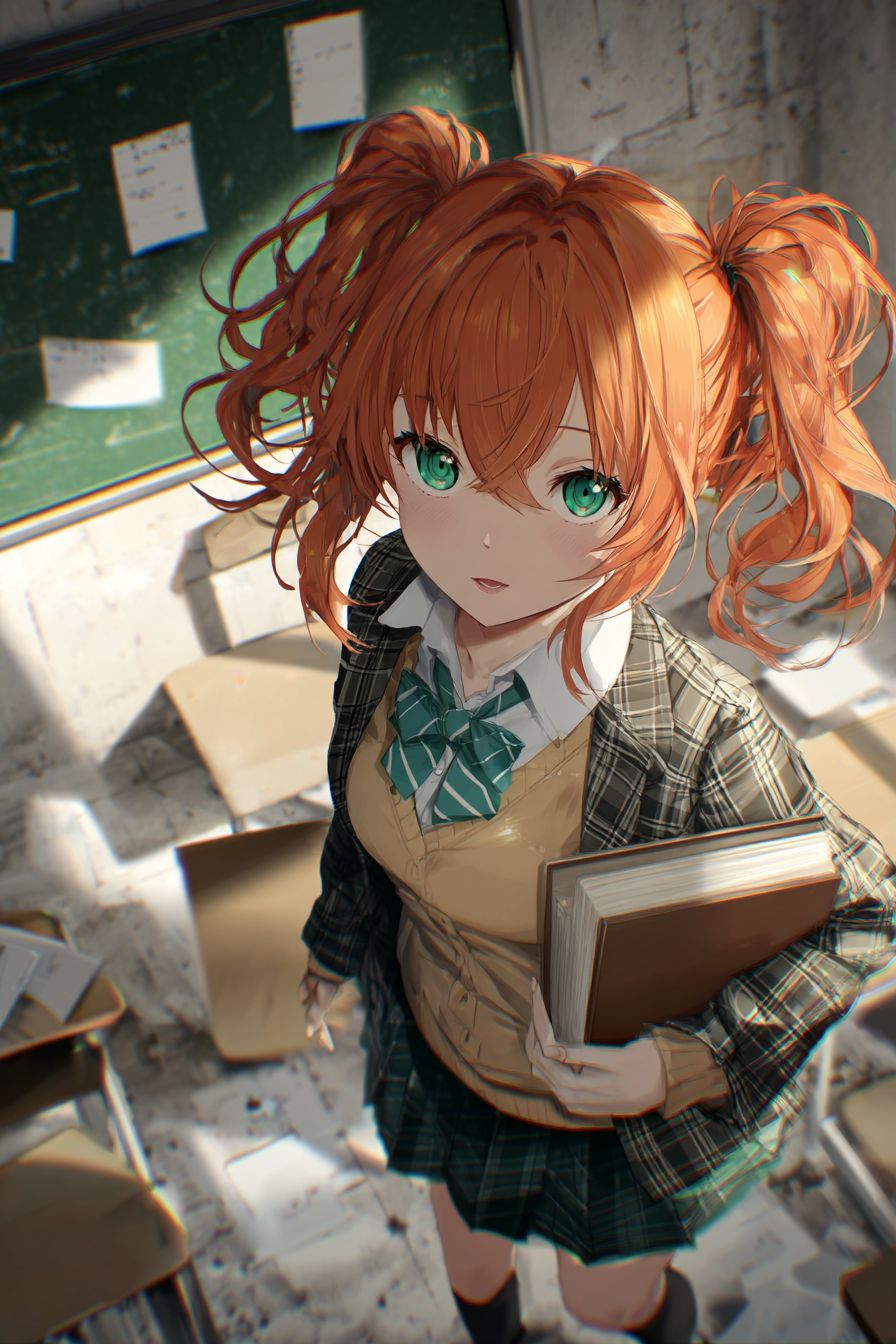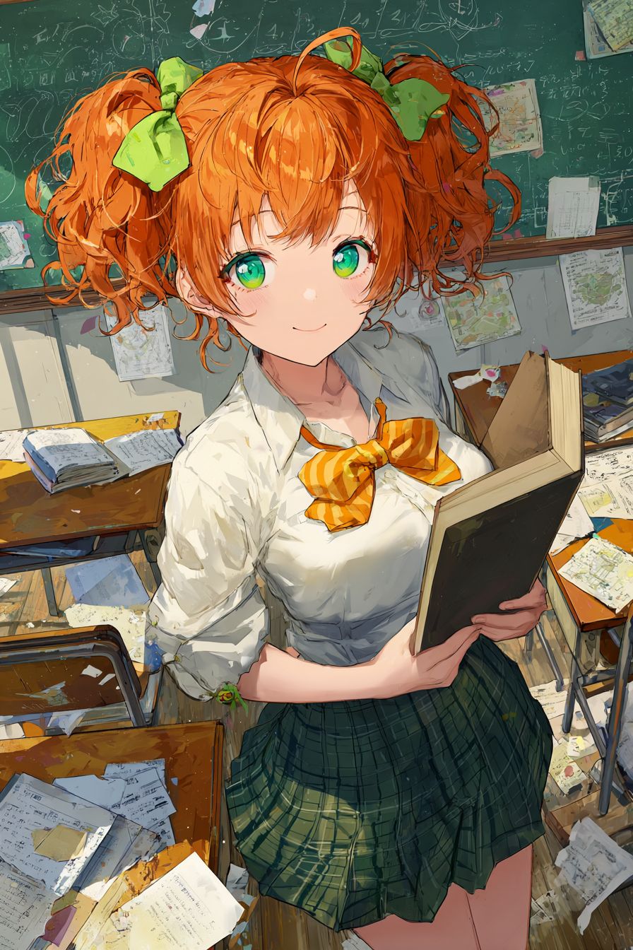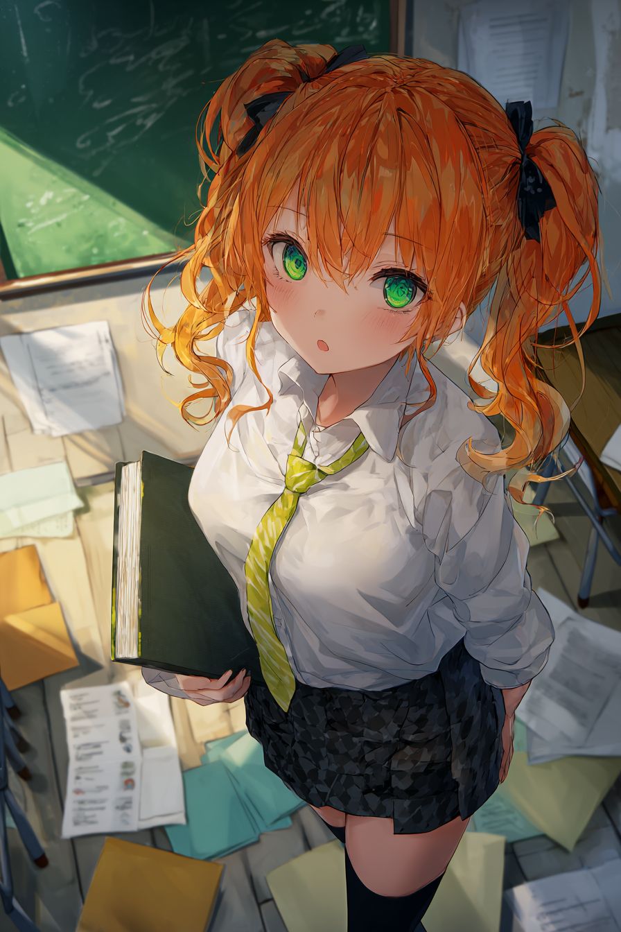 فتاة أنمي مرحة ذو ذيلين وشعر برتقالي لامع، عيون خضراء ماكرة، ترتدي زي المدرسة مع ربطة عنق مفككة، تحمل كتابًا سميكًا، إعداد للفصل مع سبورات وأوراق متناثرة.
