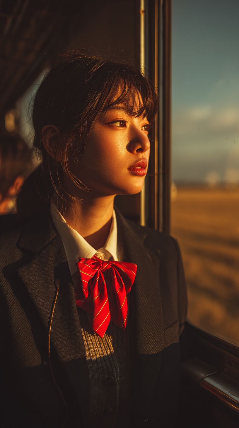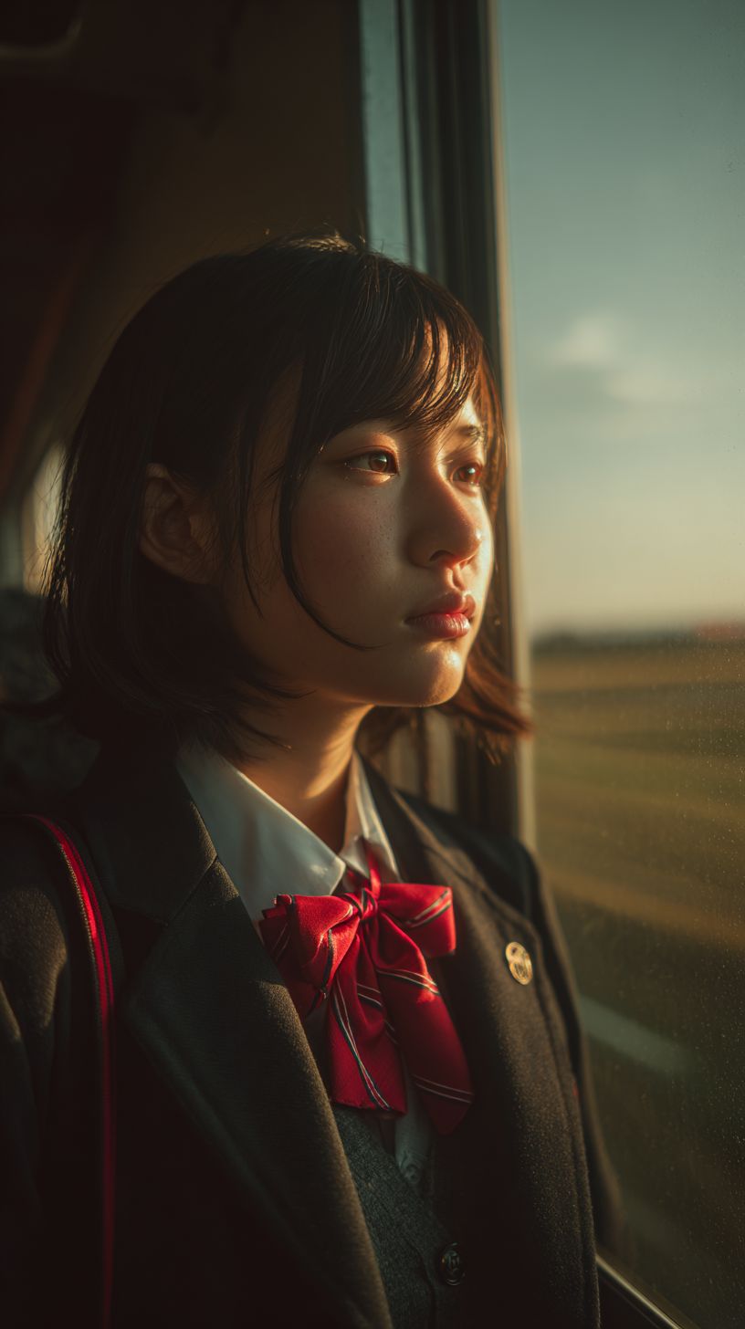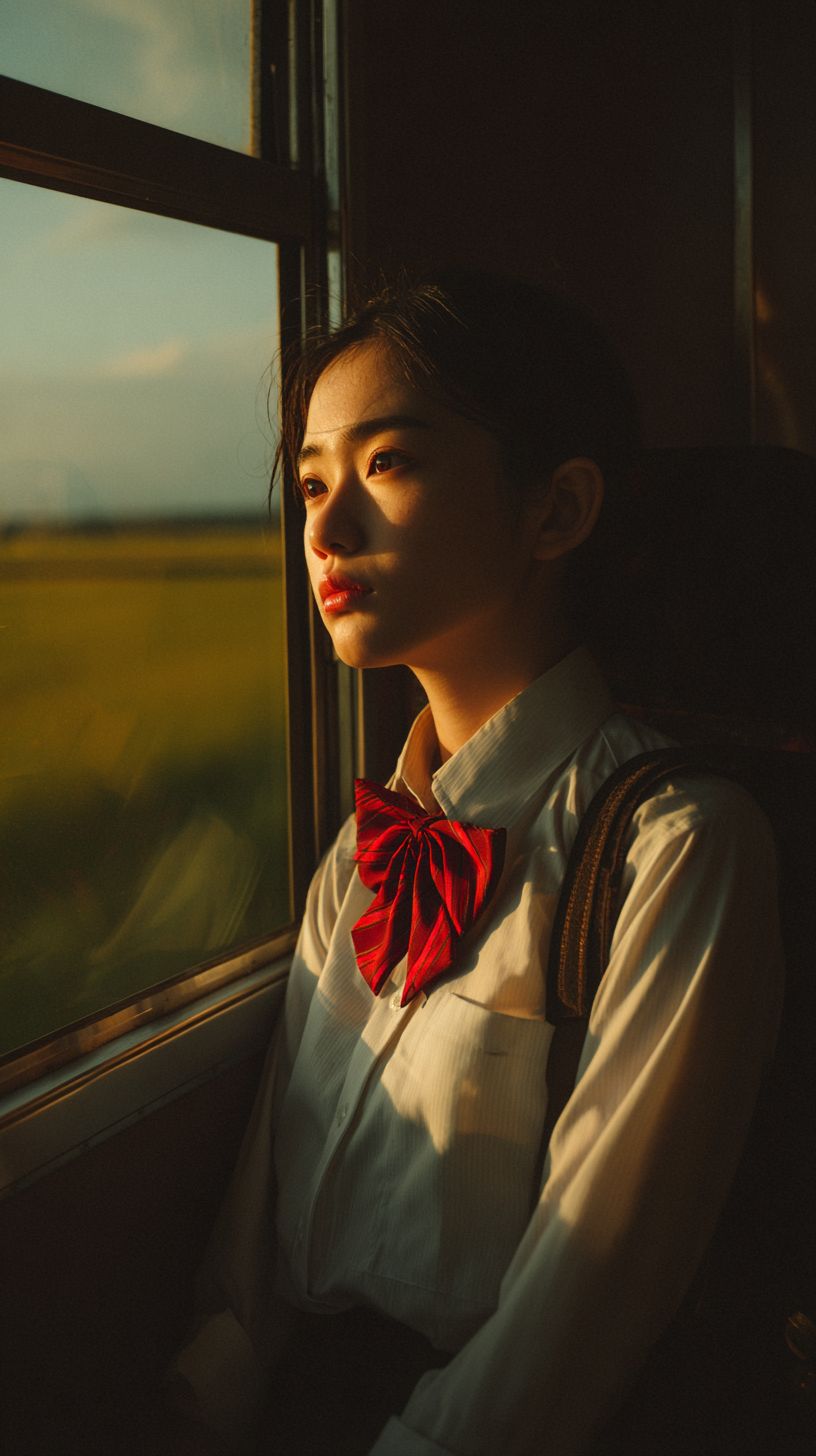 Eine elegante japanische Studentin in einer Uniform mit rotem Krawattenbindefältchen blickt während der goldenen Stunde aus dem Zugfenster, während sie durch ländliche Felder fährt, ein Gefühl der Sehnsucht erzeugend, mit hohem ISO-Filmkorn und niedrigem Kontrast, die eine markante, geschichtenähnliche Atmosphäre schaffen.