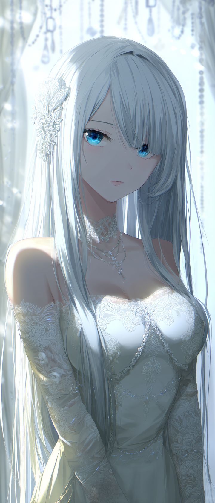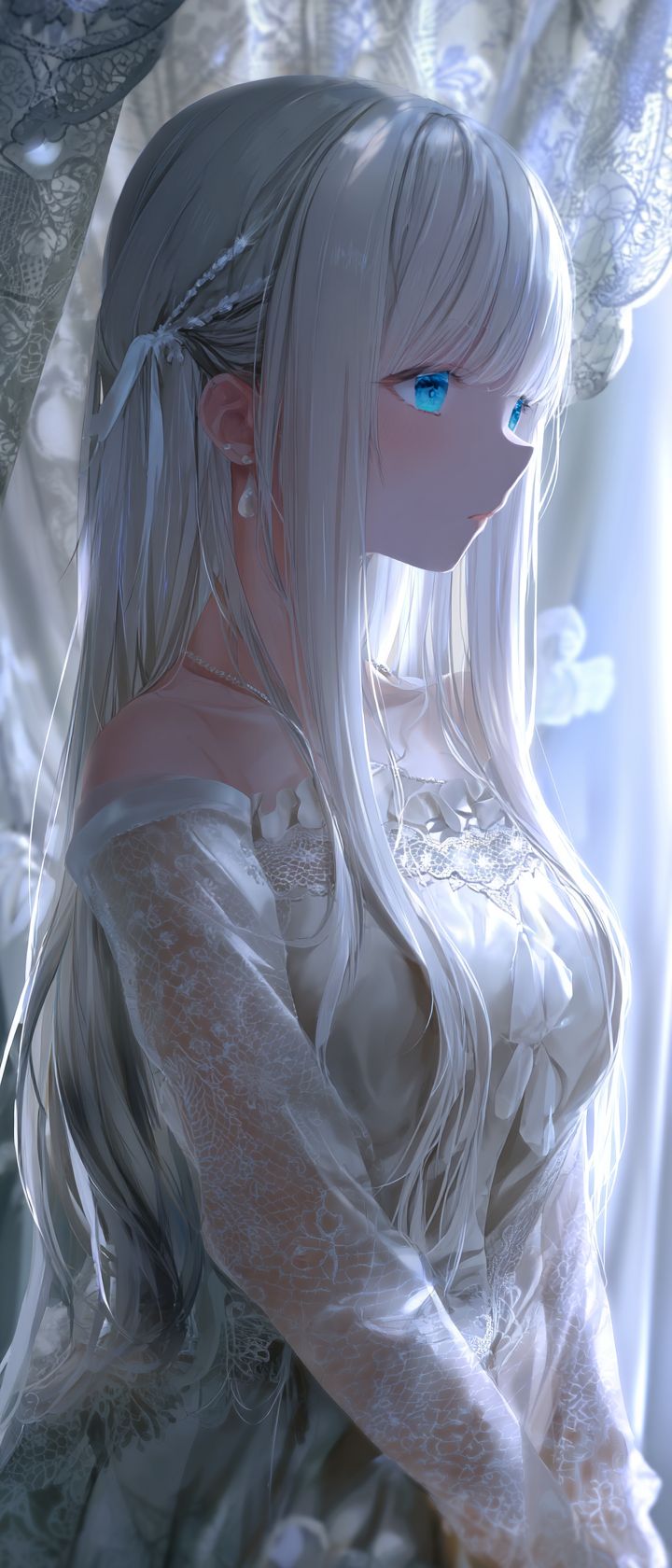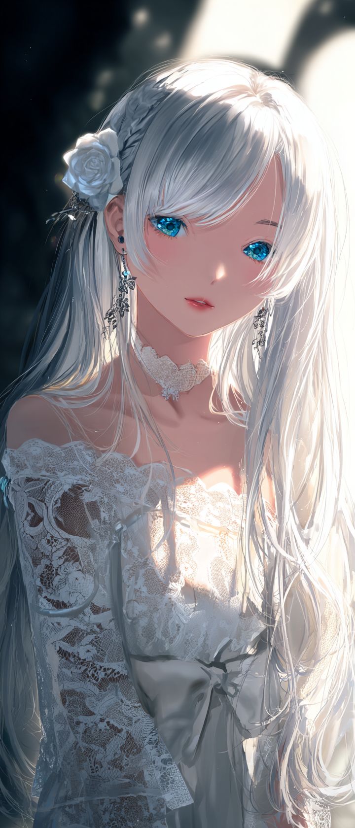Ein schönes Anime-Mädchen mit langen silbernen Haaren und blauen Augen, das ein elegantes weißes Kleid mit Spitze trägt, sanftes Licht, detaillierter Hintergrund.