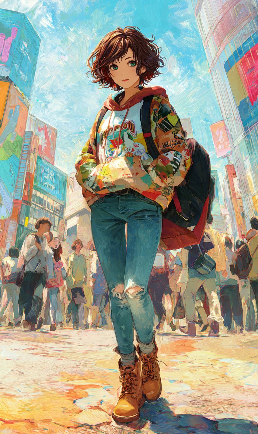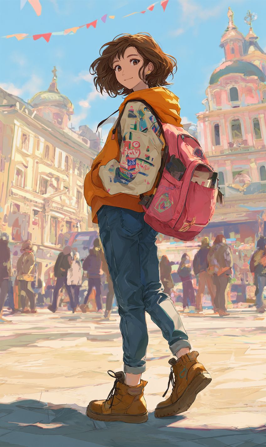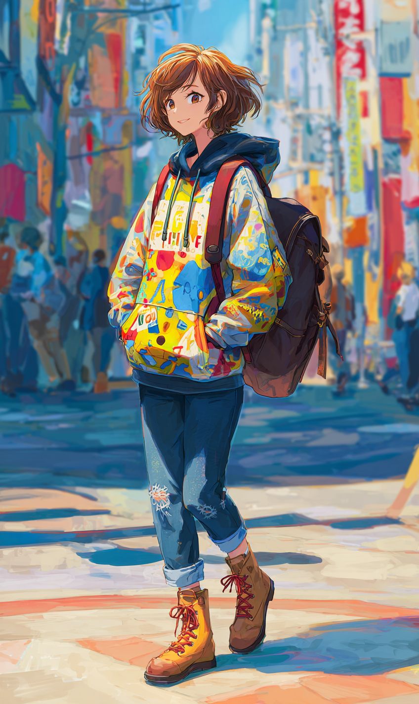 Un divertido adolescente de anime con cabello corto y ondulado y una mochila, vistiendo una sudadera casual con estampados divertidos sobre jeans y botas, caminando en una animada plaza de la ciudad con amigos, colores urbanos vibrantes y una vibra enérgica.