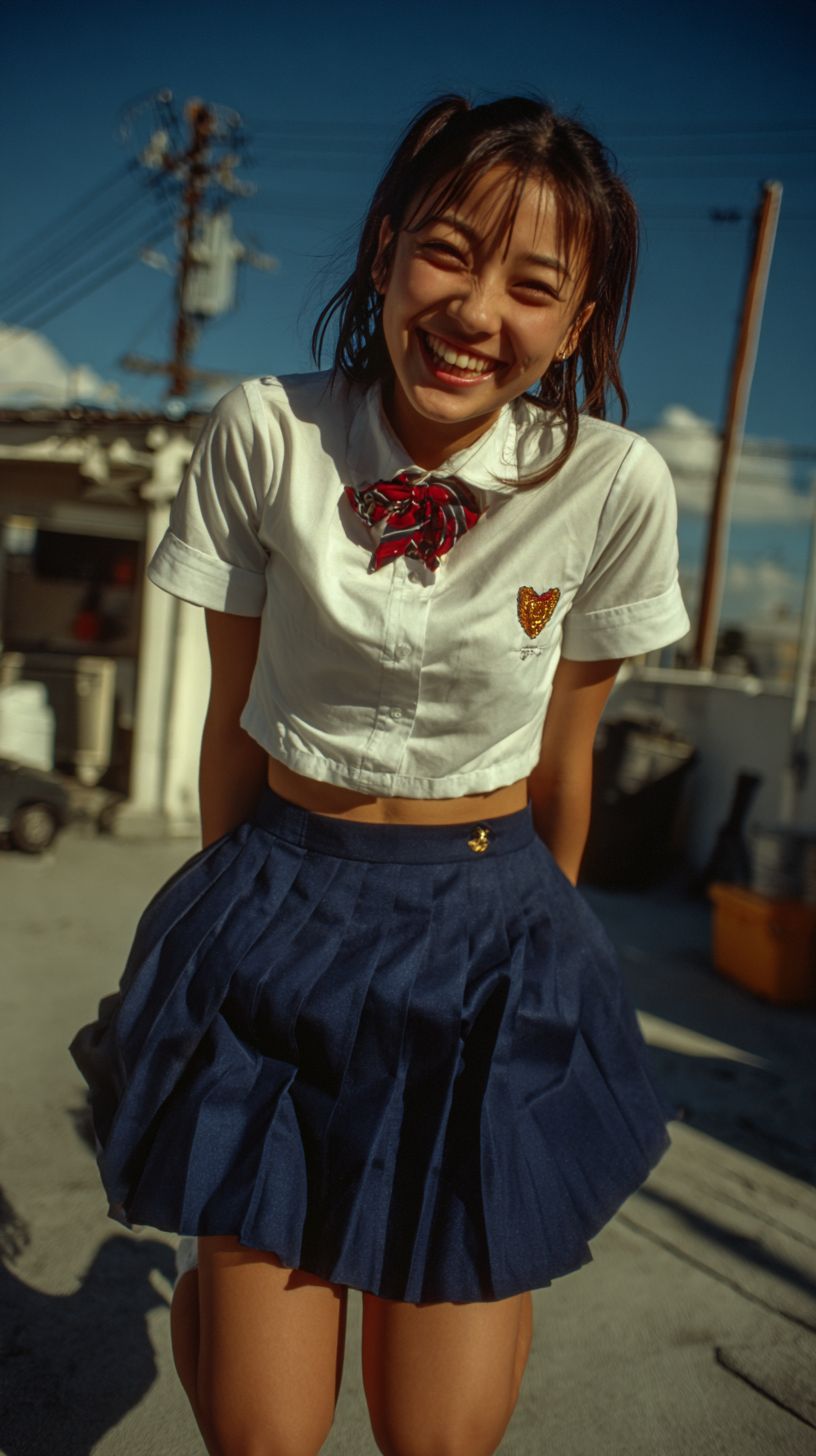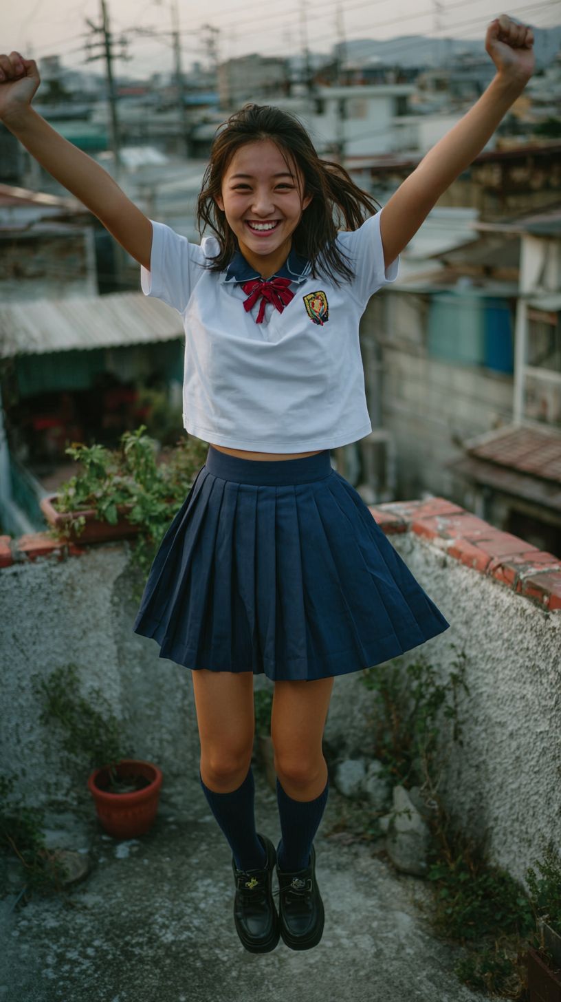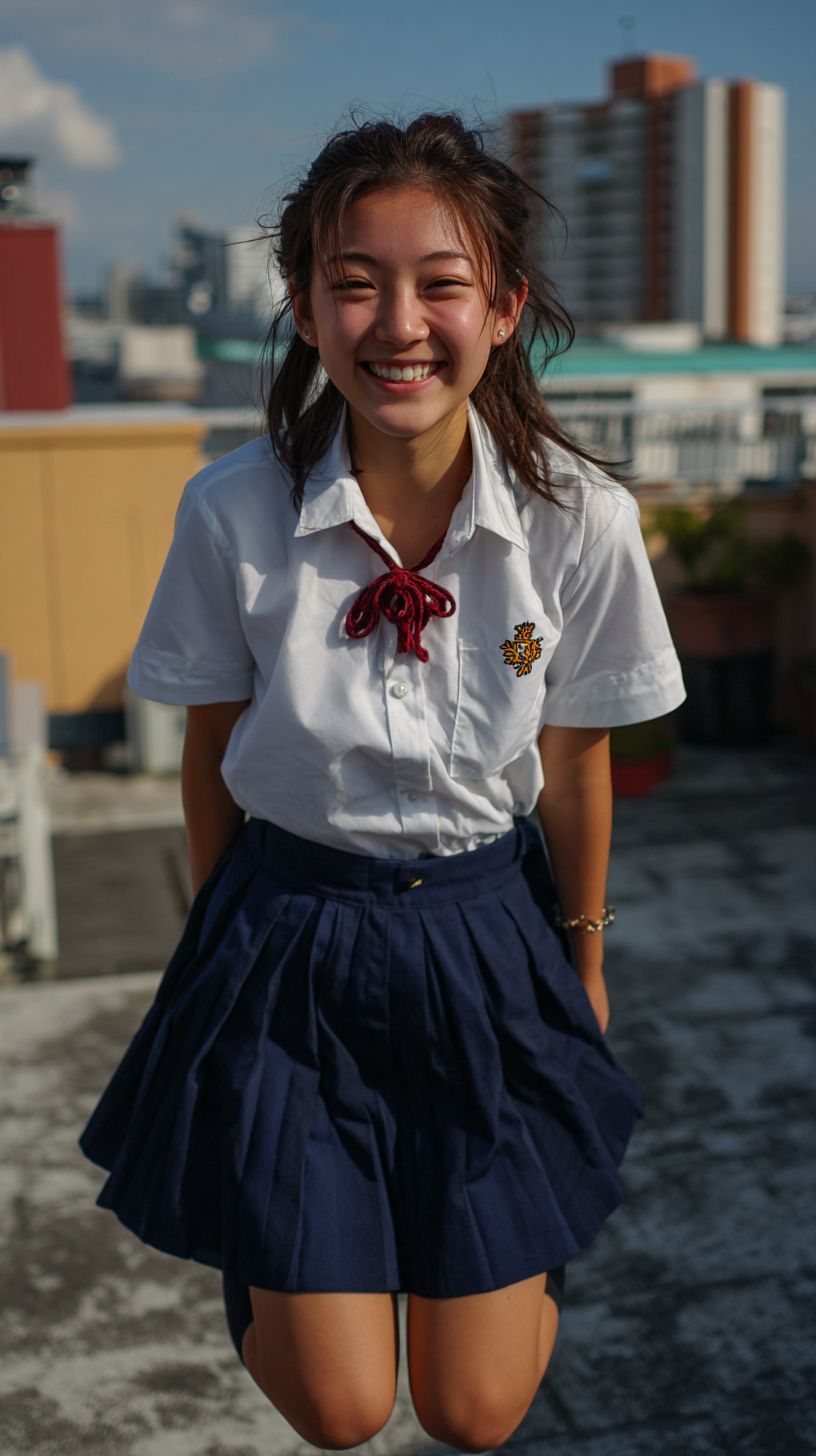 Una fotografía de una niña asiática vestida con un uniforme de secundaria japonés, que consiste en una camisa blanca y una falda de tablas azul marino con una cinta roja en el área del pecho. Ella está saltando felizmente en el último piso de un edificio, con una toma de cuerpo completo y una expresión sonriente contra un fondo de cielo. La imagen fue capturada con una cámara Leica M6 y película Fuji Provia.